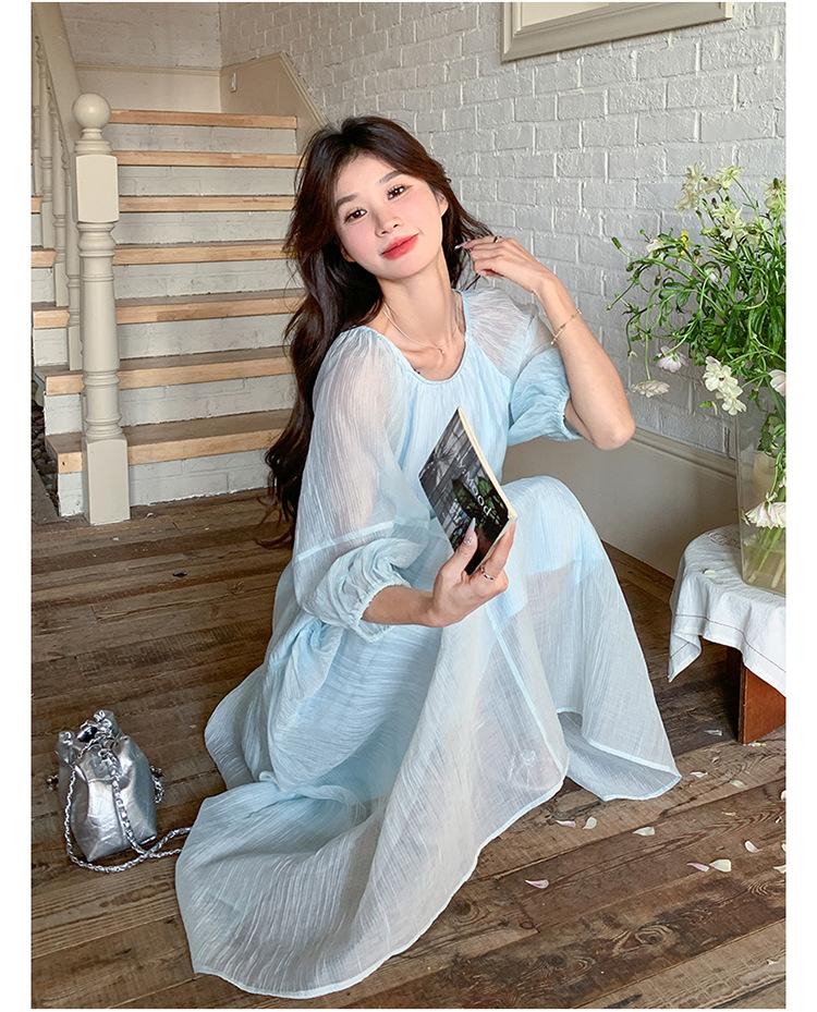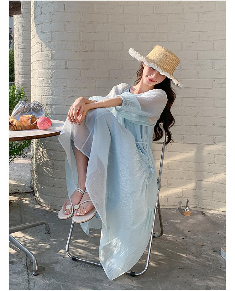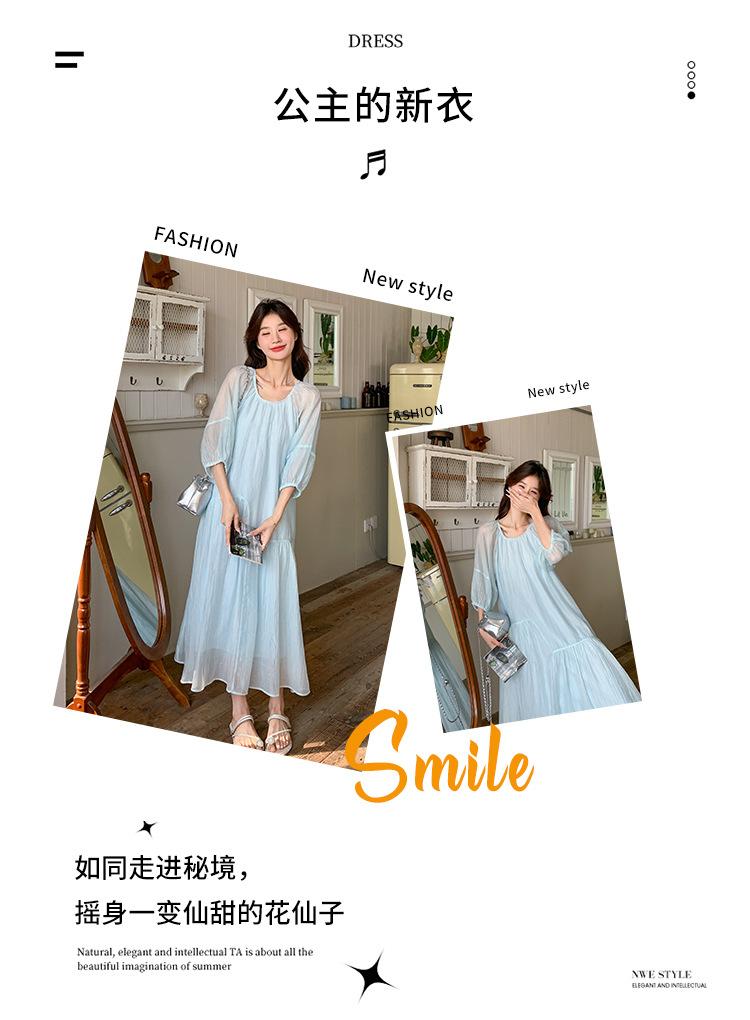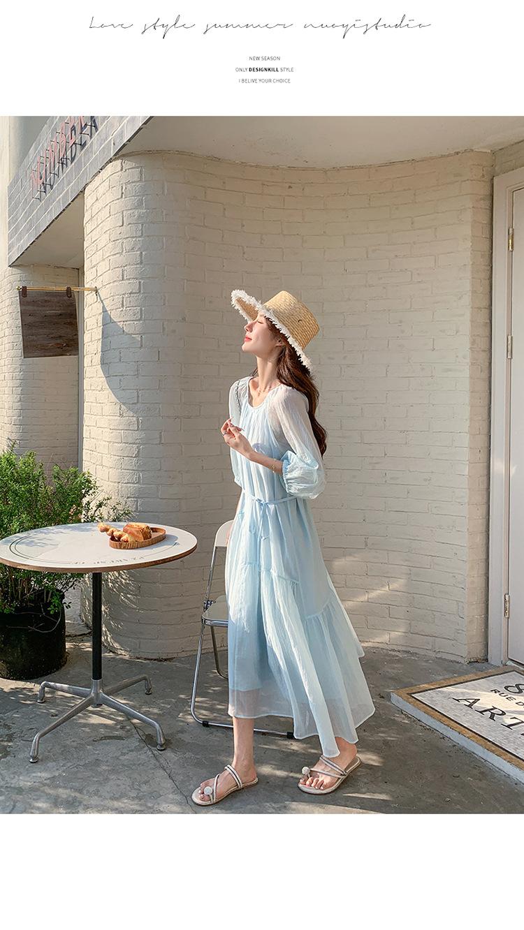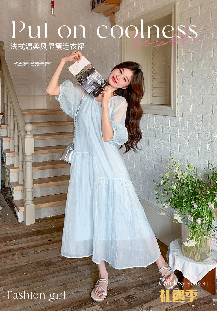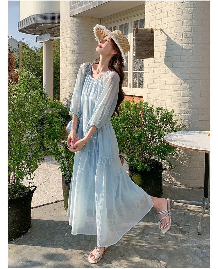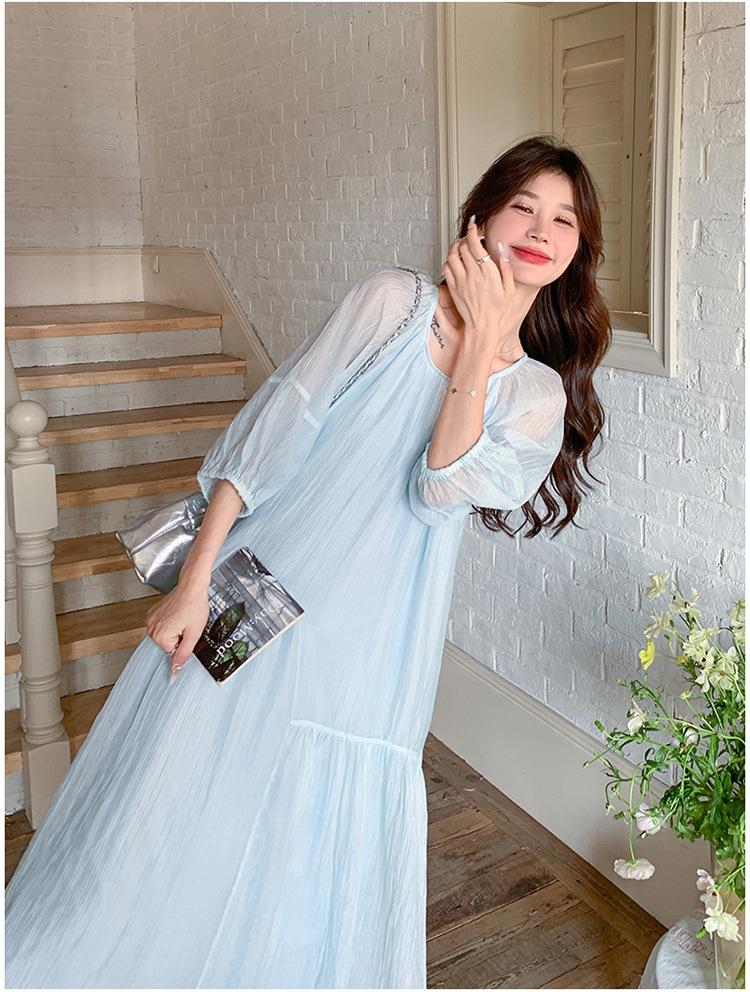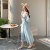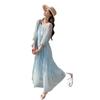 Vestido de Gasa Azul para Mujer 2024 Verano Nuevo Estilo Francés Dulce y Tierno Reductor de Edad Viaje Vacaciones Hermosa Falda Larga