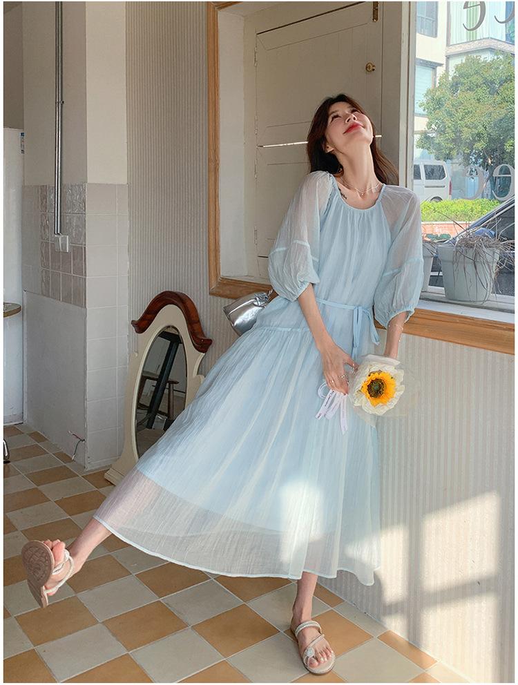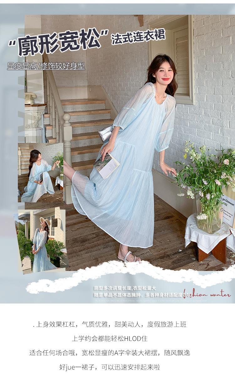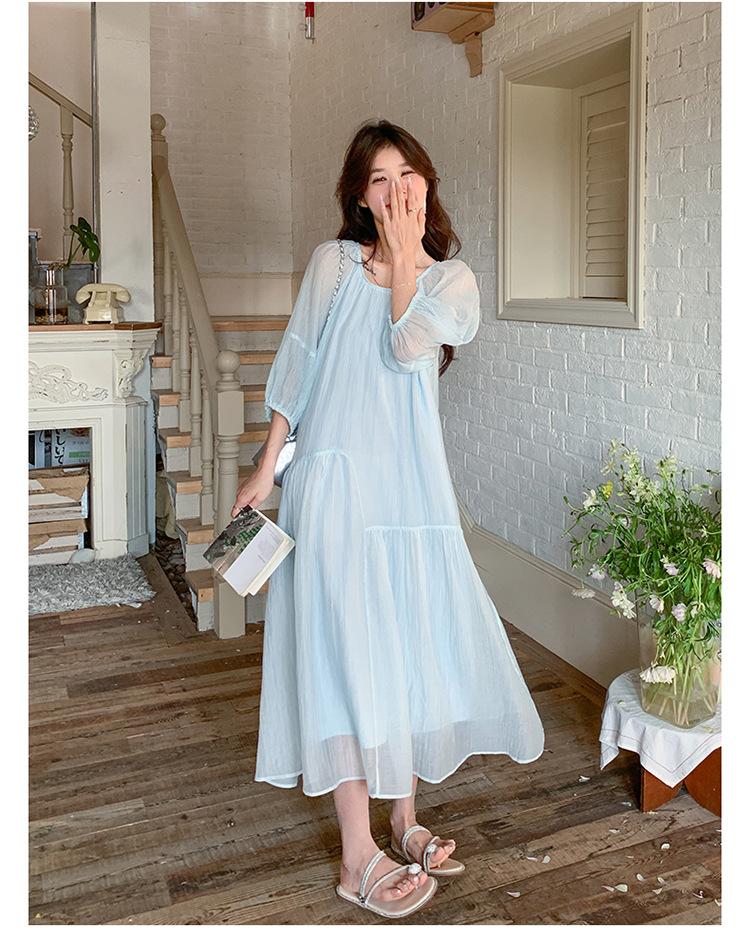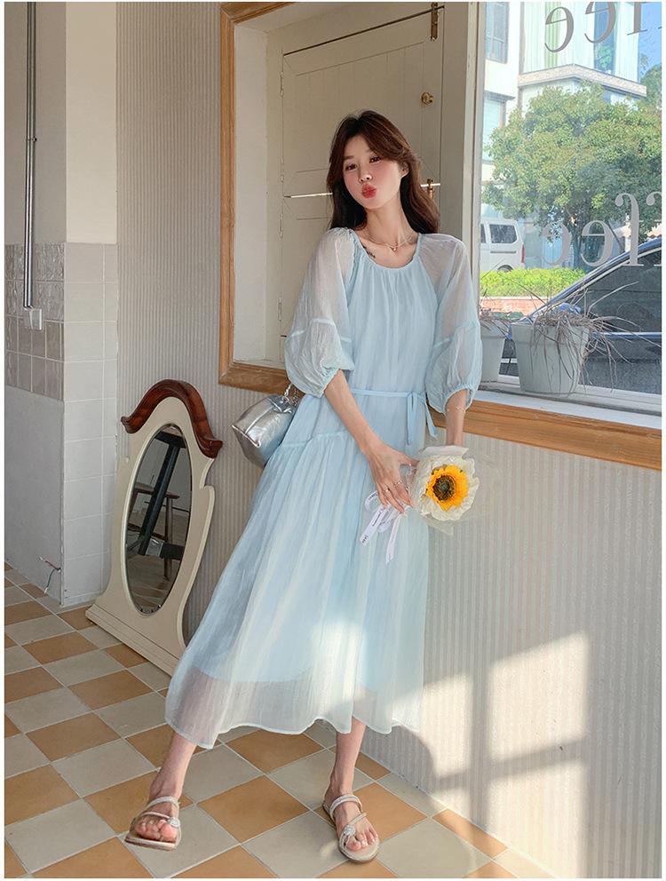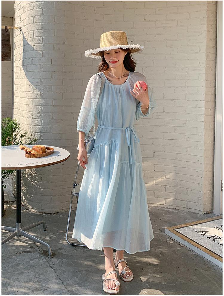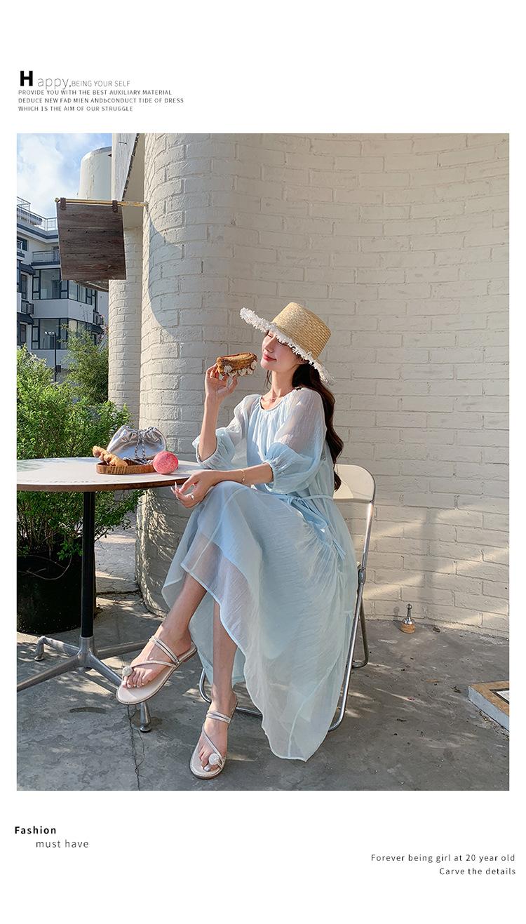 Vestido de Gasa Azul para Mujer 2024 Verano Nuevo Estilo Francés Dulce y Tierno Reductor de Edad Viaje Vacaciones Hermosa Falda Larga