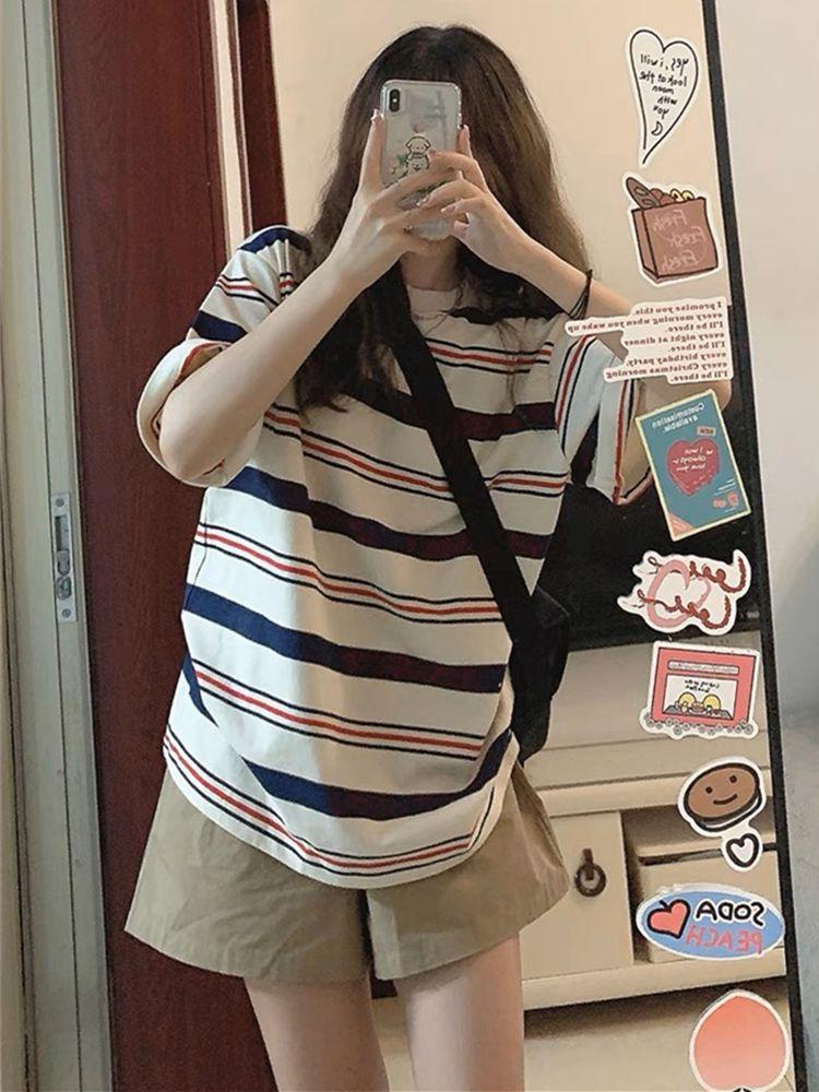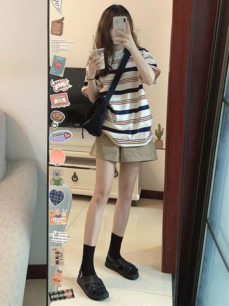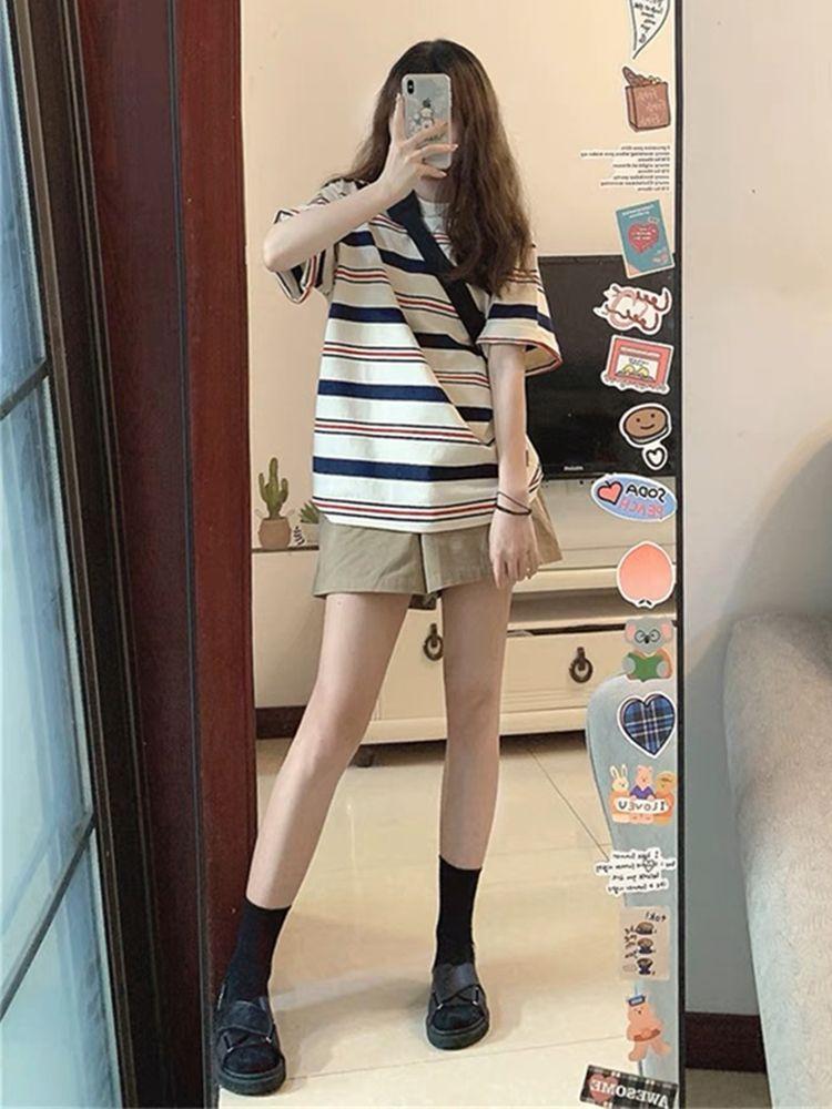Traje Deportivo a Rayas Verano Ins Trendy Estudiante K-Style Suelto Delgado Moda Manga Corta Shorts Conjunto Casual de Dos Piezas