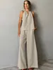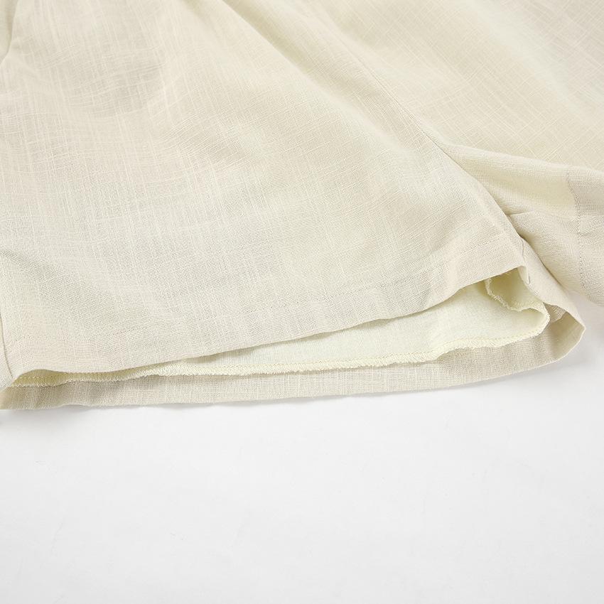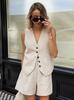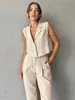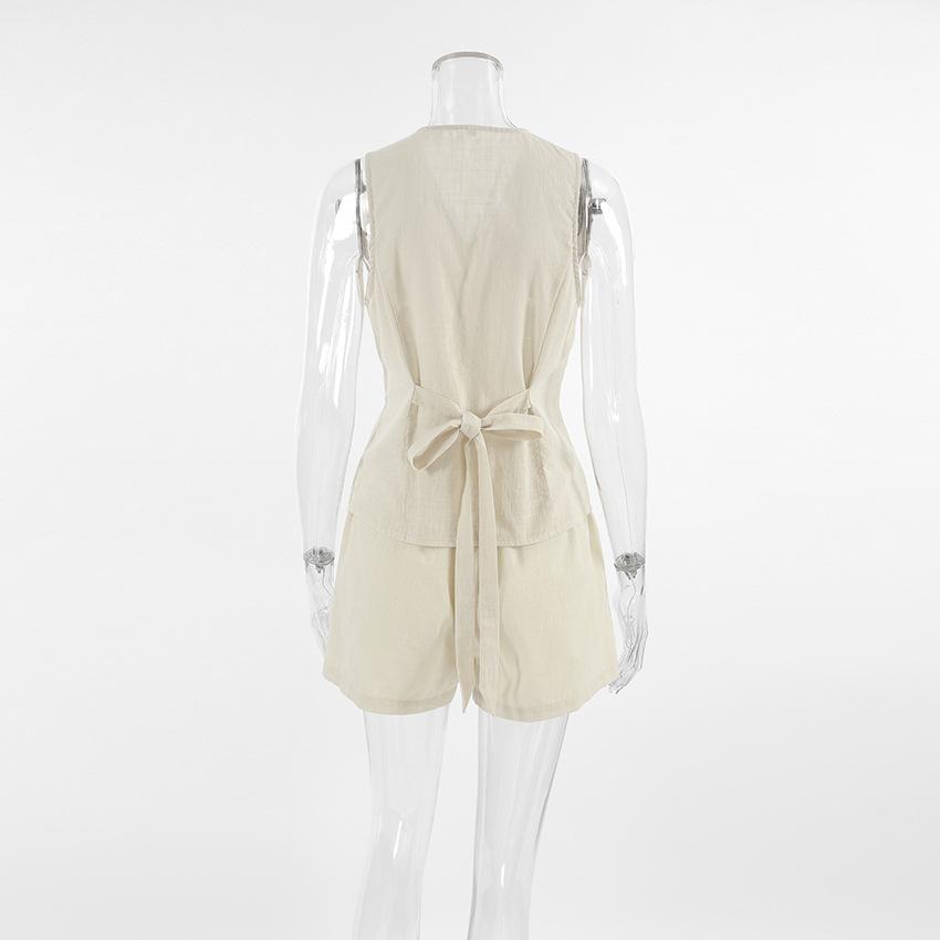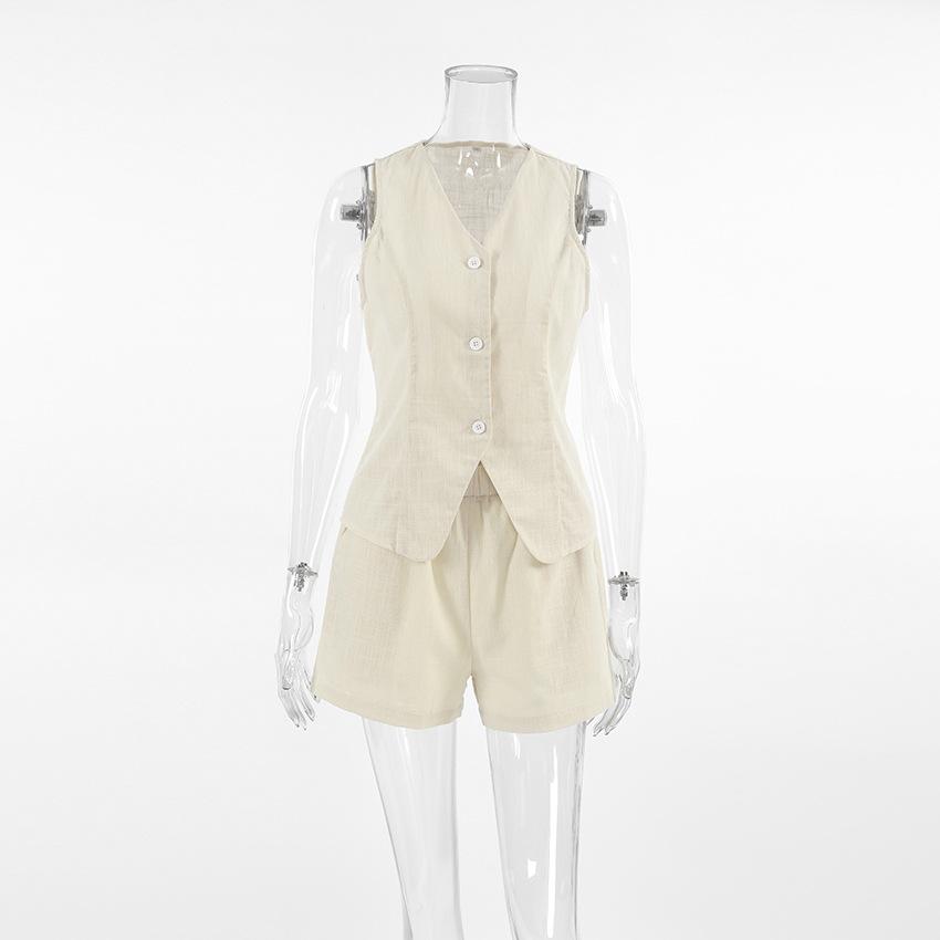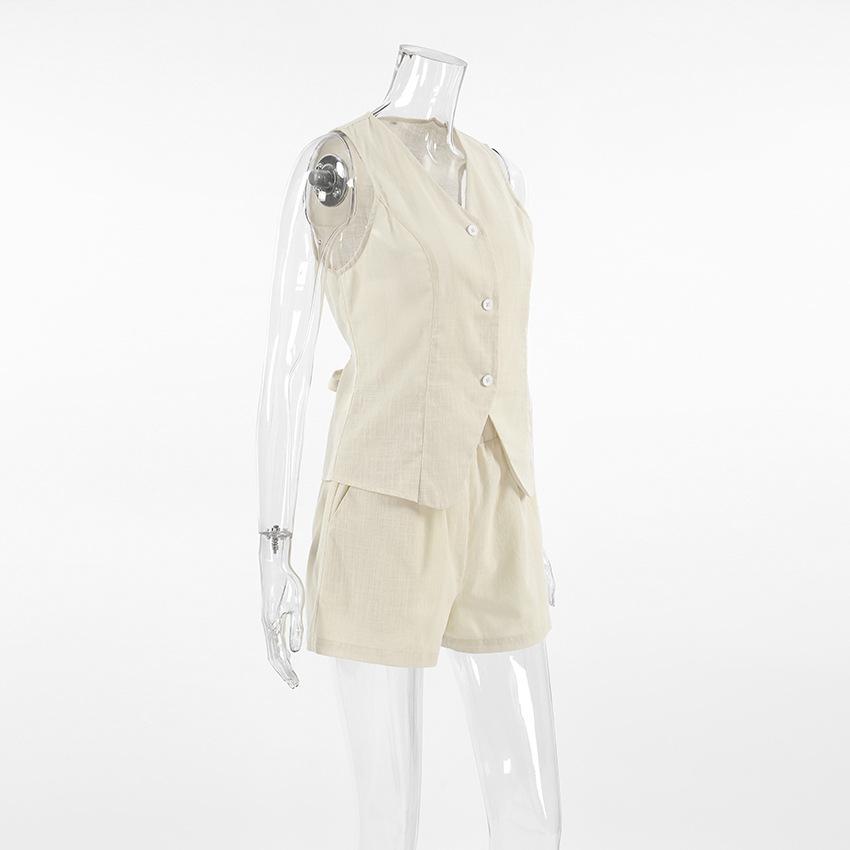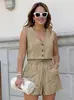 Caqui francés Algodón Lino Cuello en V Sin mangas Chaleco Shorts Traje casual 2025 Verano Europeo y Americano Conjunto de dos piezas
