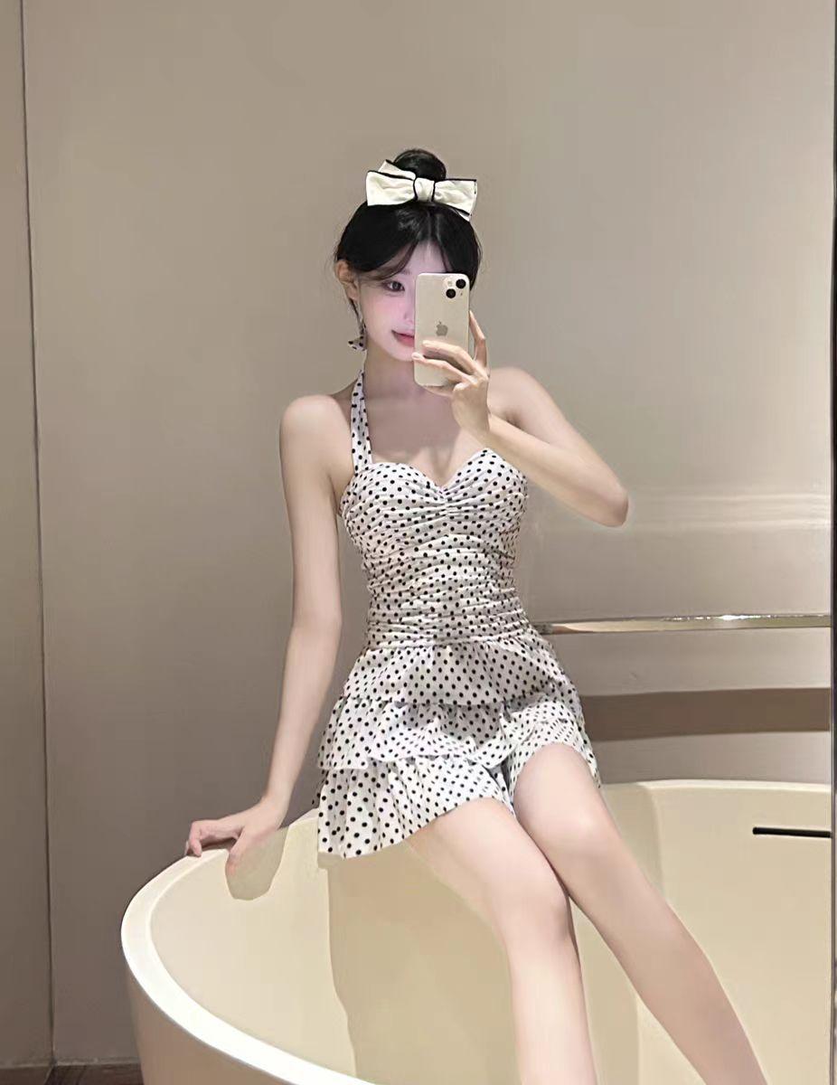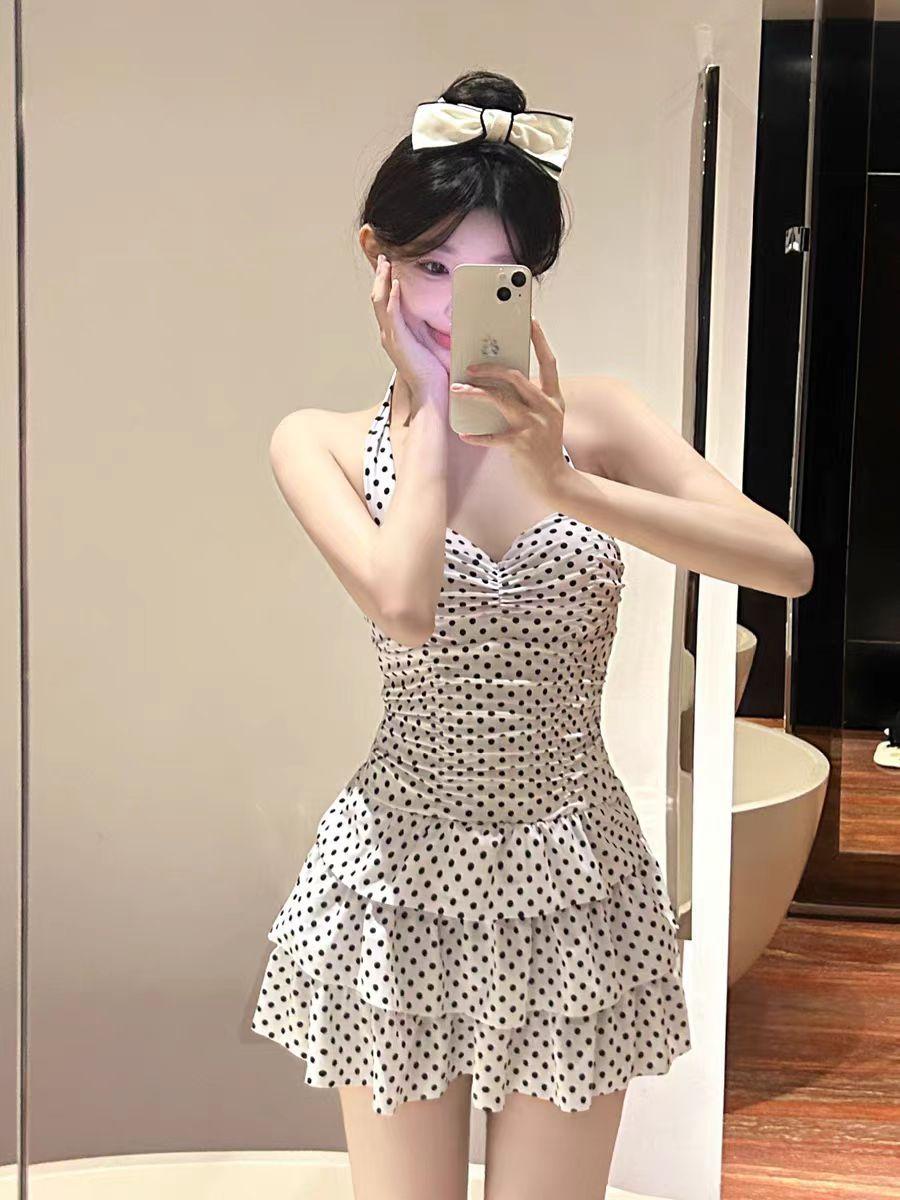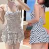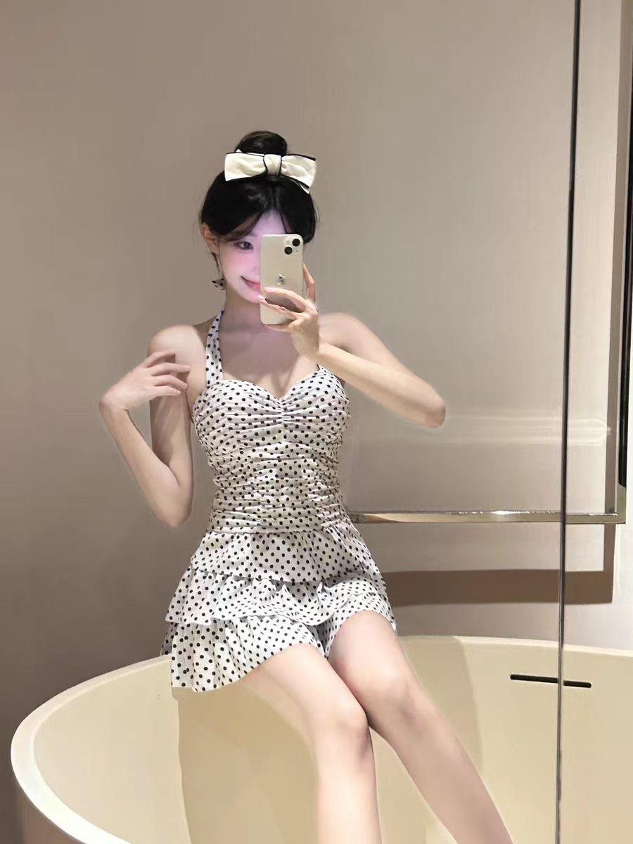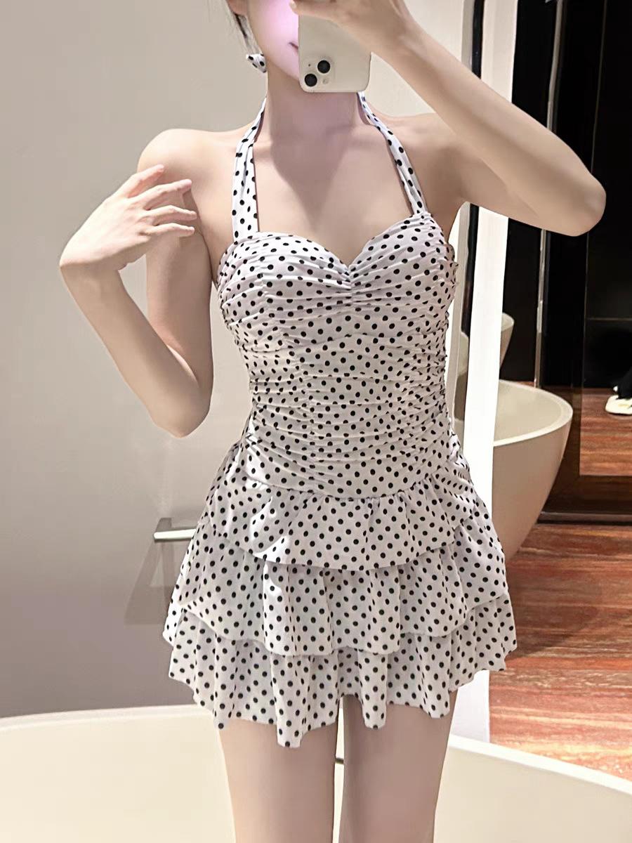 Traje de baño de una pieza para mujer retro de lunares de onda sin espalda bonito dulce falda conservador adelgazante cubre vientre traje de baño para aguas termales al por mayor