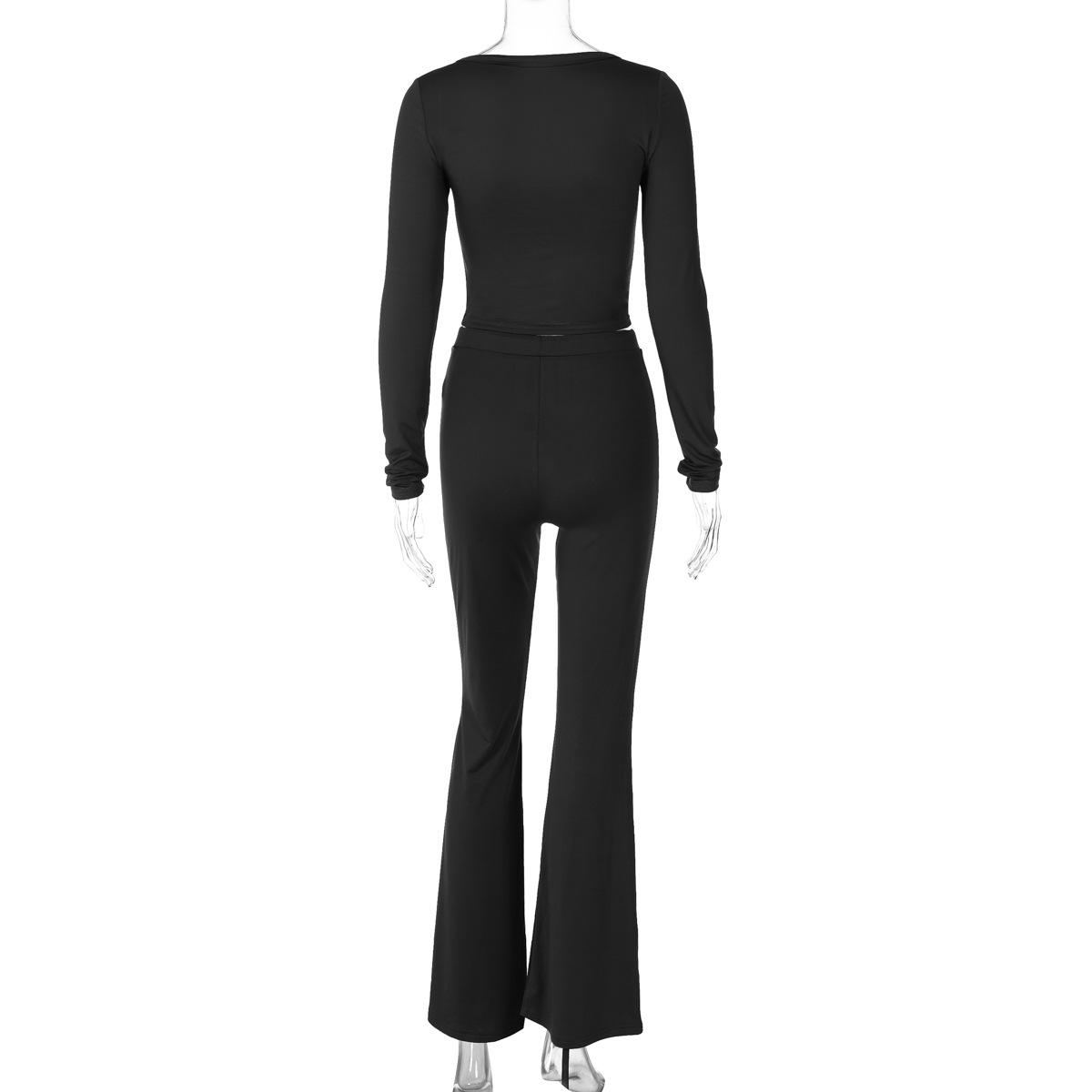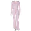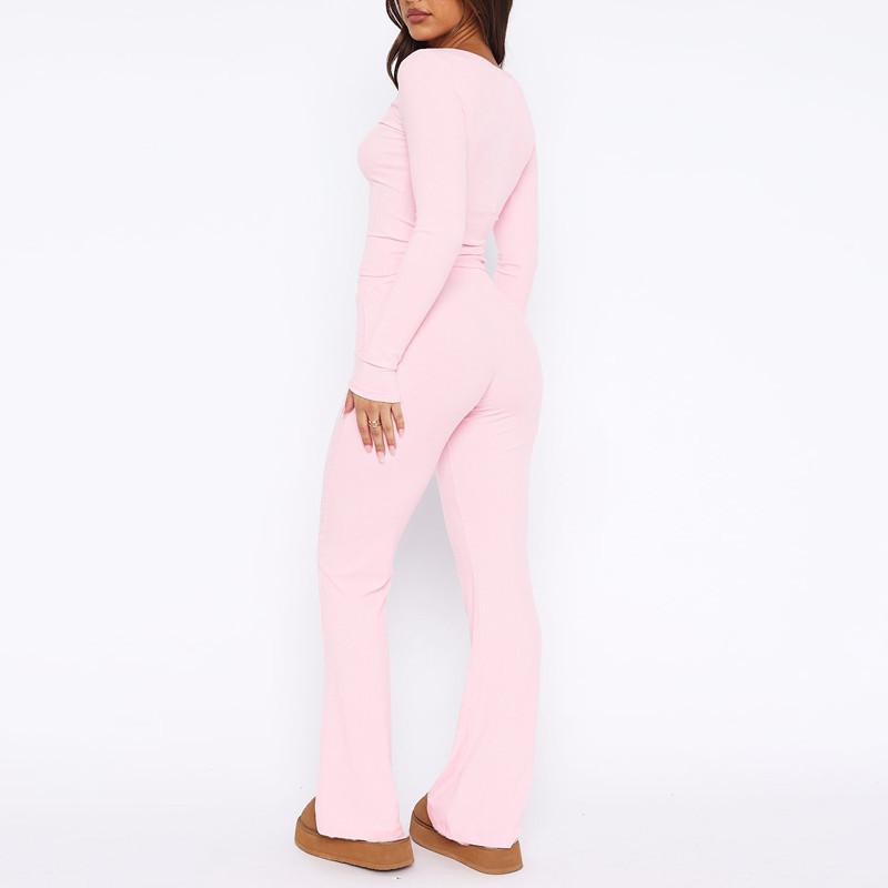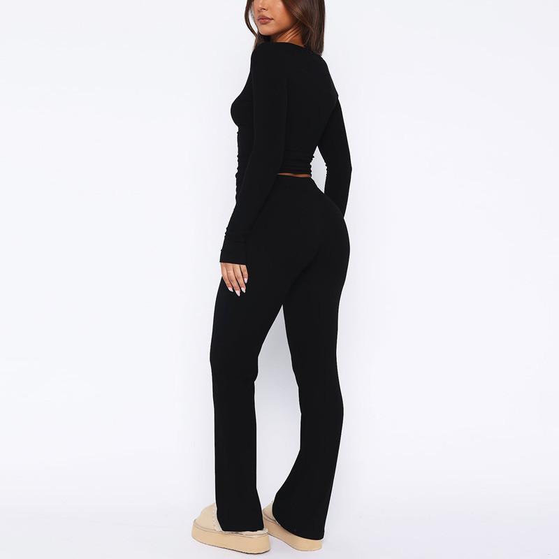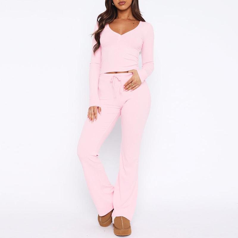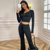 Ropa de Mujer Transfronteriza Europea y Americana 2025 Otoño Nuevo Color Sólido Pelusa Top de Manga Larga Ajustado Pantalones Largos Acampanados Conjunto de Dos Piezas