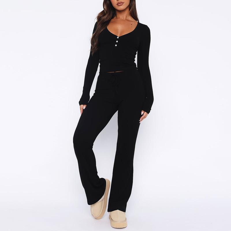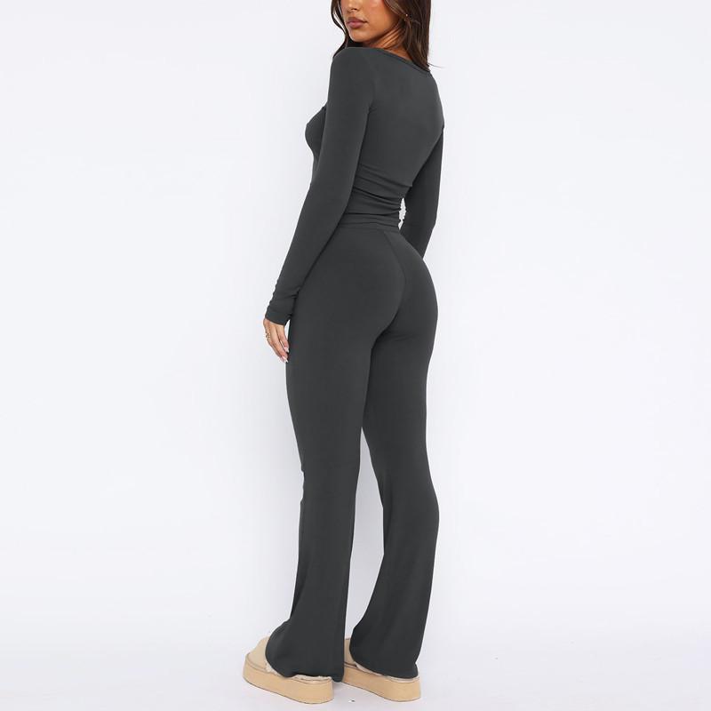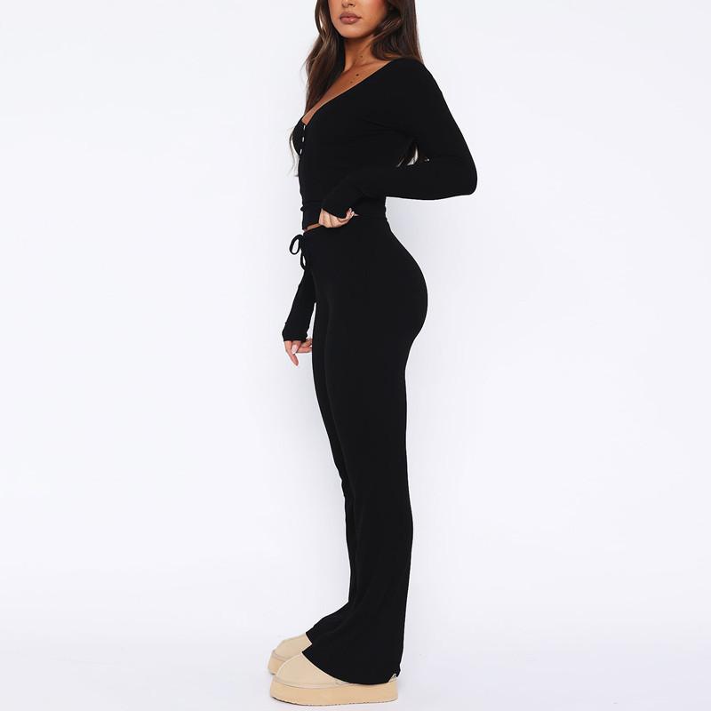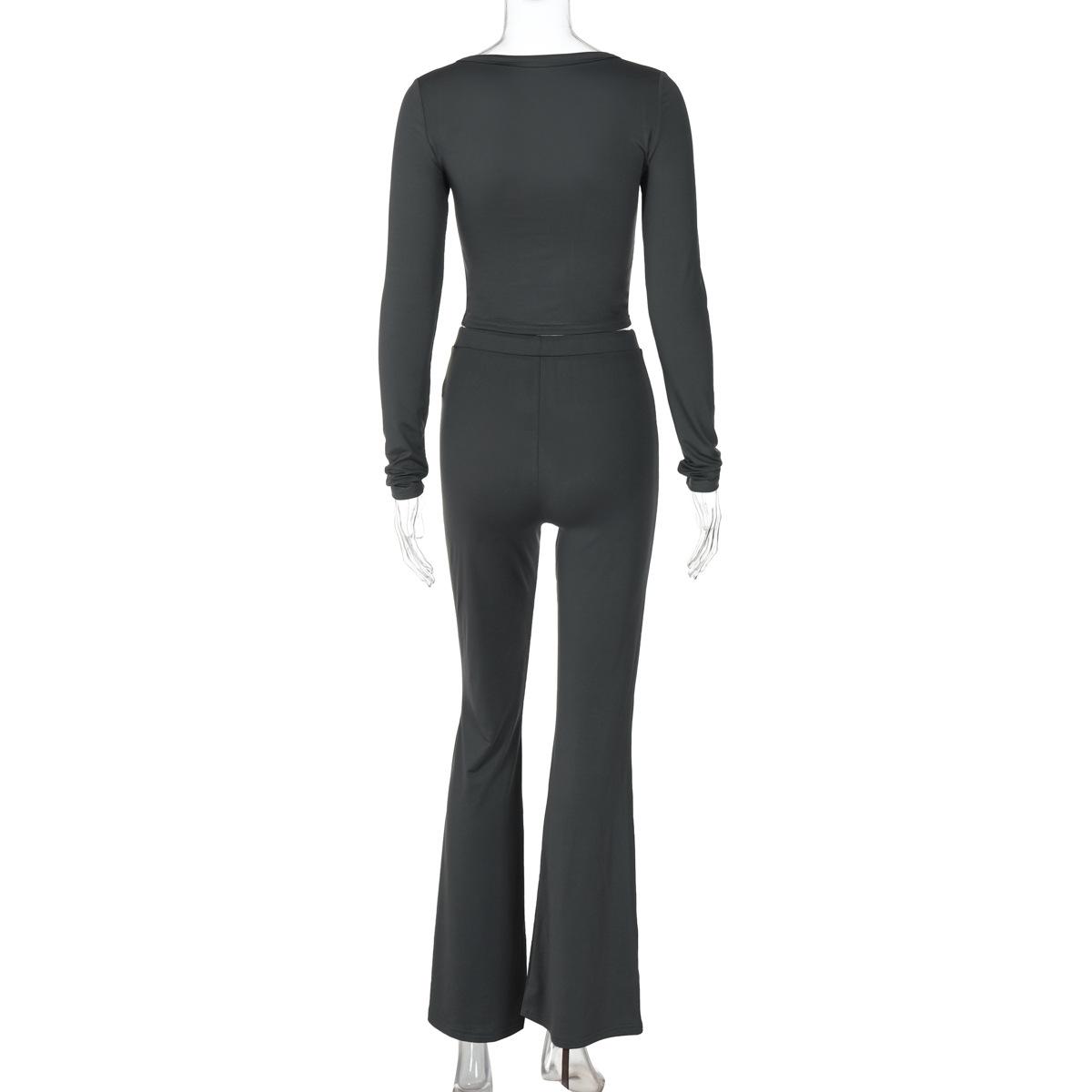 Ropa de Mujer Transfronteriza Europea y Americana 2025 Otoño Nuevo Color Sólido Pelusa Top de Manga Larga Ajustado Pantalones Largos Acampanados Conjunto de Dos Piezas