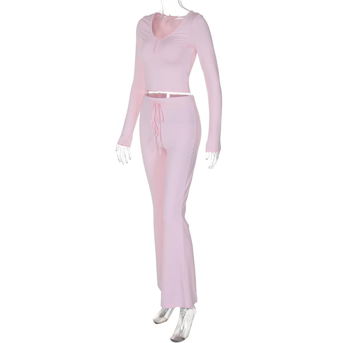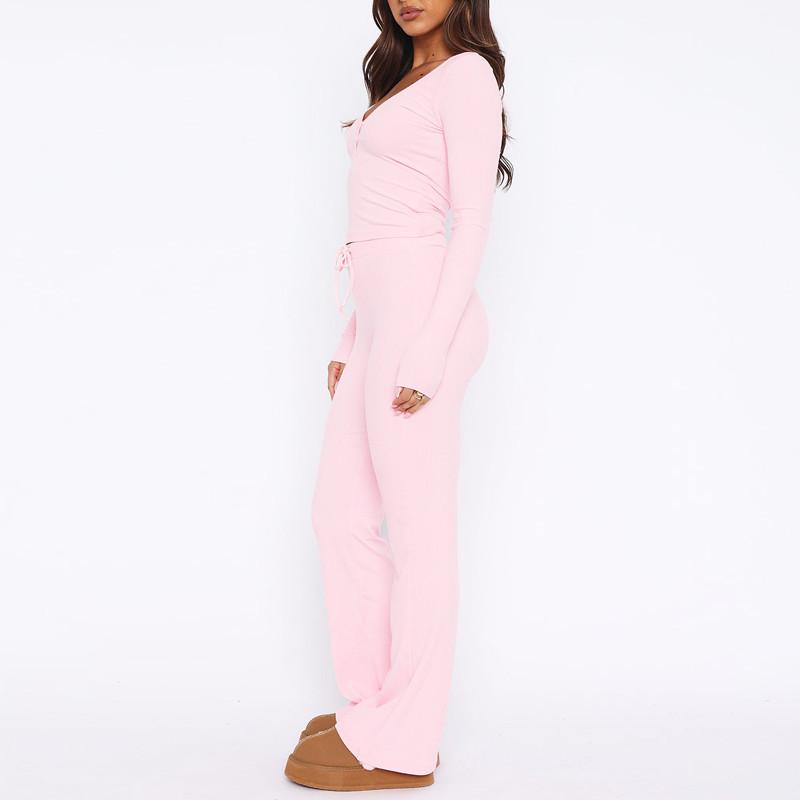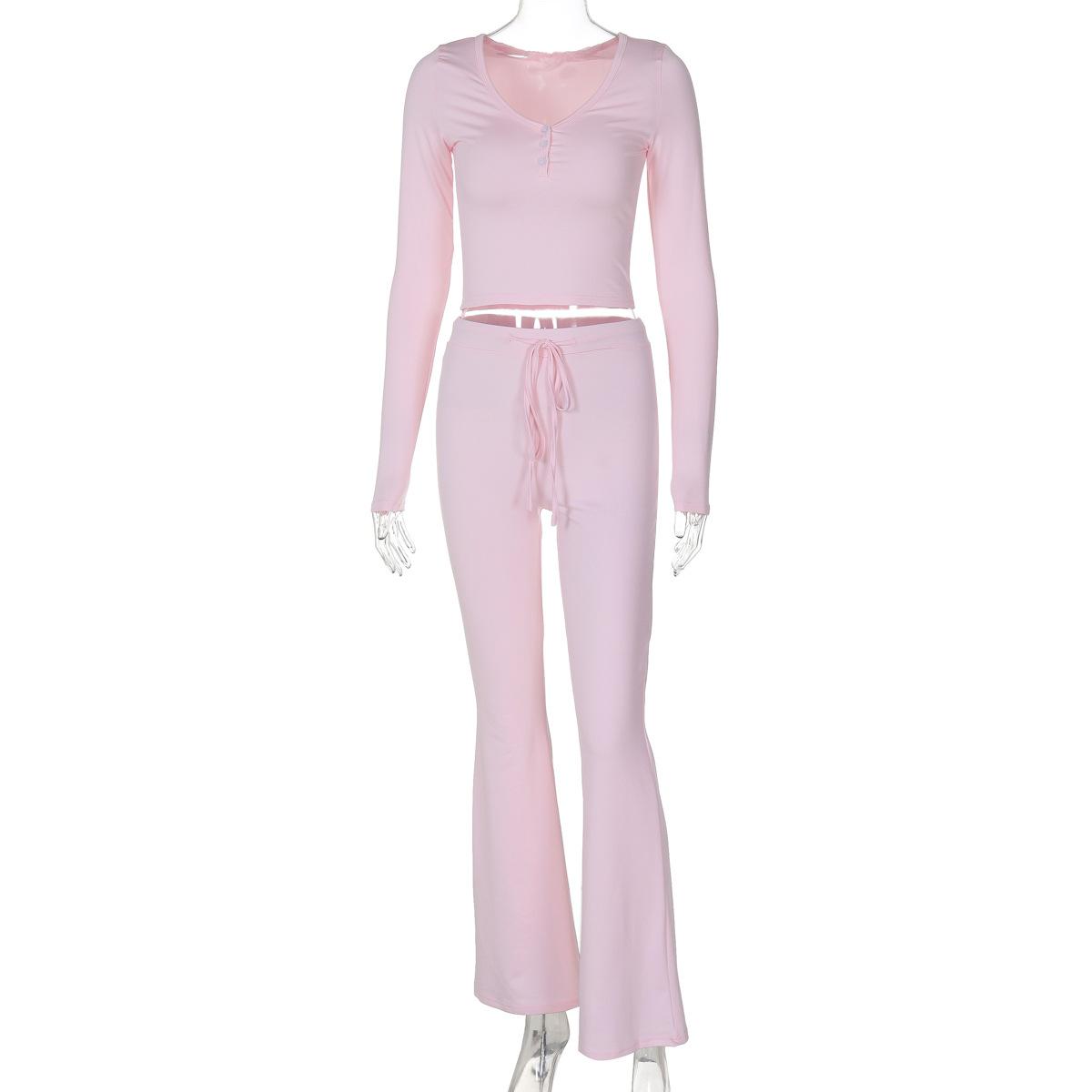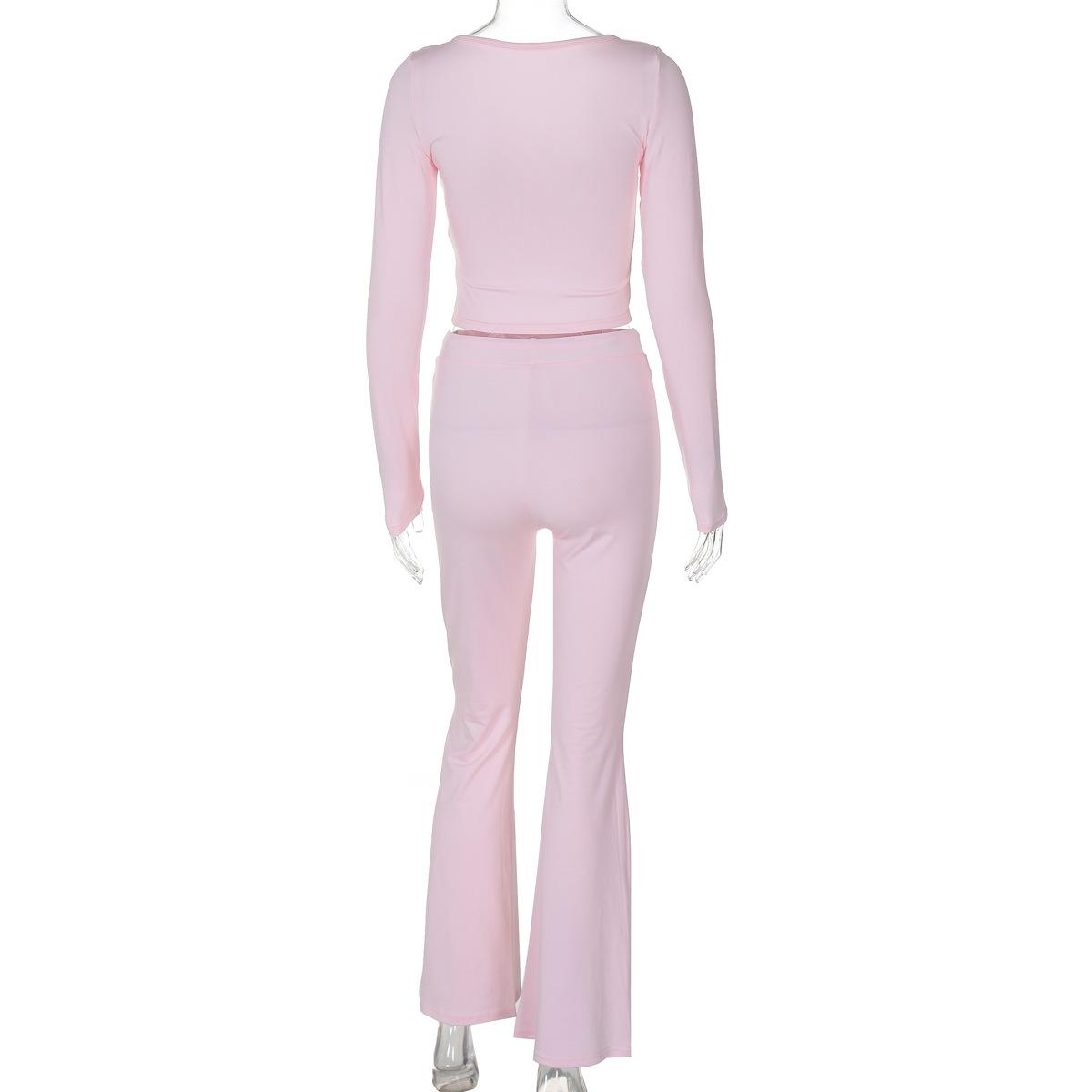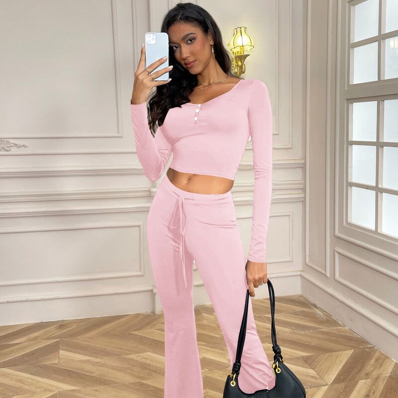 Amazon Ropa Europea y Americana 2025 Primavera Nuevo Color Sólido Manga Larga Moda Pantalón con Cordón Traje de Dos Piezas para Mujer Venta al por Mayor