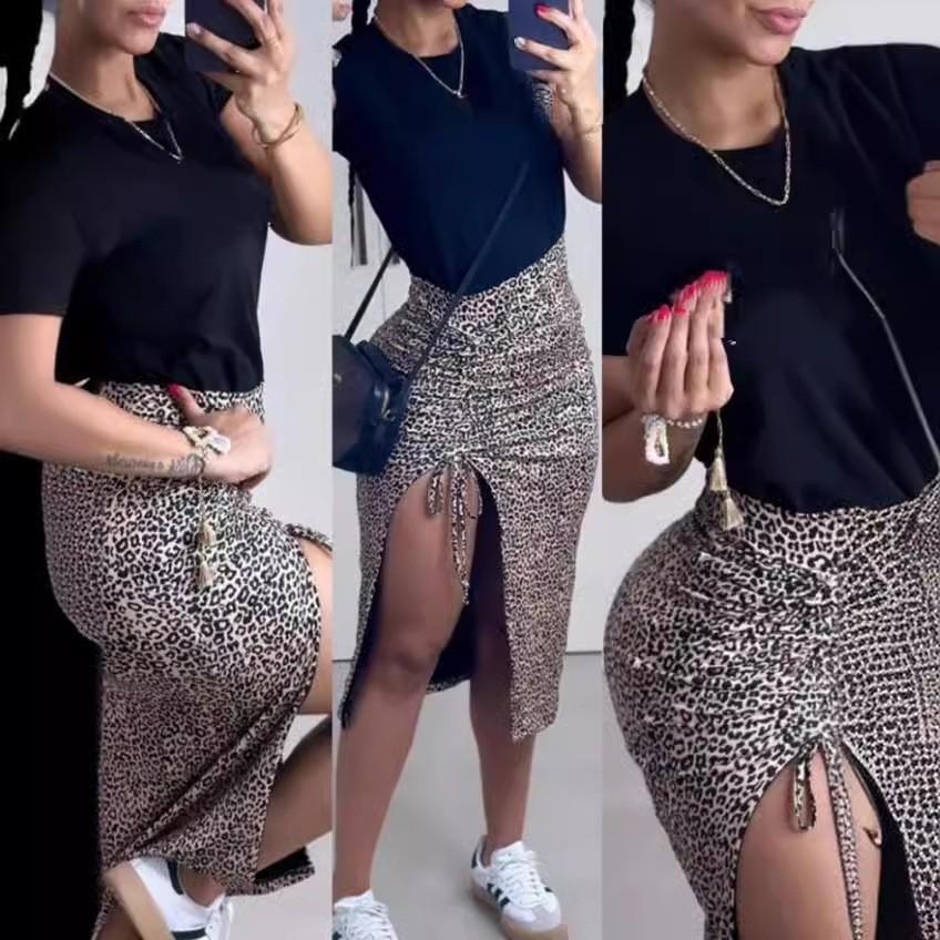 Traje de falda A de línea con abertura, elástico, de cintura alta, de manga corta y color sólido para mujer, estilo transfronterizo europeo y americano 2024 con estampado de leopardo
