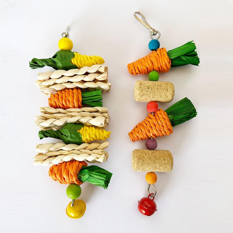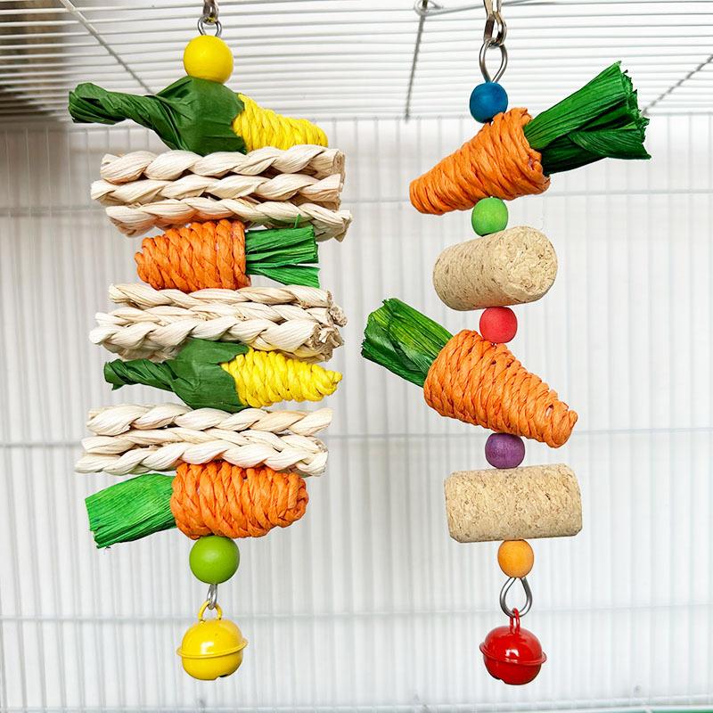 Juguete para loros, juguete para pájaros, bolas de ratán de maíz tejido, juguete antimordeduras de corcho y zanahoria, suministros divertidos para pájaros.