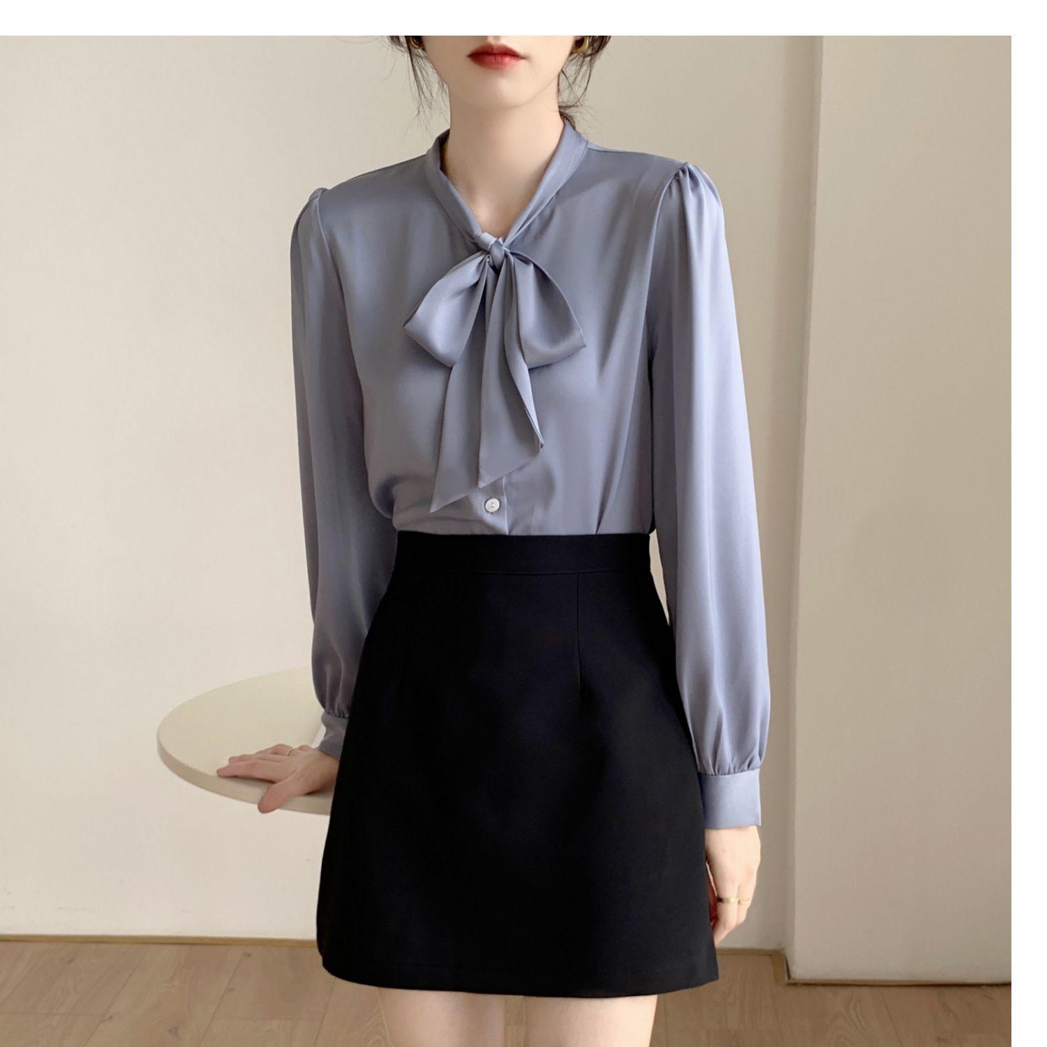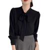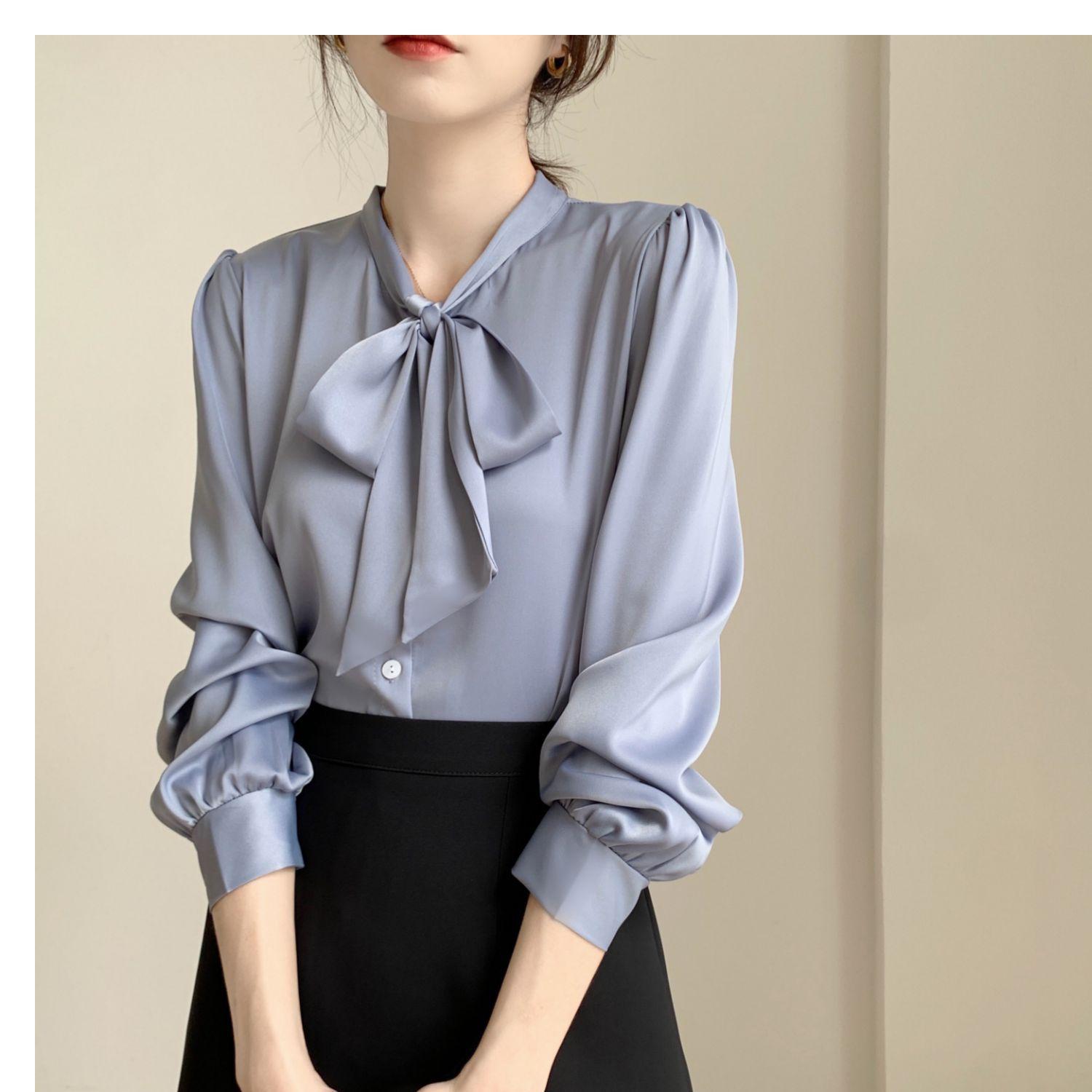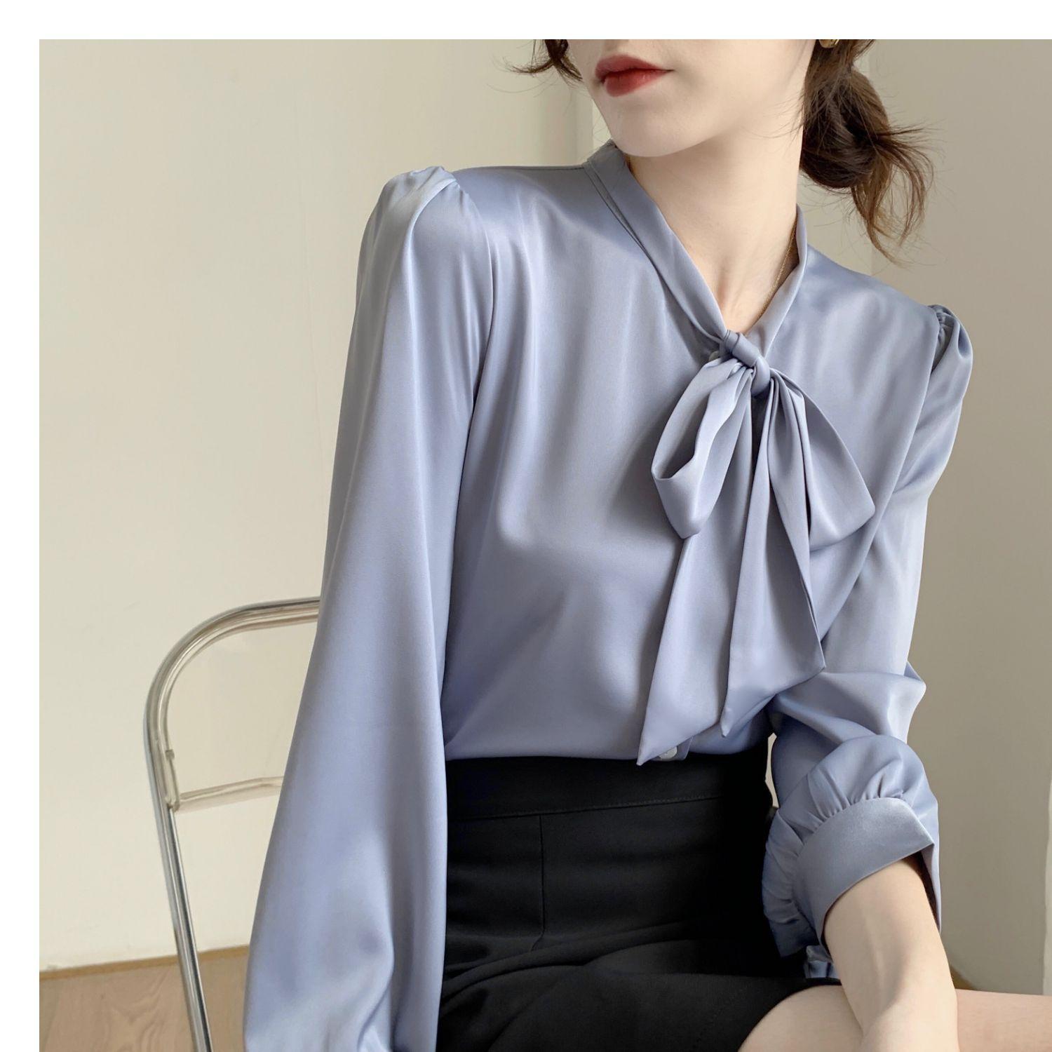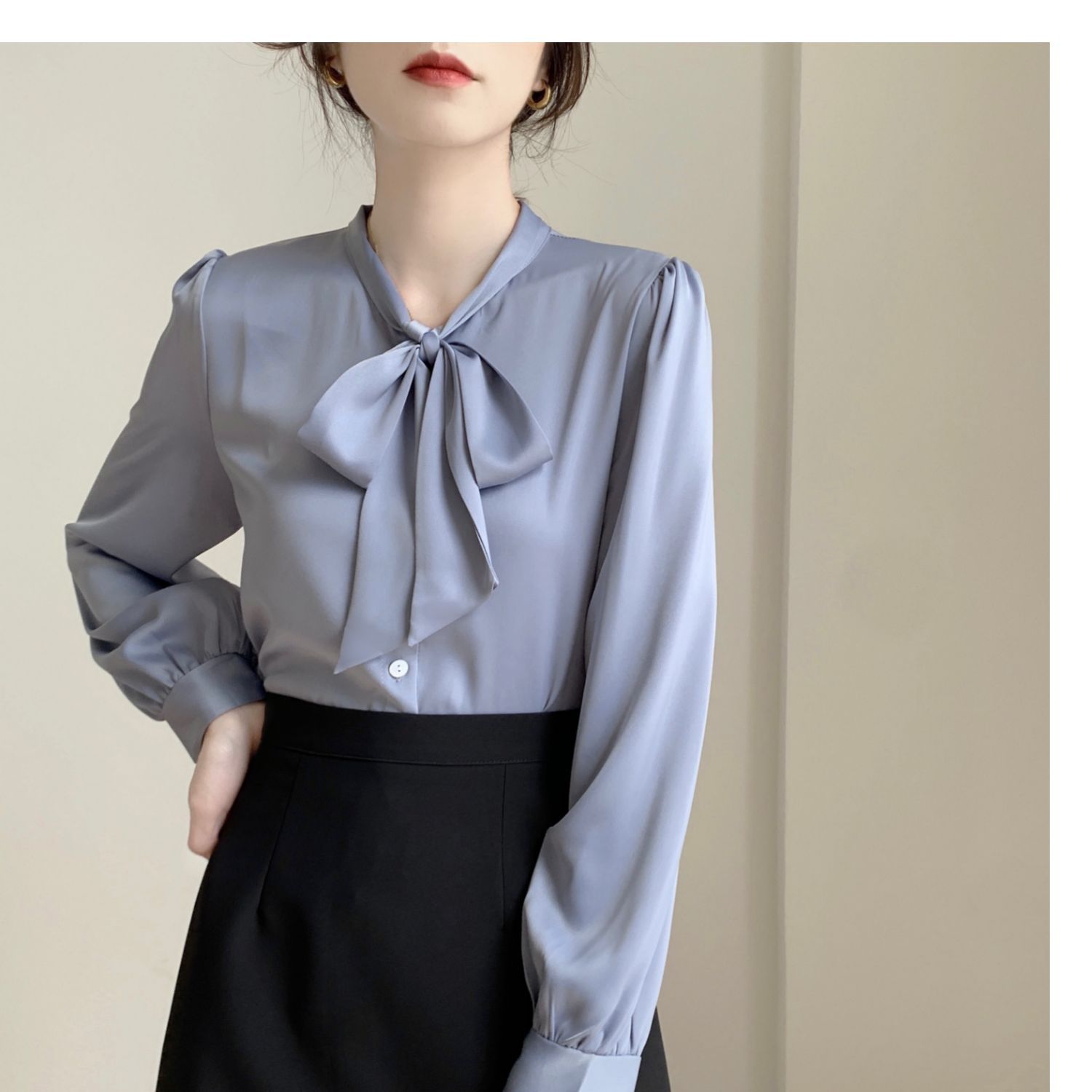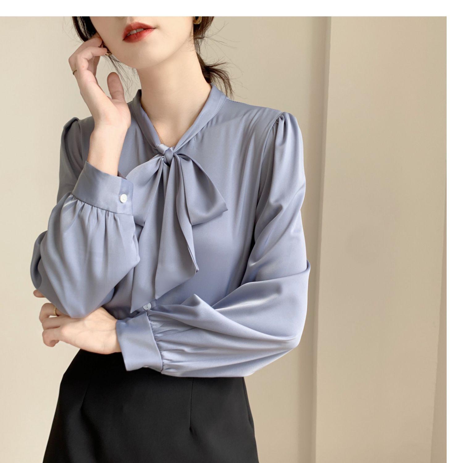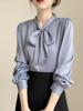 Camisa de lazo azul de primavera y verano para mujer, diseño Sense Niche, camisa elegante profesional, top de satén con encaje