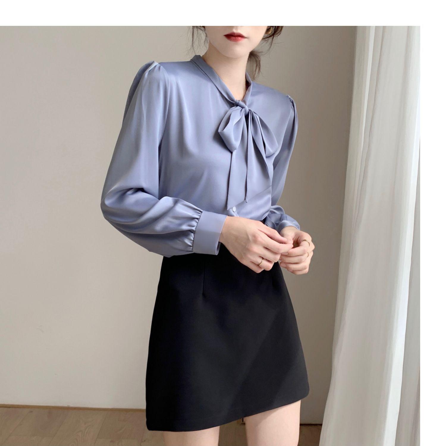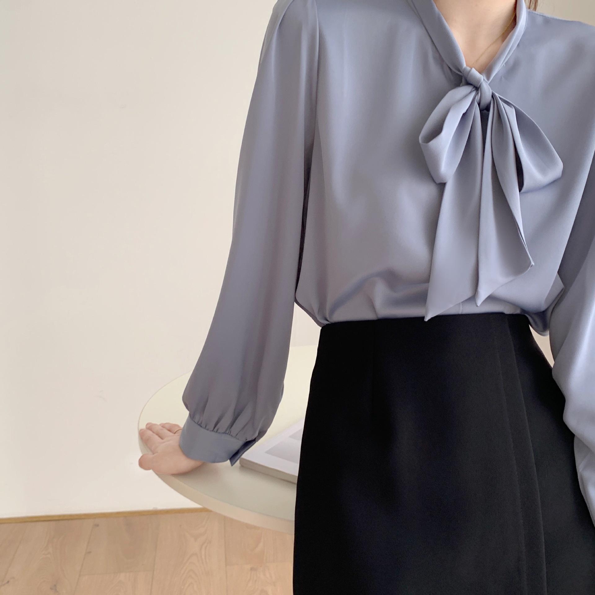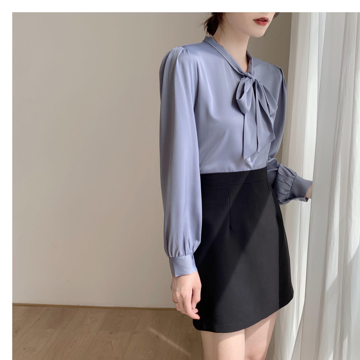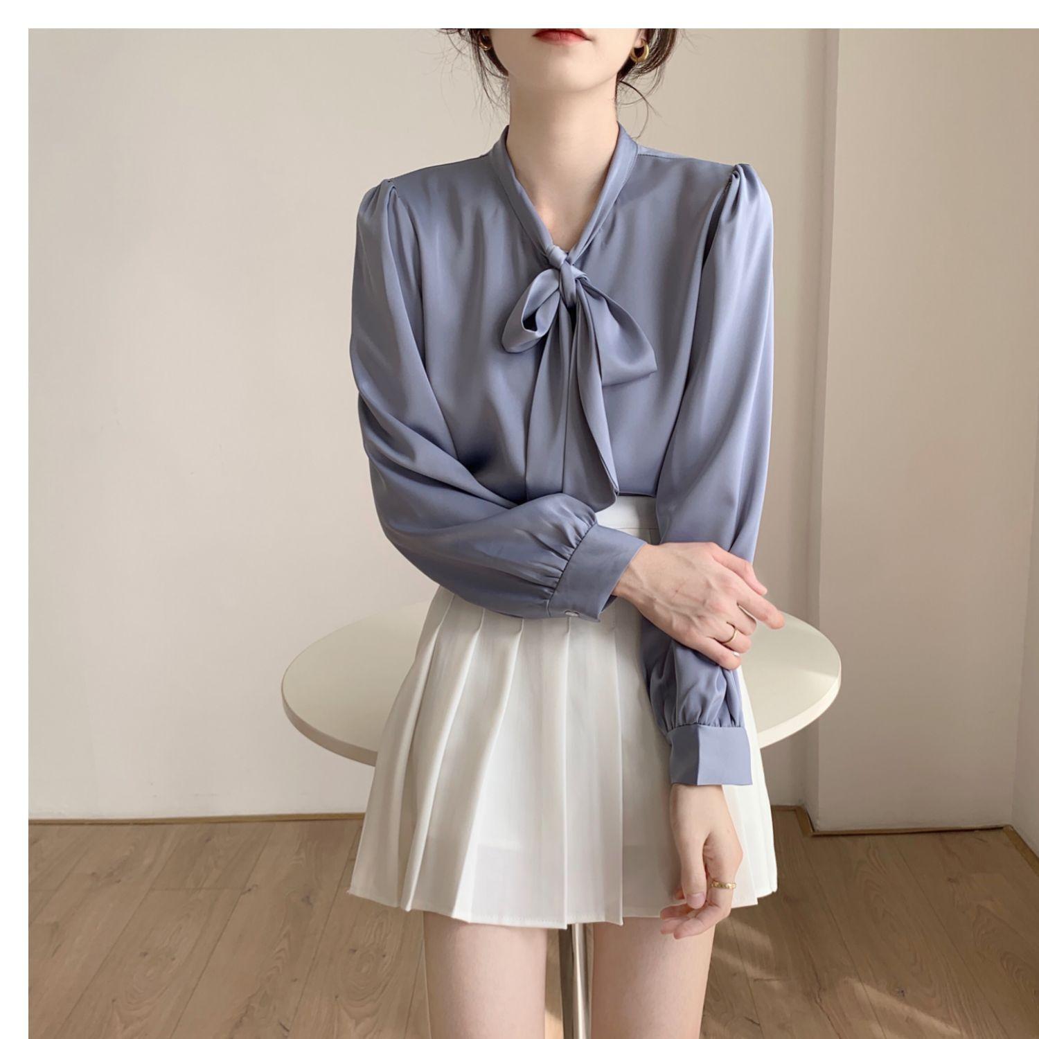 Camisa de lazo azul de primavera y verano para mujer, diseño Sense Niche, camisa elegante profesional, top de satén con encaje