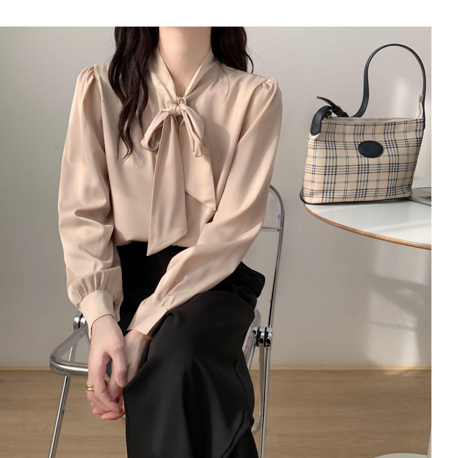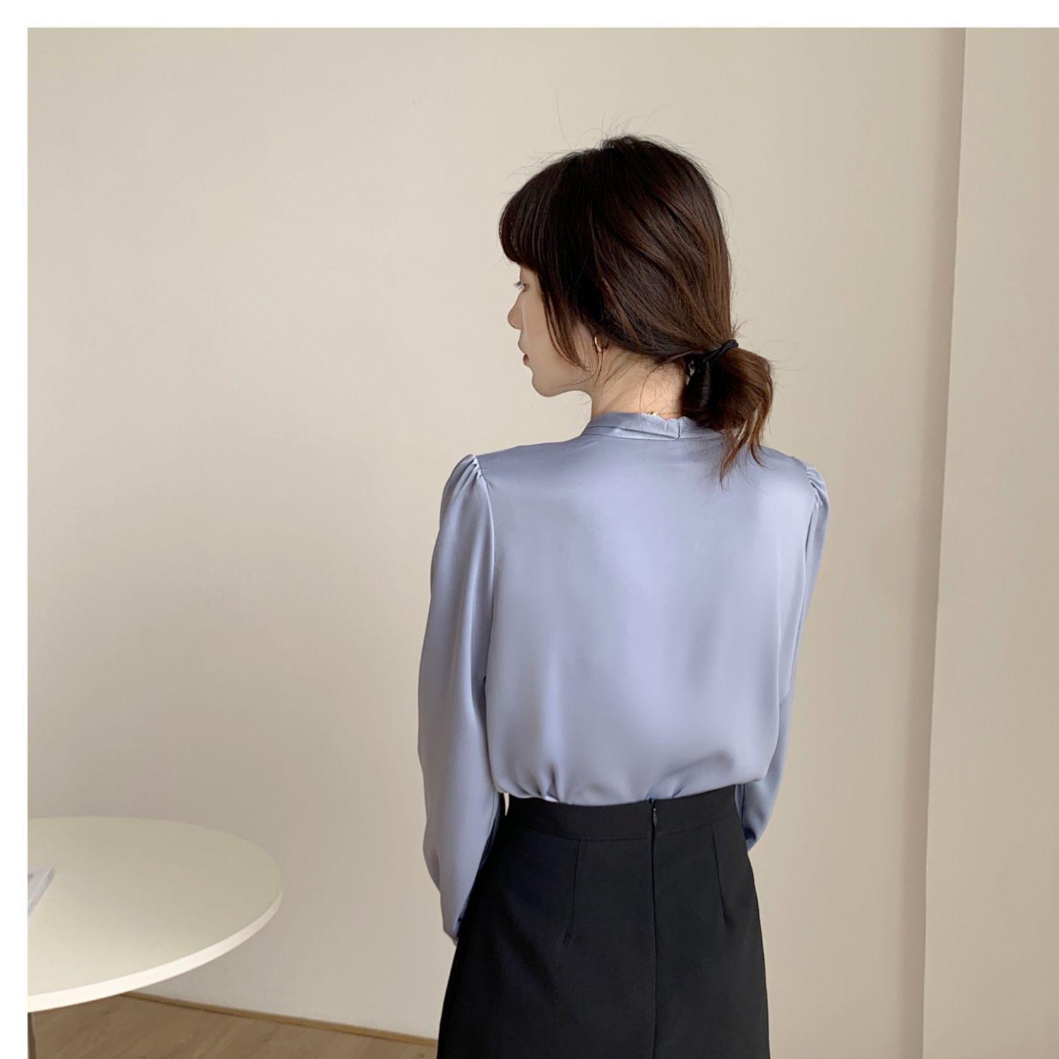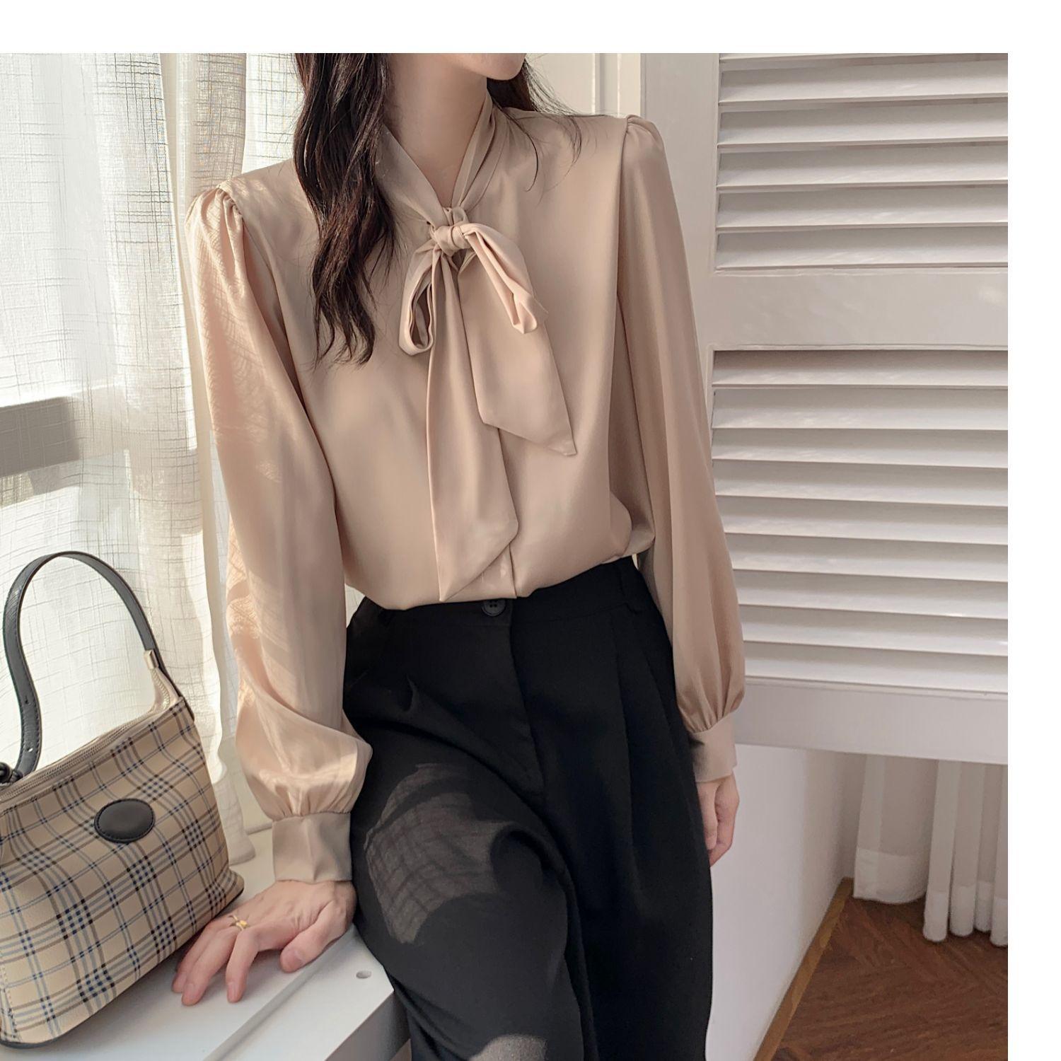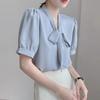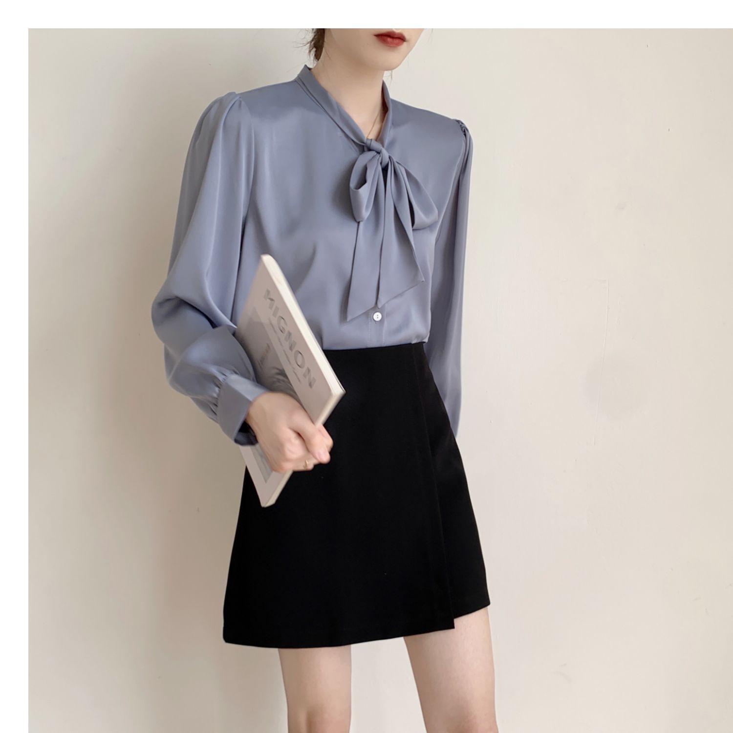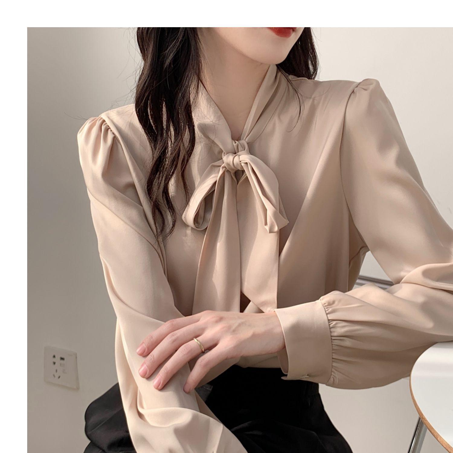 Camisa de lazo azul de primavera y verano para mujer, diseño Sense Niche, camisa elegante profesional, top de satén con encaje