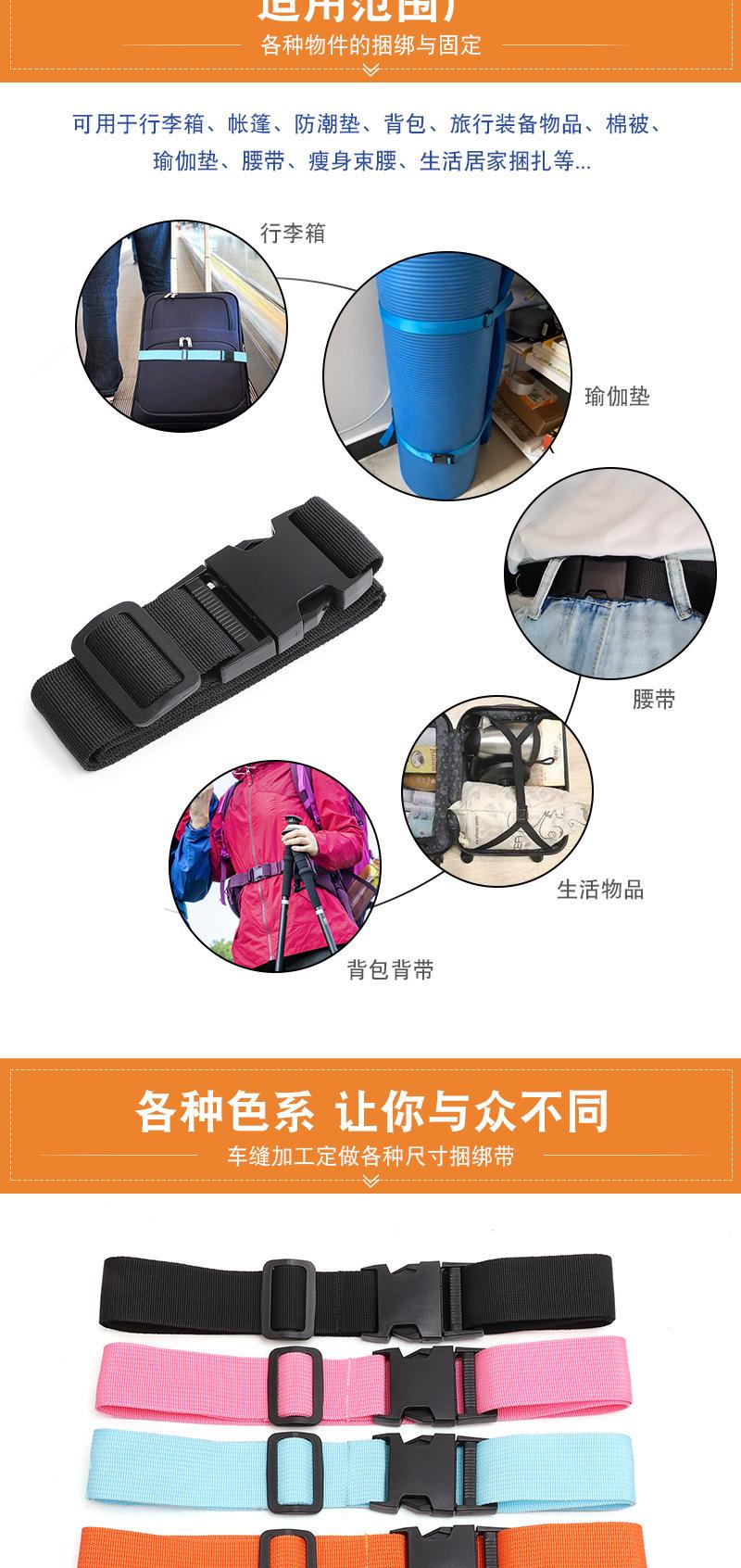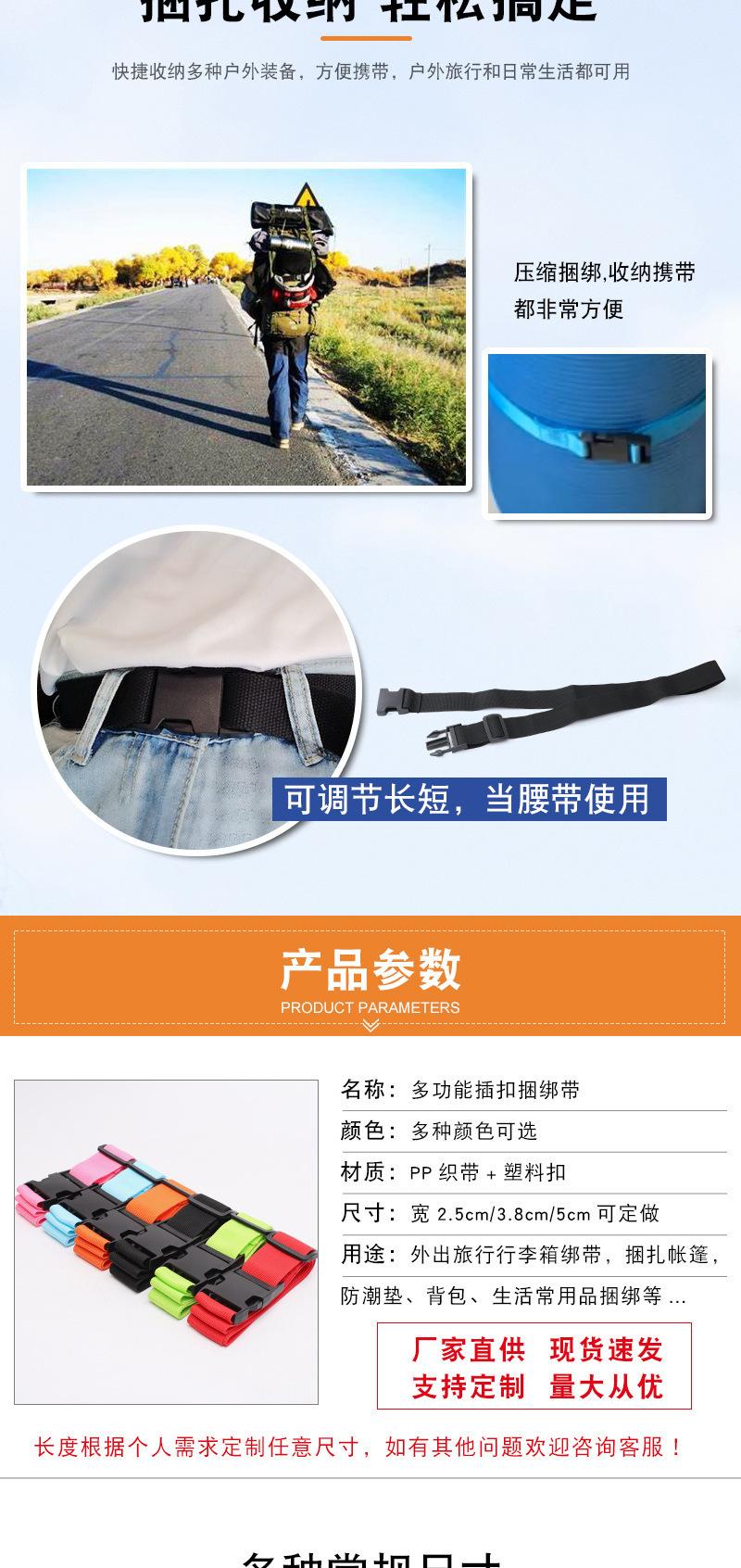 Uso: Se utiliza para sujetar tiendas de campaña, colchonetas a prueba de humedad y otros productos para exteriores; también se puede usar para conectar en la parte inferior de mochilas; también se puede usar como cinturón para pantalones de vestir y pantalones de secado rápido, para sujetar cartón de rotación de fábrica, sujetar libros, sujetar máquinas, para envolver regalos, etc. Cajas de cartón, maquetas de coches, reutilizable y conveniente.