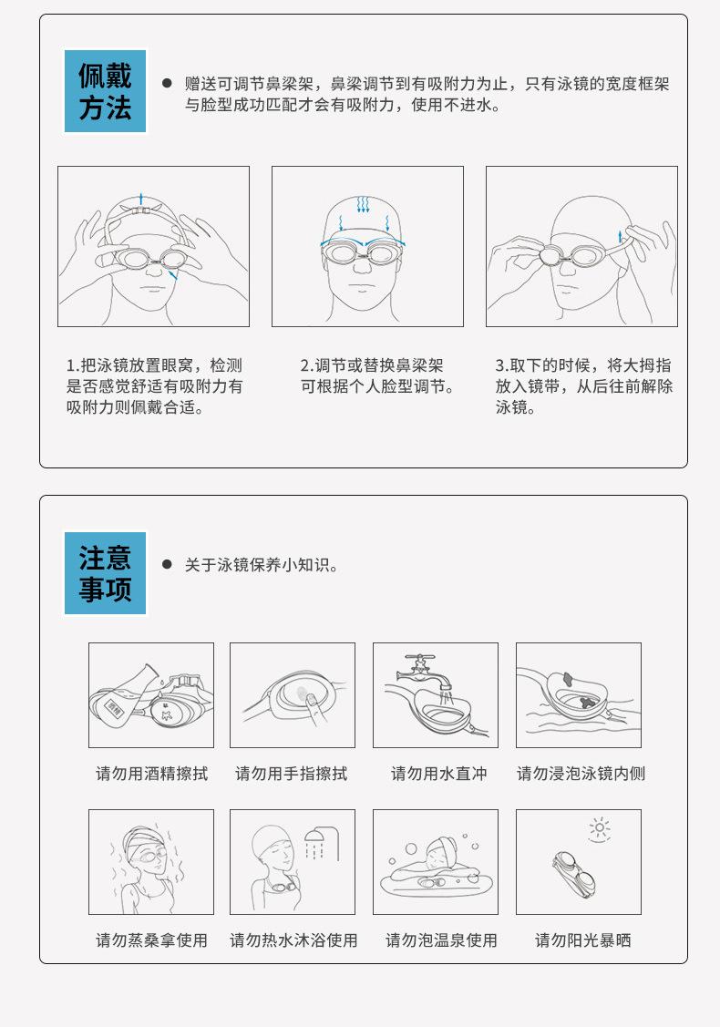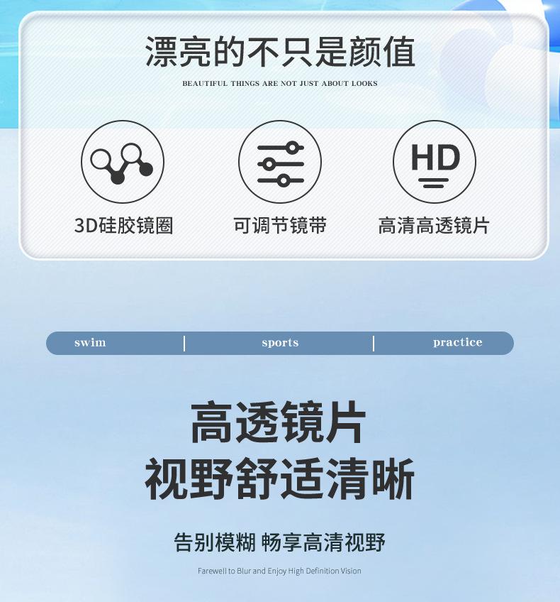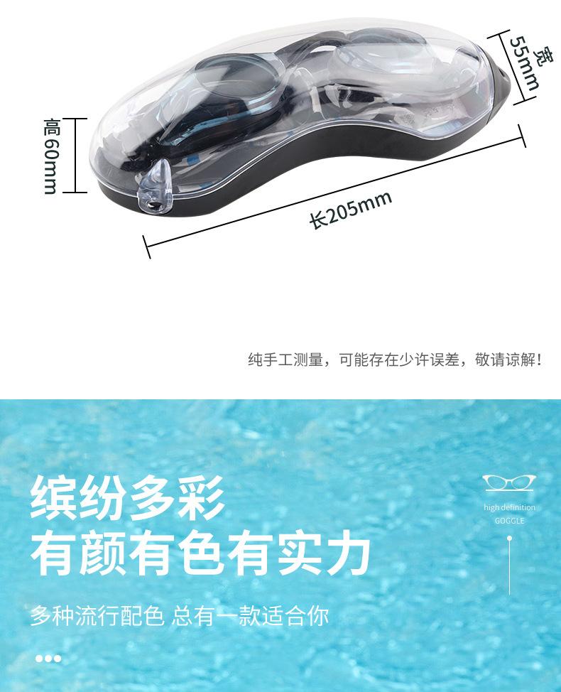 Introducción del producto: Diseño 3D, no presiona las cuencas de los ojos, más cómodo para nadar. La junta de silicona sella herméticamente los ojos para evitar fugas. La capa interna de la lente tiene un revestimiento antivaho que no se empaña bajo el agua, proporcionando una visión clara.