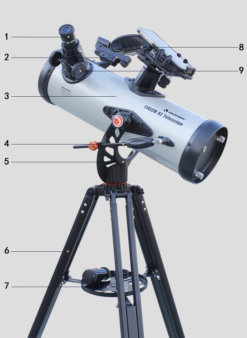 1. Ocular 2. Buscador de punto rojo 3. Tubo principal 4. Varilla de ajuste fino del teodolito 5. Soporte en forma de U 6. Trípode de aluminio 7. Bandeja de accesorios 8. Soporte para teléfono móvil StarSense 9. Perilla de enfoque
