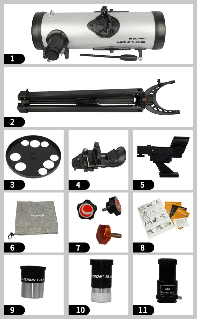 1. Cuerpo principal del objetivo 2. Trípode de aleación de aluminio 3. Bandeja de accesorios 4.Ssoporte para teléfono móvil tarSense 5. Buscador de punto rojo 6. Bolsa de almacenamiento 7. Tuerca de soporte × 2/tuerca de varilla de ajuste fino × 1 8. Tarjeta de descarga de la aplicación StarSense Explorer/manual de instrucciones/tarjeta de garantía 9. Ocular de 10 mm 10. Ocular de 25 mm 11. Teleconvertidor 2x