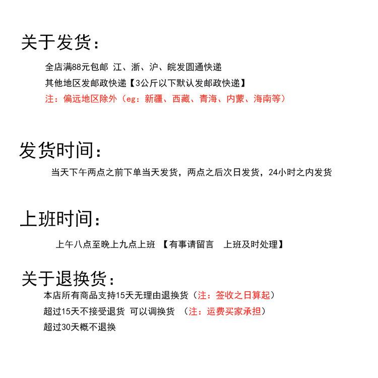 Según el peso total de la mercancía, los envíos ligeros se realizan por mensajería urgente y los pesados por logística. Generalmente, los envíos exprés predeterminados son EMS Economic Express y Yunda Express. La elección del envío exprés depende de la región y el peso de la mercancía, y no se especifica ningún envío exprés. El envío gratuito es una logística especializada, por lo que no se puede proporcionar información logística. ¡El flete logístico designado es a cargo del cliente! Estimados empresarios, espero que lo entiendan.