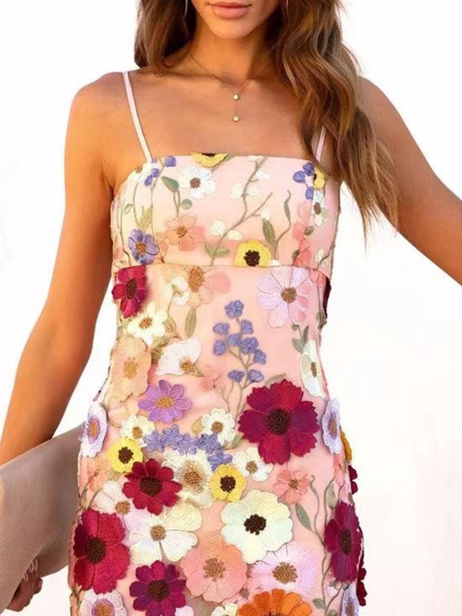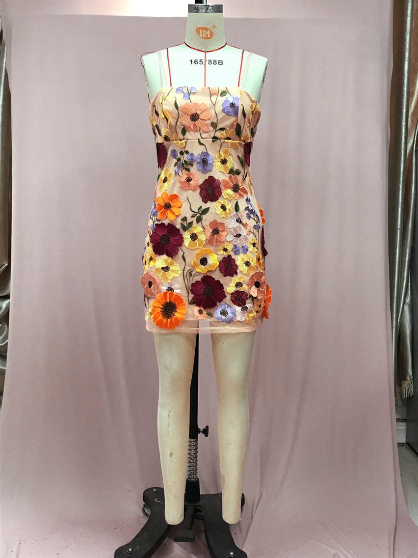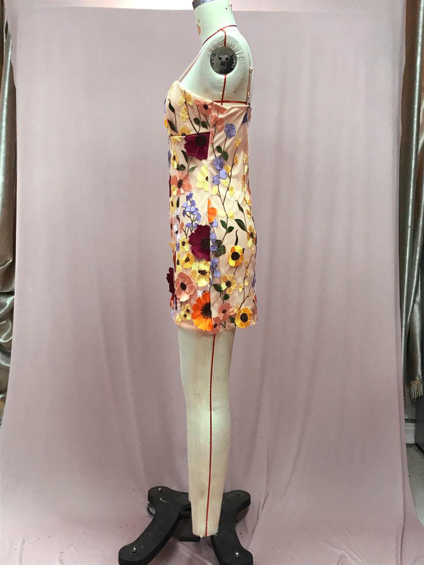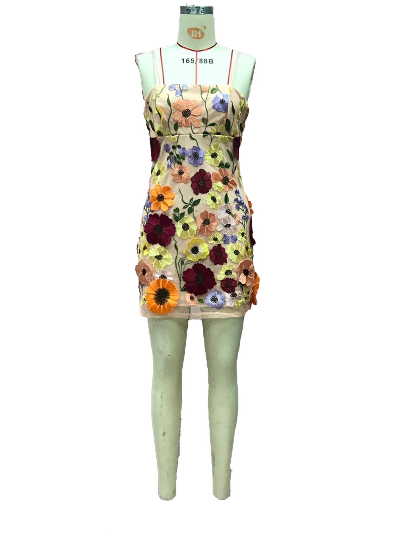 Vestido Elegante de Nuevo Estilo Primavera 2025 con Flores Estéreo, Empalme de Malla, Bordado Pesado, Tirantes, Falda Corta