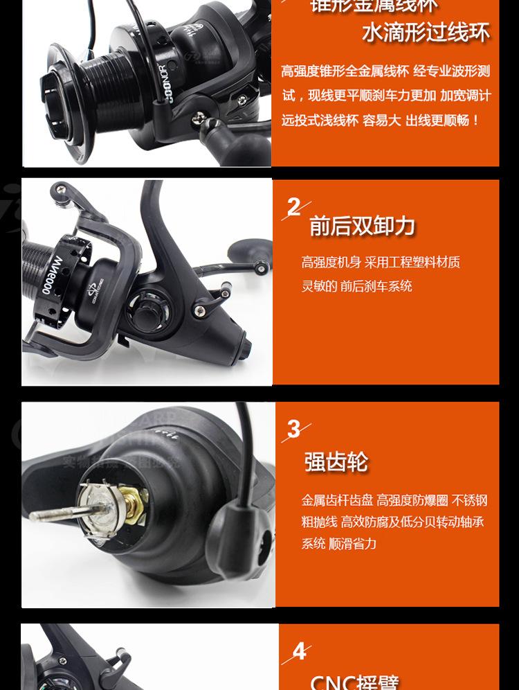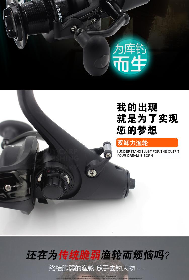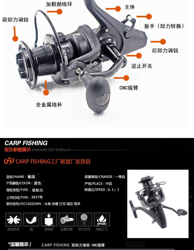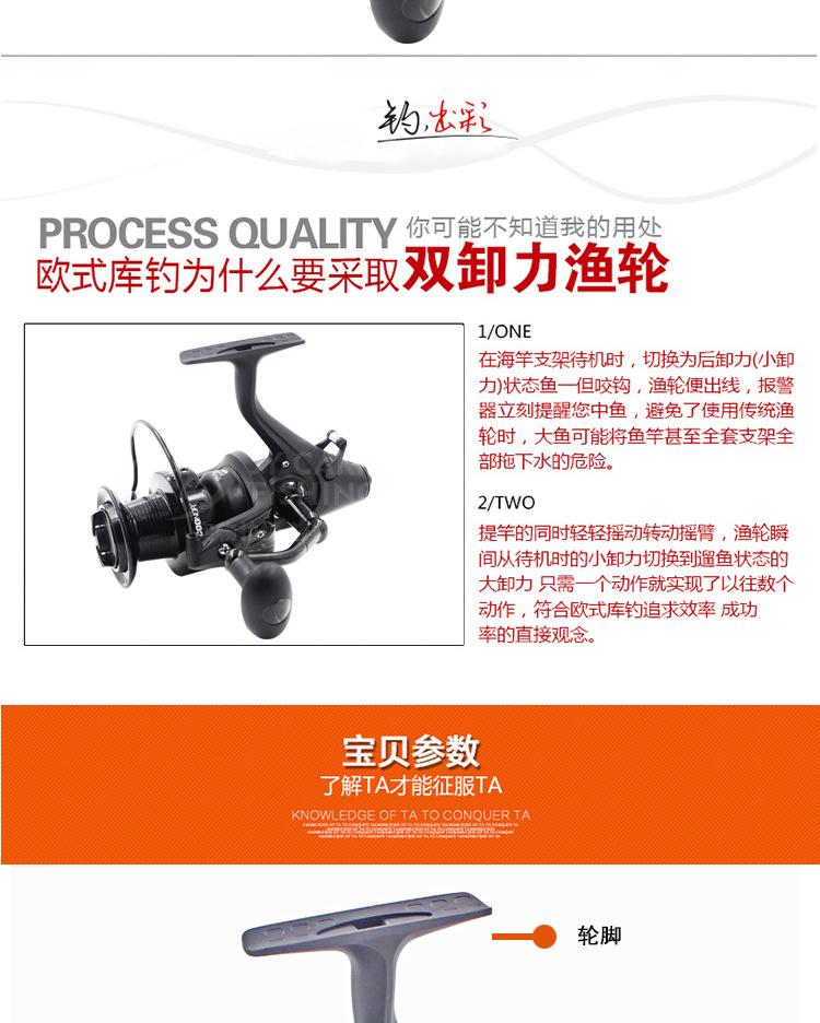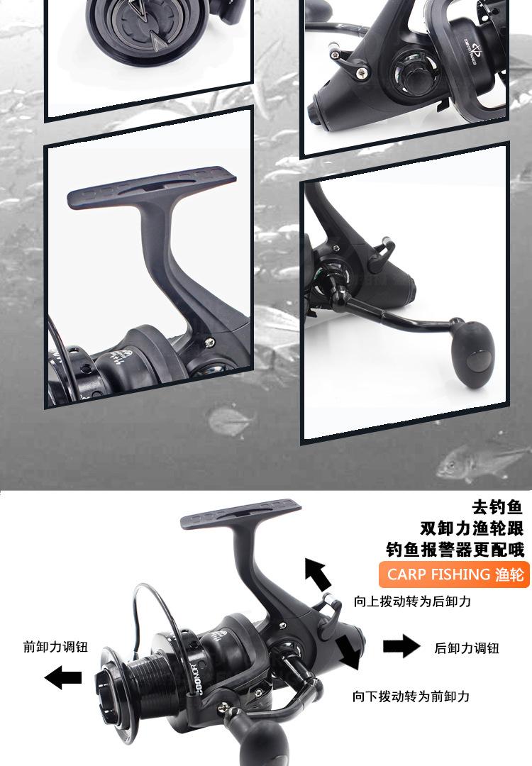 El carrete de pesca cuenta con frenos dobles de descarga, tanto delanteros como traseros, controlados por las llaves superior e inferior en la cola. Su función principal es usar una fuerza de descarga más floja para soltar la línea después de lanzar la caña y esperar al pez, de modo que suene la alarma. Después de lanzar la caña, se cambia a otra fuerza de descarga para que el pez avance. Si solo se realiza una descarga, esto resulta inconveniente. Si el ajuste es demasiado ajustado, el pez grande podría arrastrar la caña y la alarma fallará. Si es demasiado flojo, el pez no podrá avanzar a tiempo después de capturarlo.