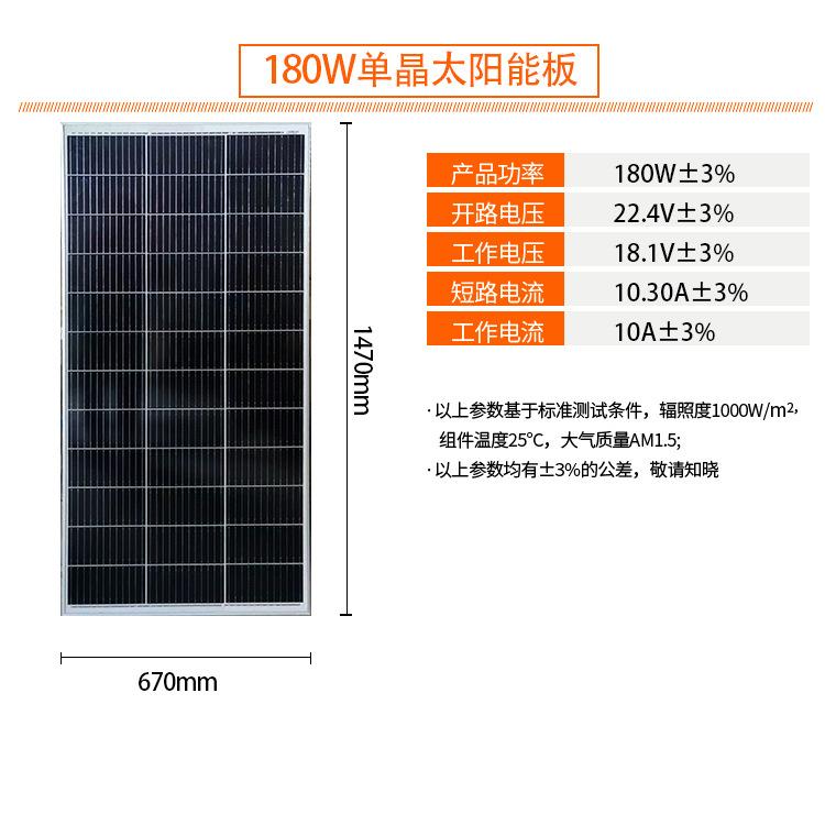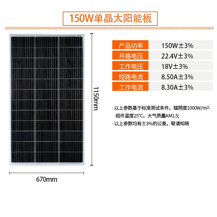 150w single crystal 1150*670*30mm (18v charging 12v battery), 180w single crystal 1470*670*35mm (18v charging 12v battery)