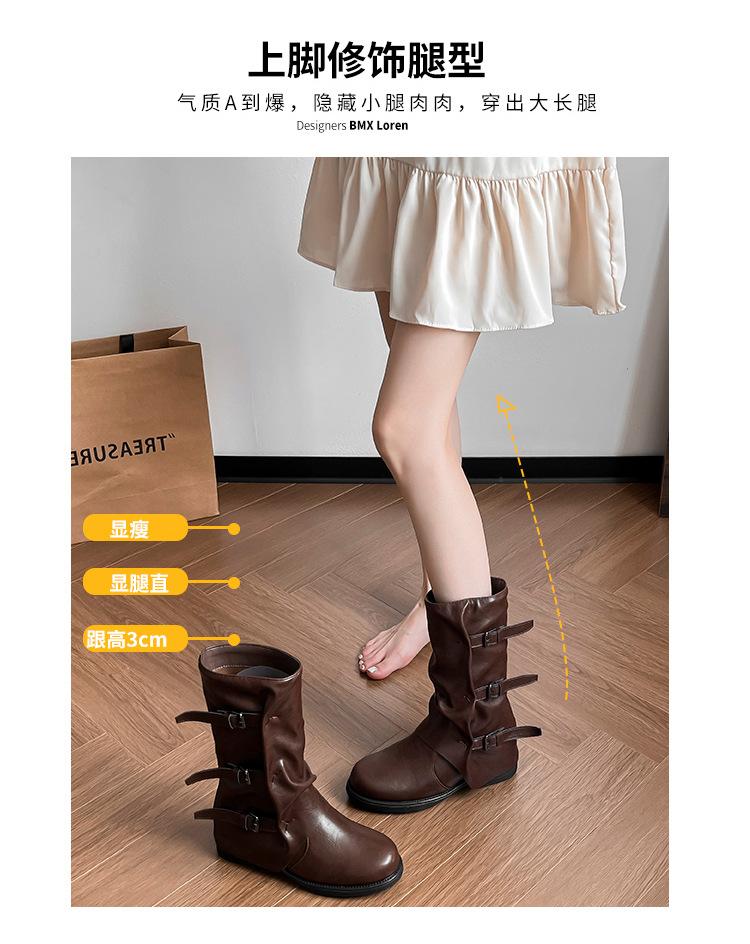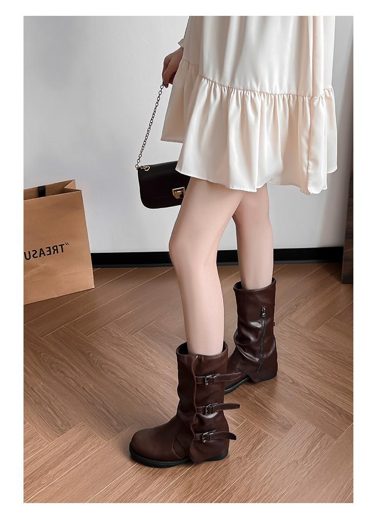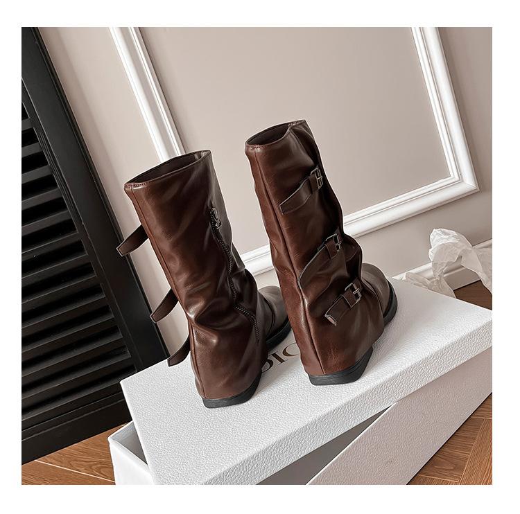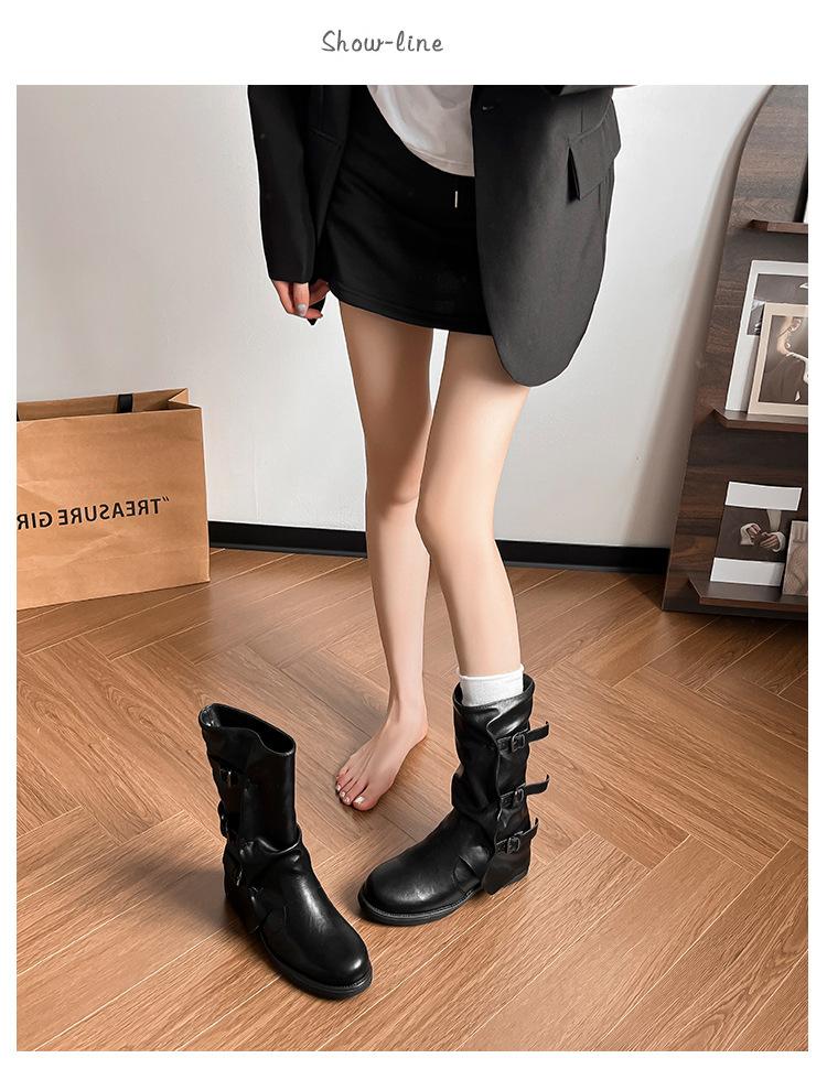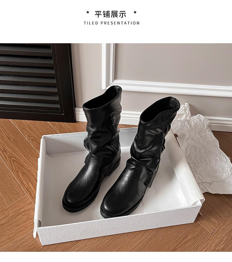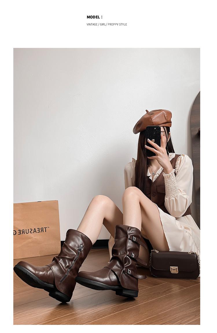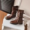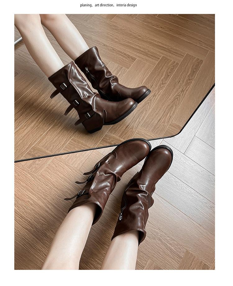 Botas con hebilla de cinturón de viento y tierra baldía, otoño e invierno 2024, nuevas botas vaqueras occidentales de tubo medio retro, botas plisadas para mediana edad