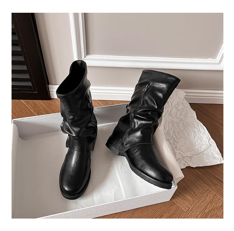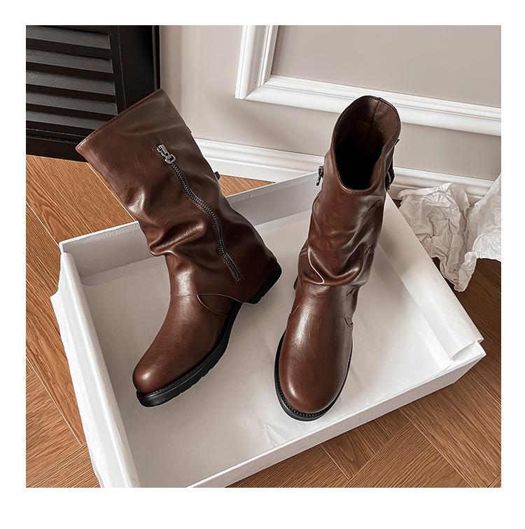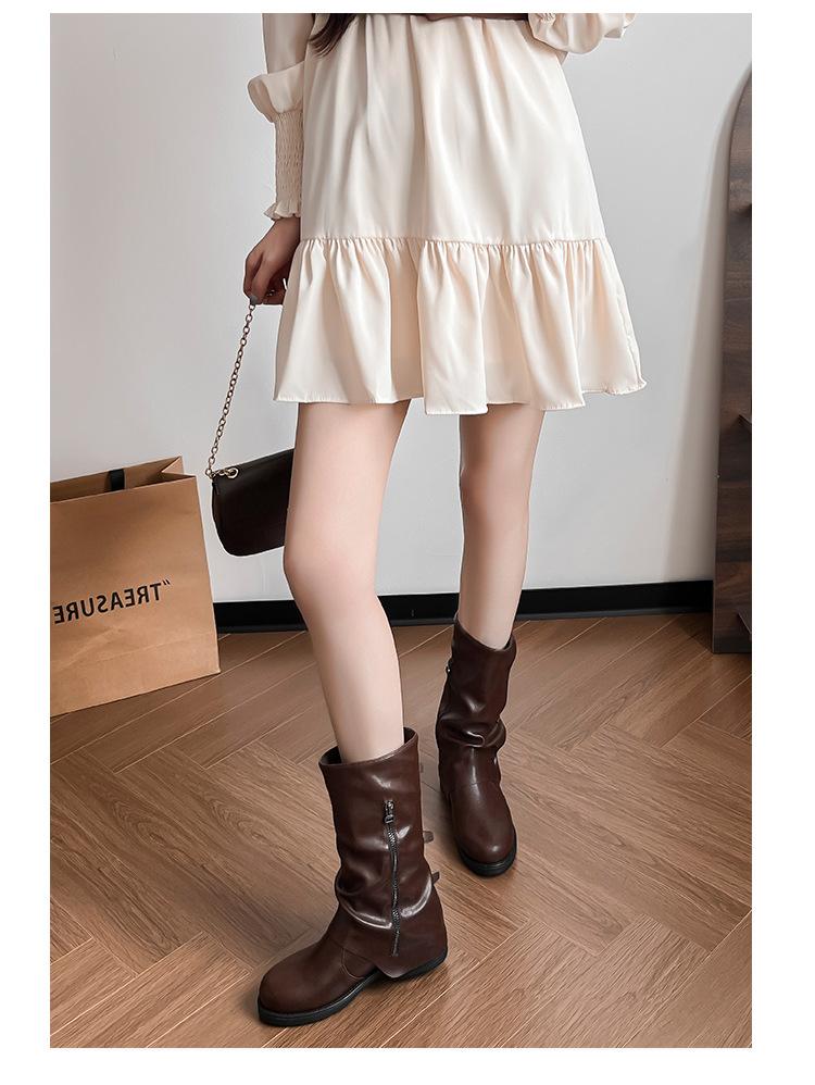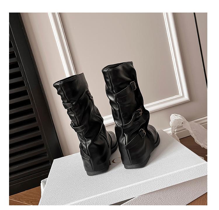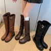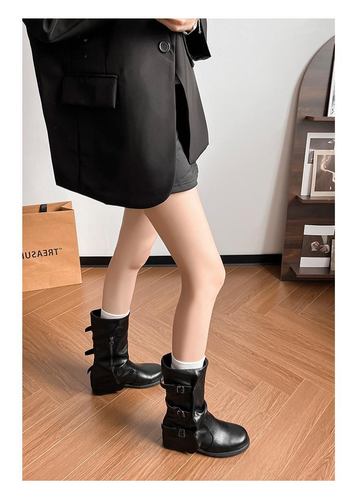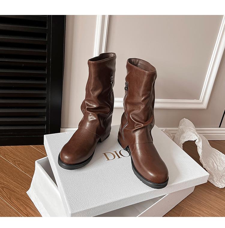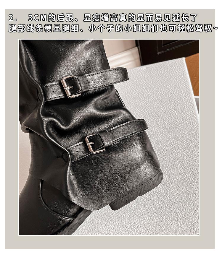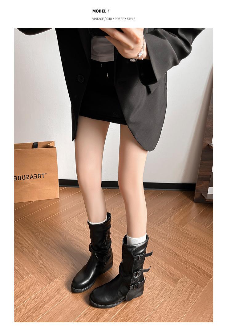 Botas con hebilla de cinturón de viento y tierra baldía, otoño e invierno 2024, nuevas botas vaqueras occidentales de tubo medio retro, botas plisadas para mediana edad