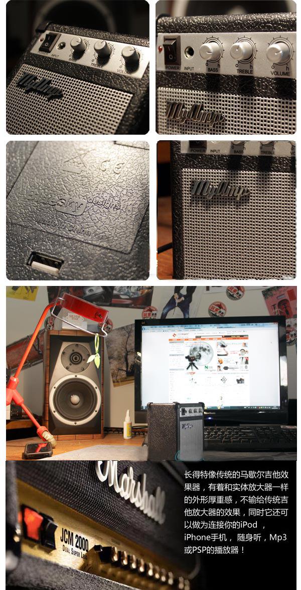Incluso su forma es inusual, con una textura pesada y una gran cantidad de materiales metálicos en su interior, lo que permite que, cuando los graves son muy potentes, el altavoz no vibre demasiado, garantizando así el efecto de sonido. Su aspecto es idéntico al de un pedal de efectos de guitarra tradicional, con la misma apariencia robusta que un amplificador físico, y su efecto no es inferior al de un amplificador de guitarra tradicional. Además, también puede utilizarse como conexión a su...iPod,iPhoneTeléfono móvil, Walkman,Mp3oPSPJugador con estándar3,5 mmMinijack, solo pilas3Festival7Funciona con pilas (pilas no incluidas)USBSalida del puerto.