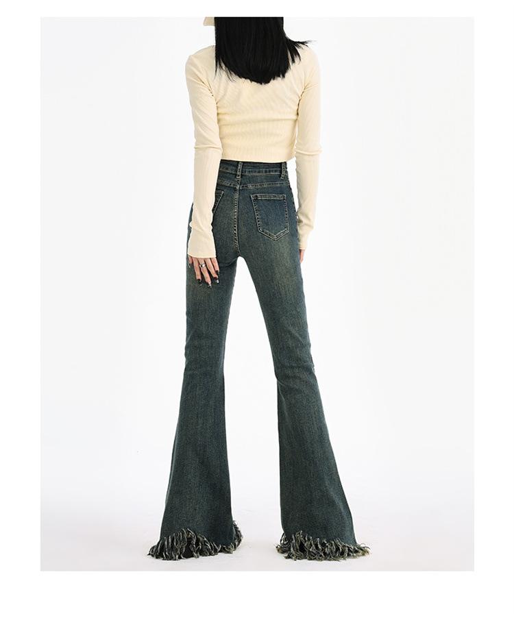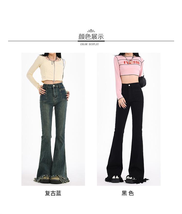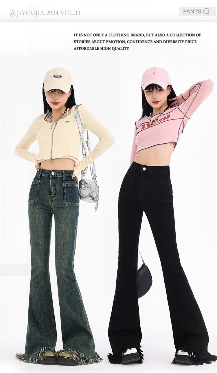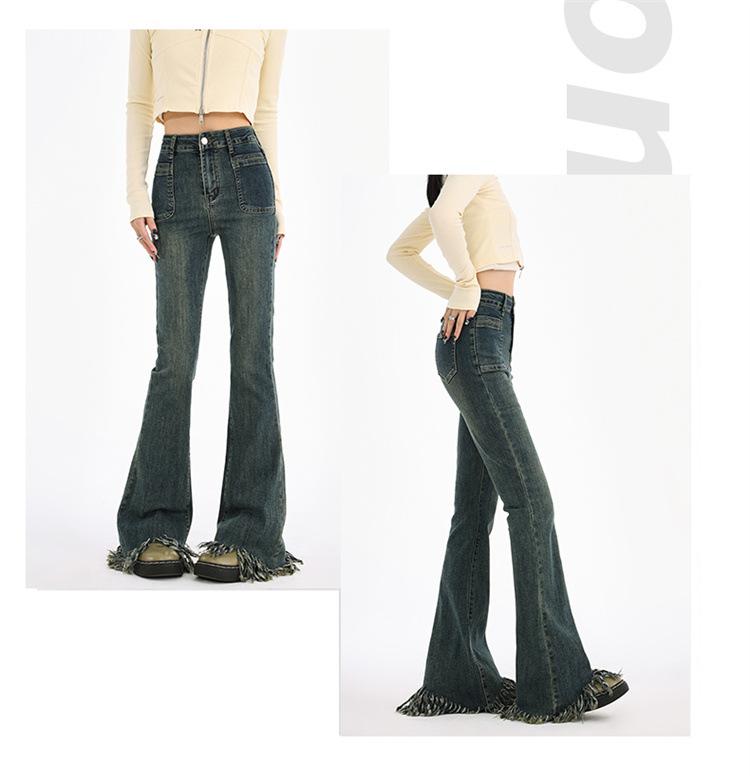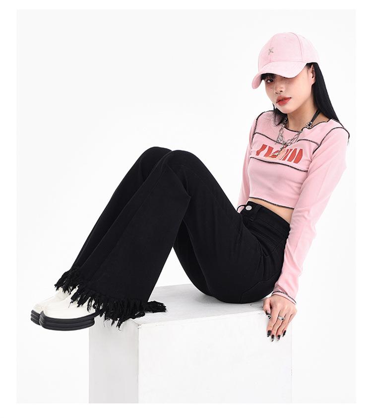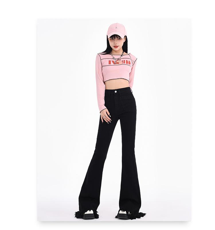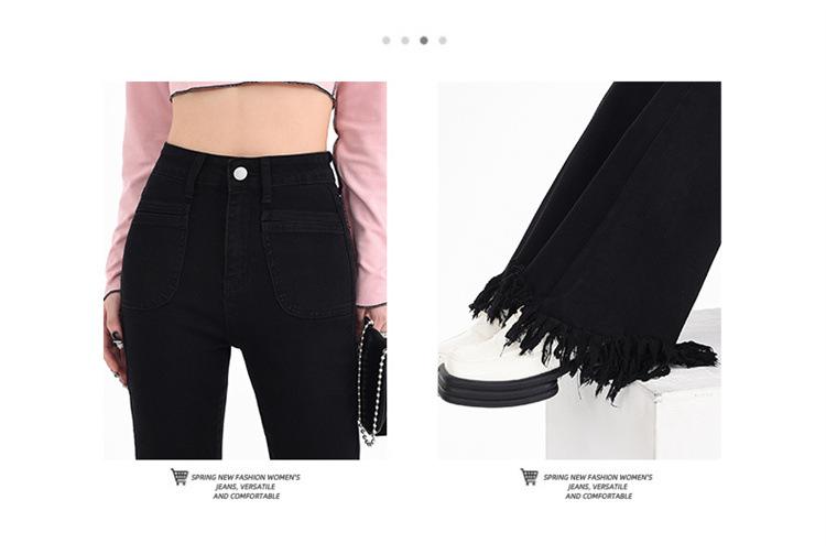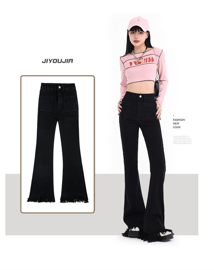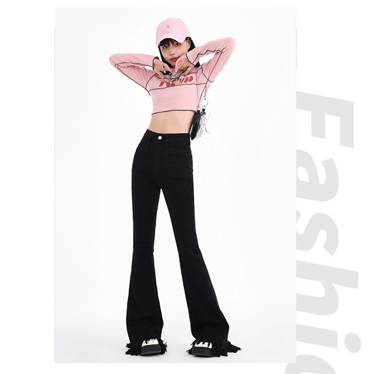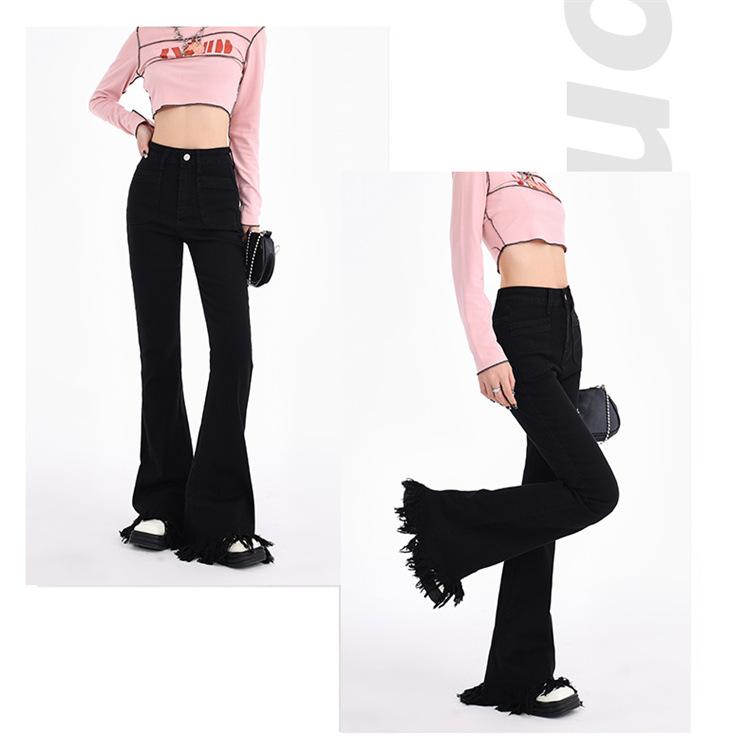 Jeans Negros Microacampanados para Mujer Nuevo Diseño de Borlas Cintura Alta Adelgazantes Pantalones Trompeta para Otoño 2024