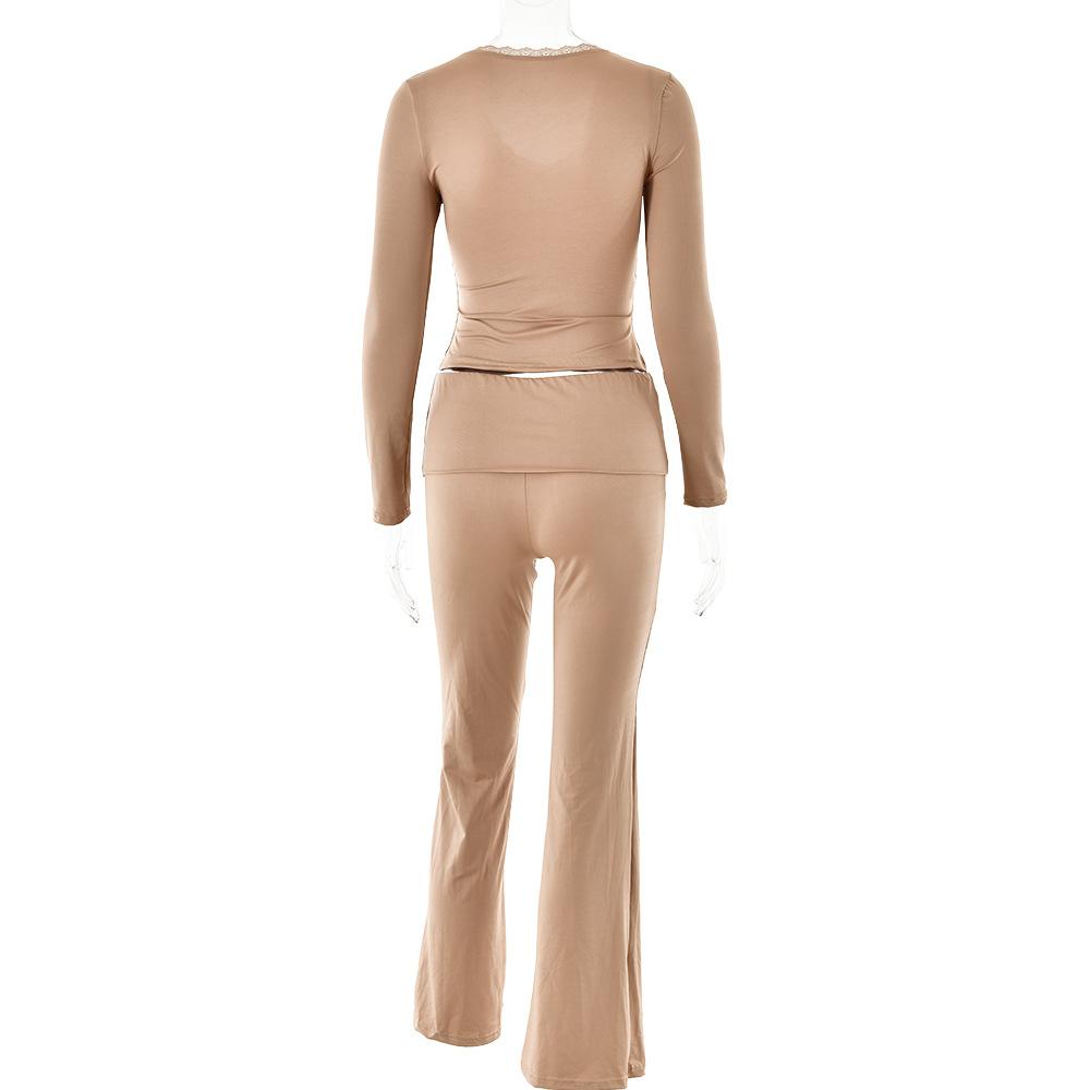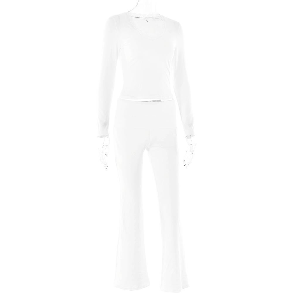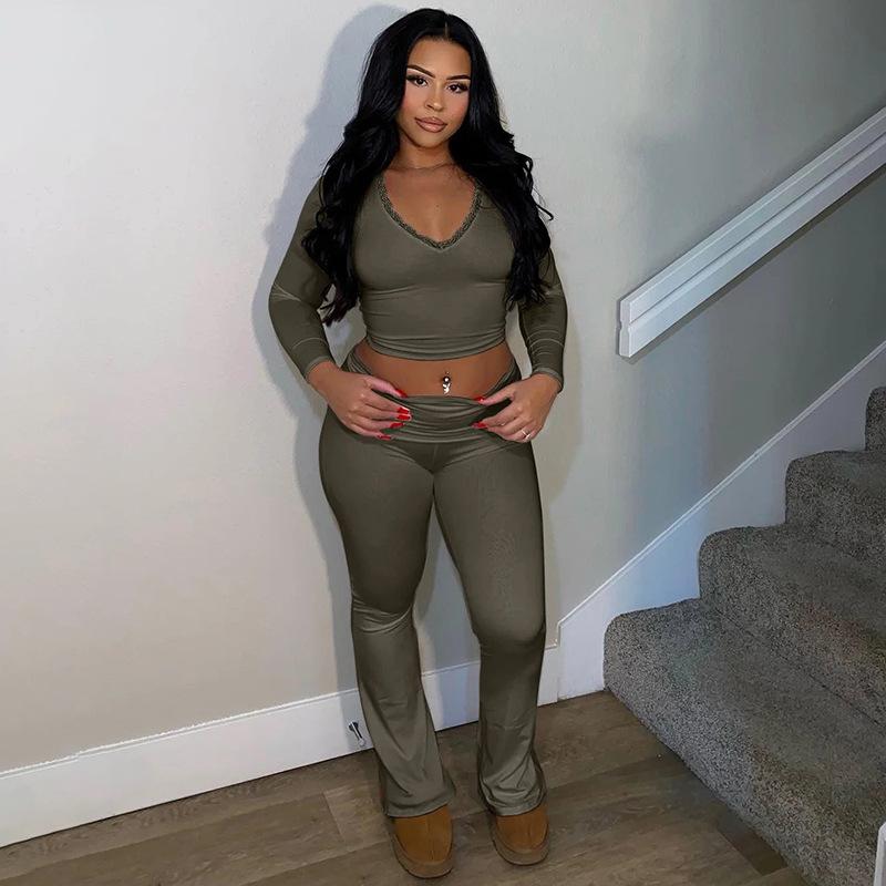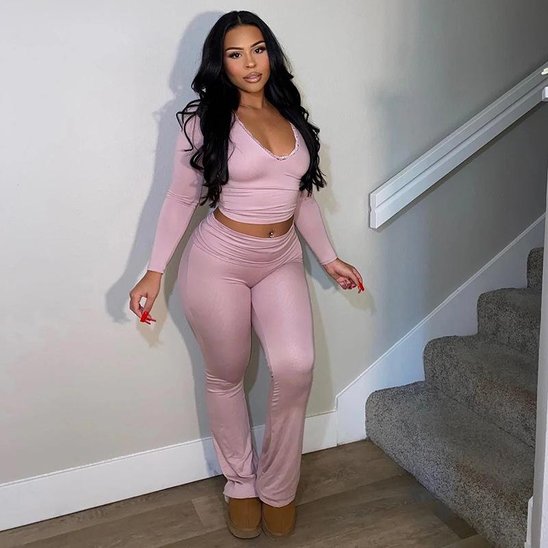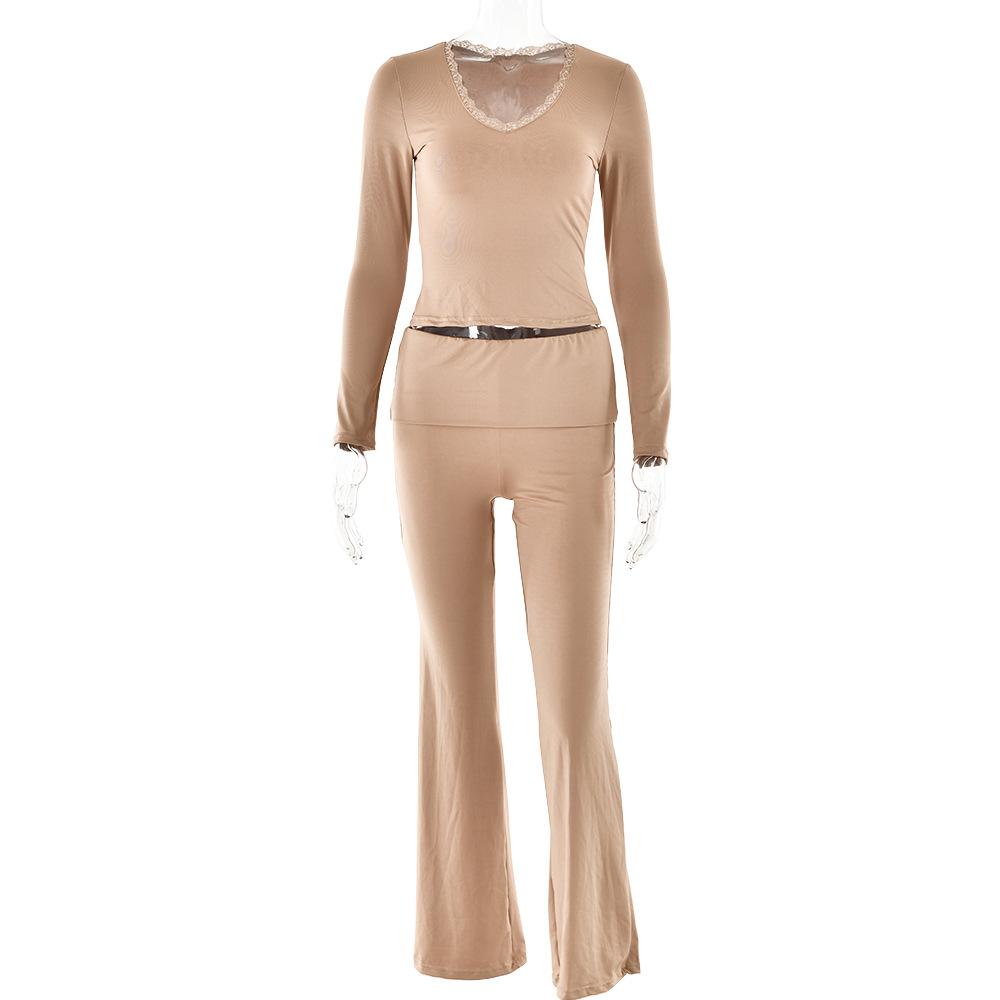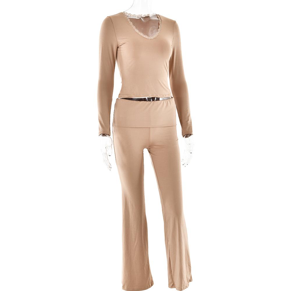 Traje Nuevo Más Vendido de Exportación Europea y Americana 2025 Sexy Slim Color Puro Cuello en V Ombligo Descubierto Pantalones Slim Conjunto de Dos Piezas para Mujer