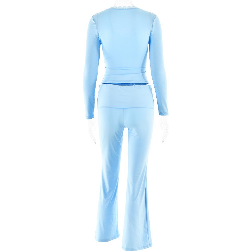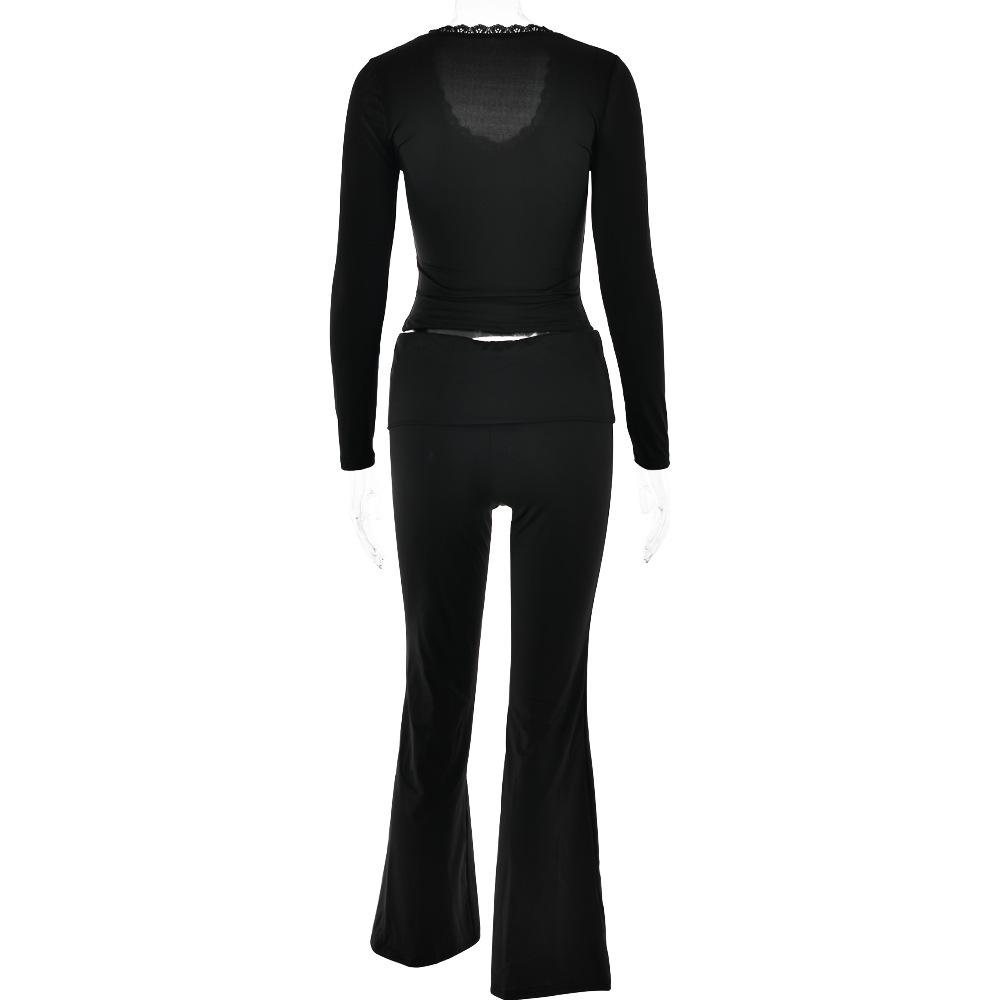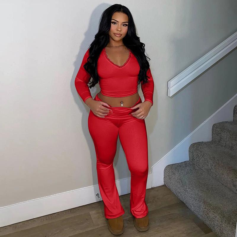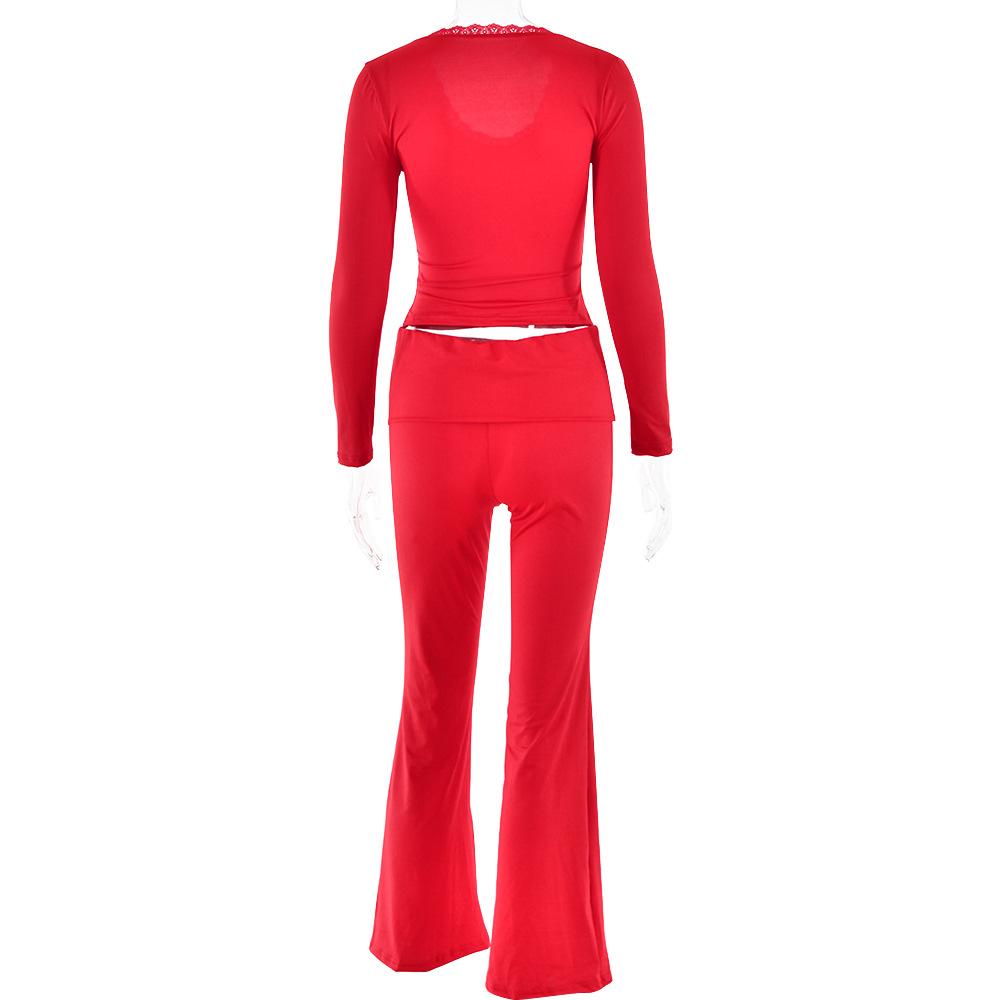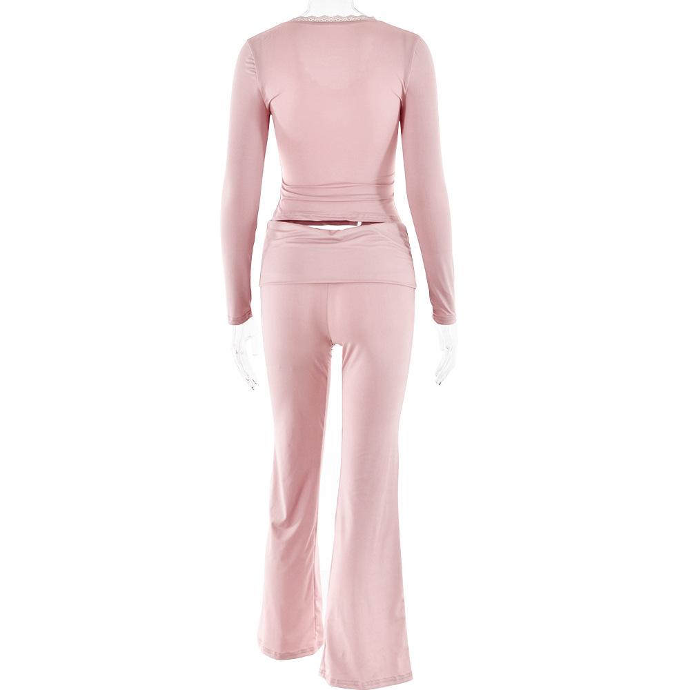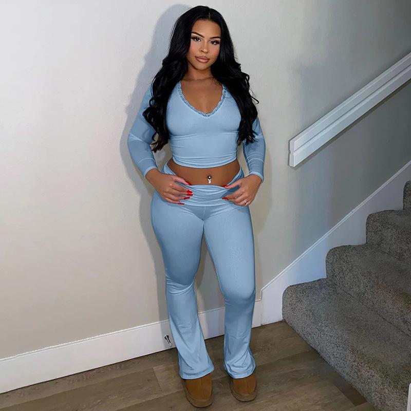 Traje Nuevo Más Vendido de Exportación Europea y Americana 2025 Sexy Slim Color Puro Cuello en V Ombligo Descubierto Pantalones Slim Conjunto de Dos Piezas para Mujer