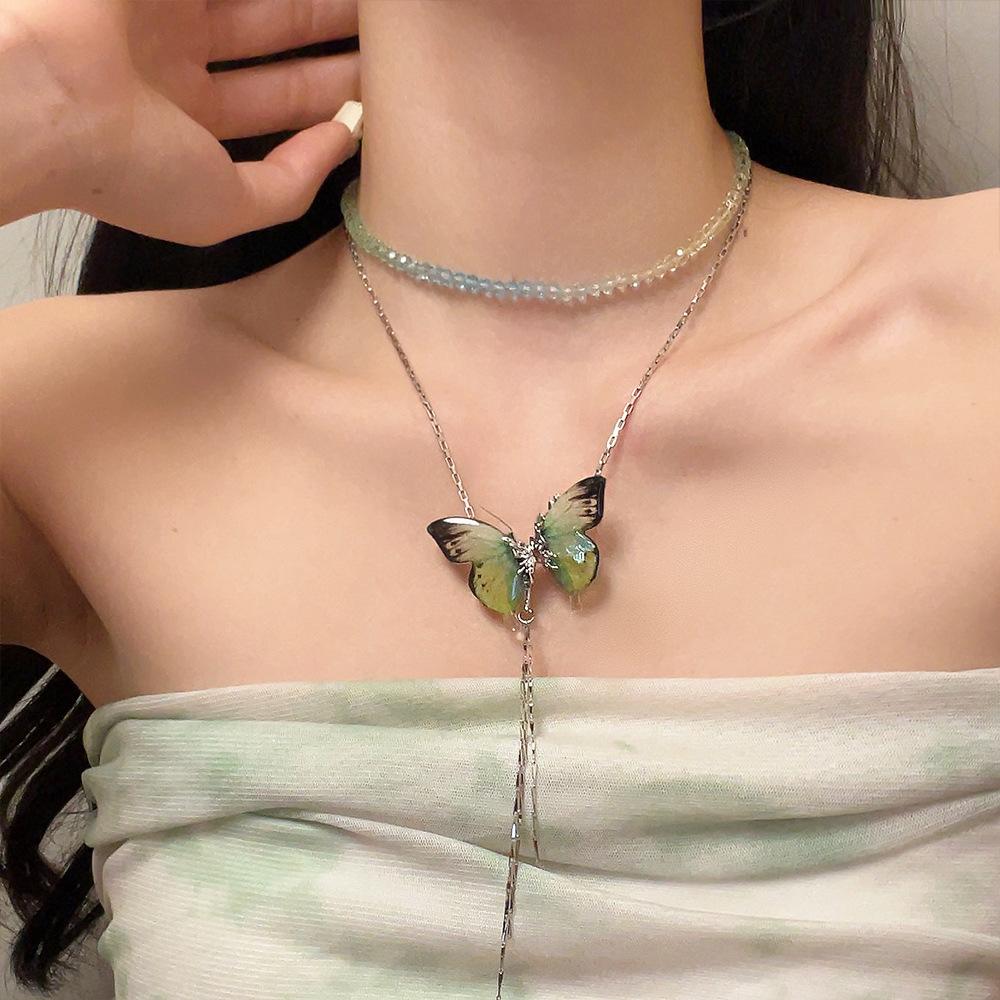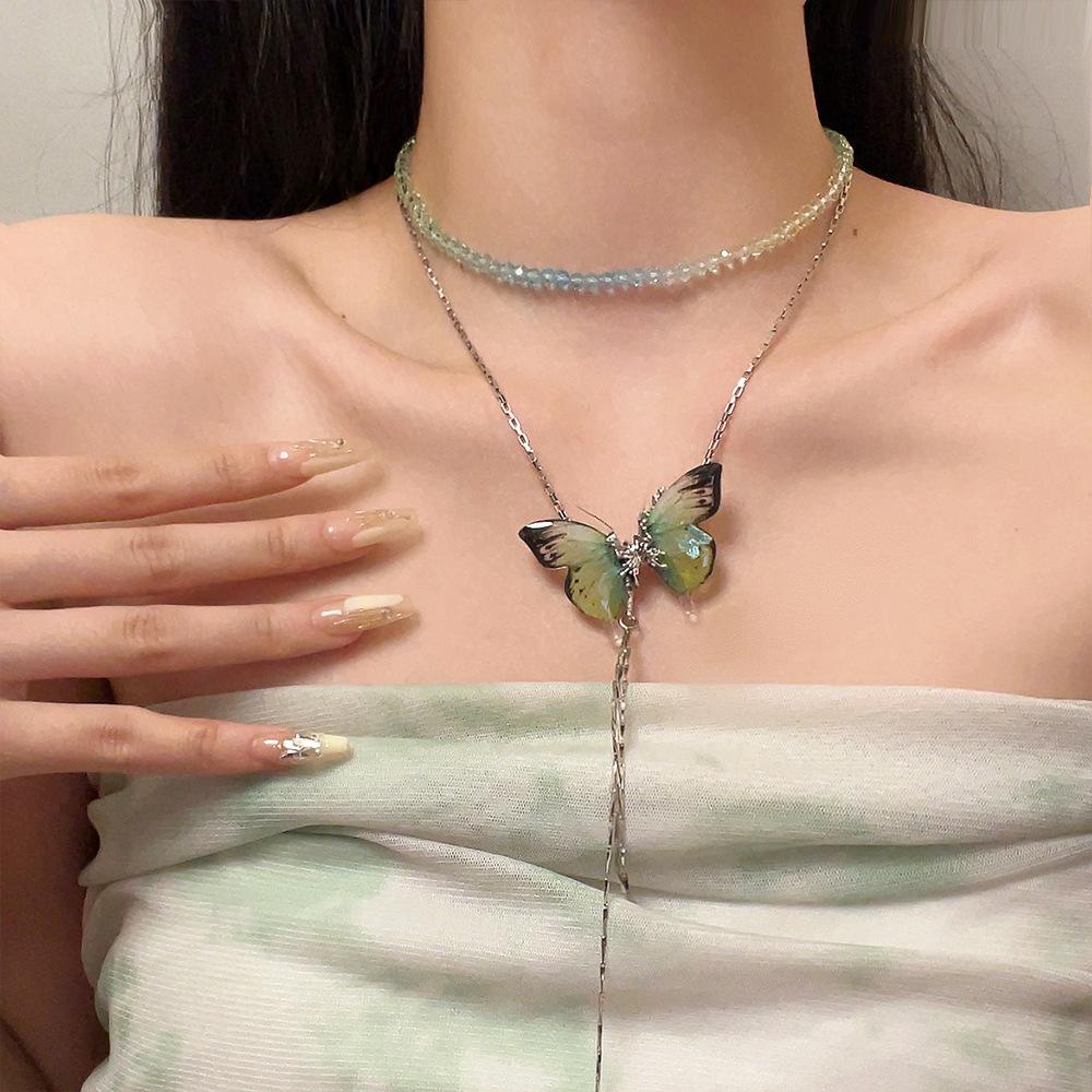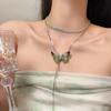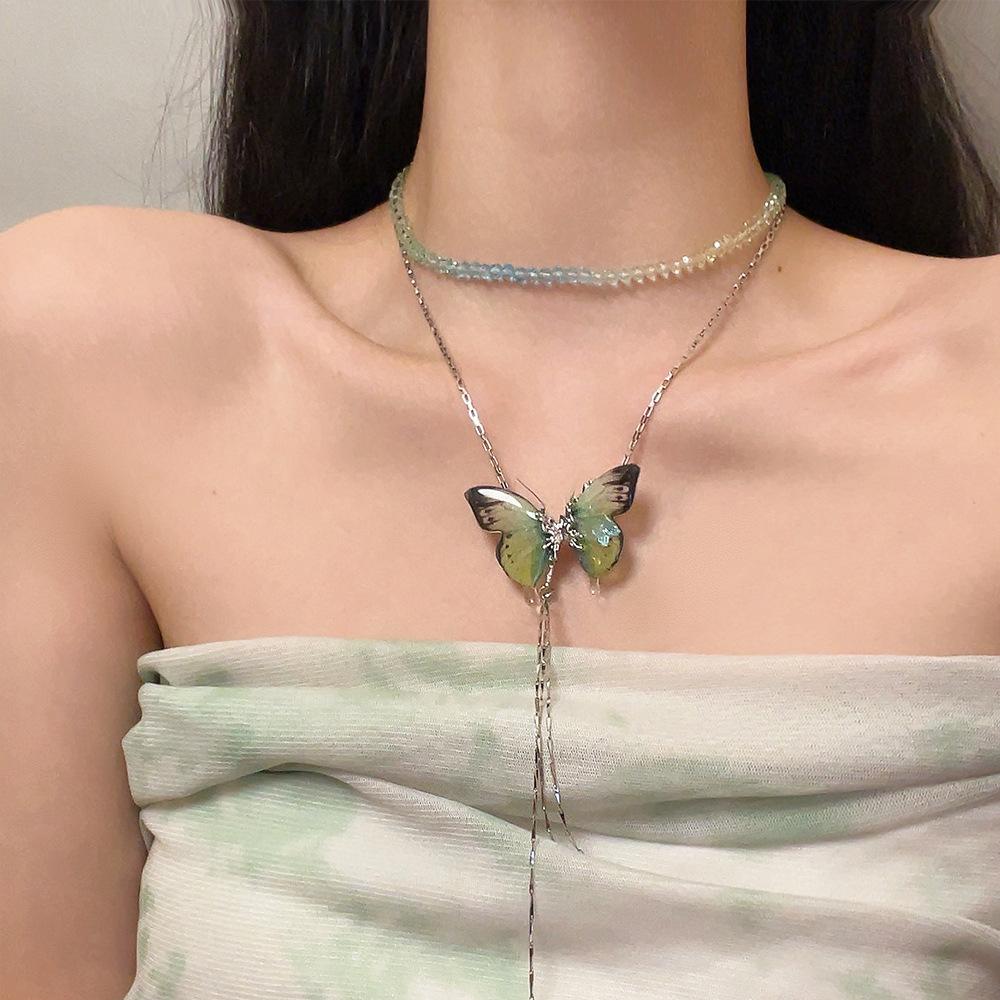 Collar con colgante de borla de mariposa verde de nicho, elegante y moderno, para mujer, de alta calidad, combinable con todo, con múltiples capas y cuentas en la clavícula.