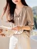 Nueva Camisa de Mujer de Estilo Chino con Cuello en V y Manga Abullonada 2024 Primavera Nueva Elegante Retro Estilo Nacional Texturizada de Manga Larga para Mujer