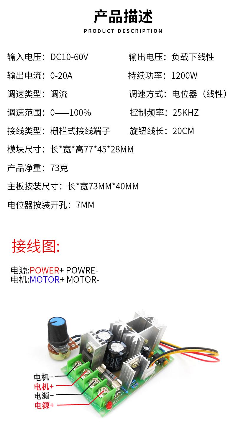 Controlador de velocidad de motor de CC de 12 V, 24 V, 36 V y 48 V, módulo de accionamiento de alta potencia, controlador PWM, regulador de corriente de 20 A.