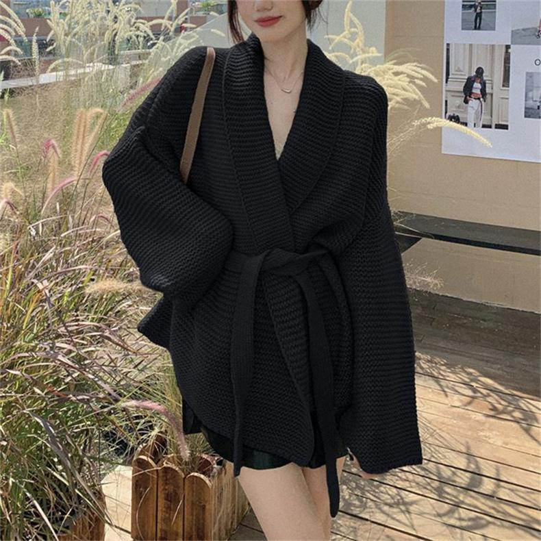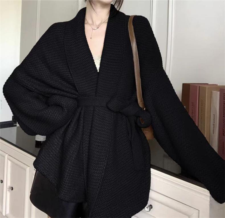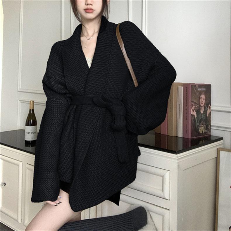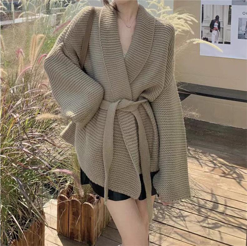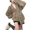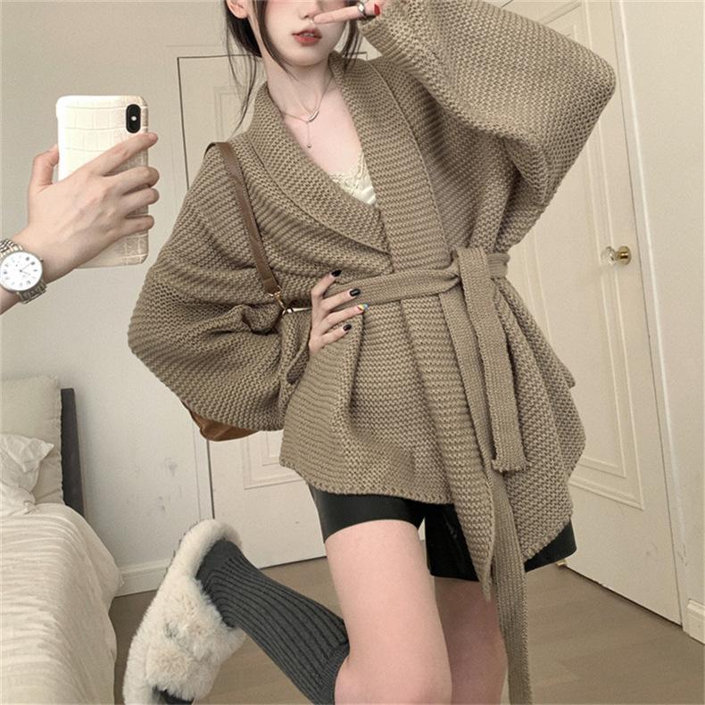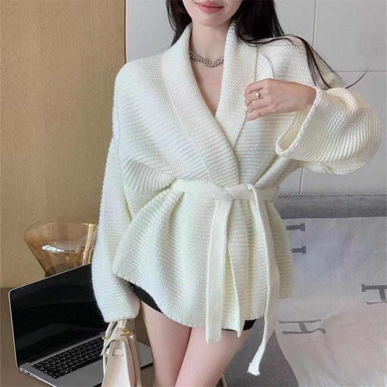 Chaqueta Cárdigan de Punto de Cuello en V de Alta Gama Francesa para Mujer Otoño e Invierno 2025 Estilo Relajado Cintura con Cordones Suéter de Longitud Media