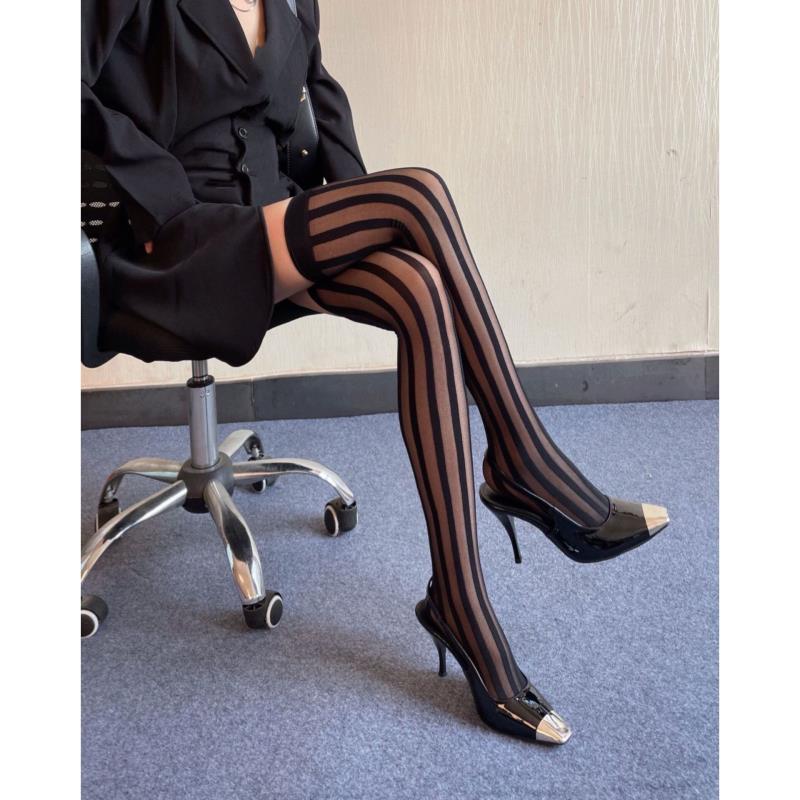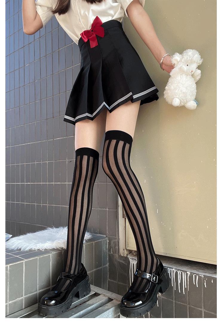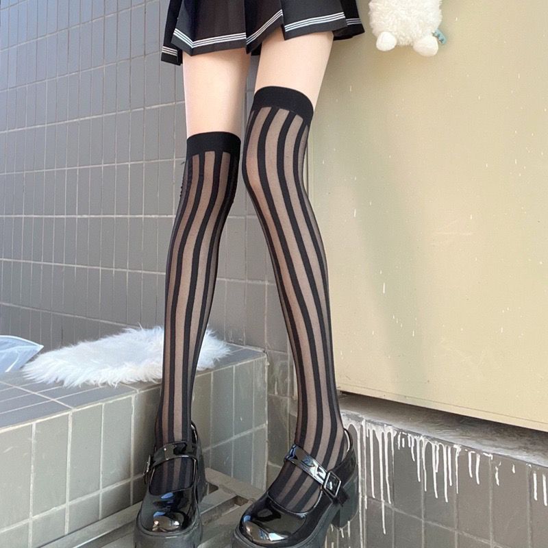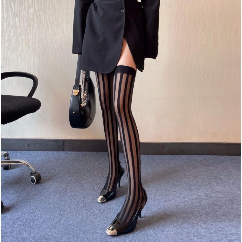 Medias sexis de rayas verticales largas hasta el muslo, transparentes y con puntadas sexis, medias negras para mujer
