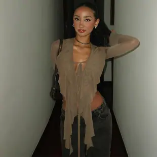 Ropa de Mujer Transfronteriza Europea y Americana 2025 Invierno Amazon Nuevo Cuello en V Malla con Volantes Sexy Cárdigan Top de Manga Larga