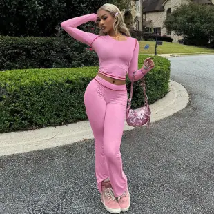 Moda Europea y Americana para Mujer 2025 Invierno Nuevo Manga Larga Cuello Redondo Color Sólido Ajustado Costuras Inversas Pantalón Largo Conjunto de Dos Piezas Venta al por Mayor para Mujer