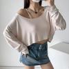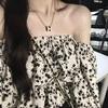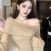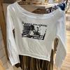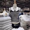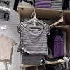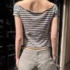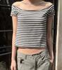 Camiseta de manga corta con hombros descubiertos y rayas blancas y negras estilo americano BM para mujer, top corto ajustado de verano con hombros descubiertos.