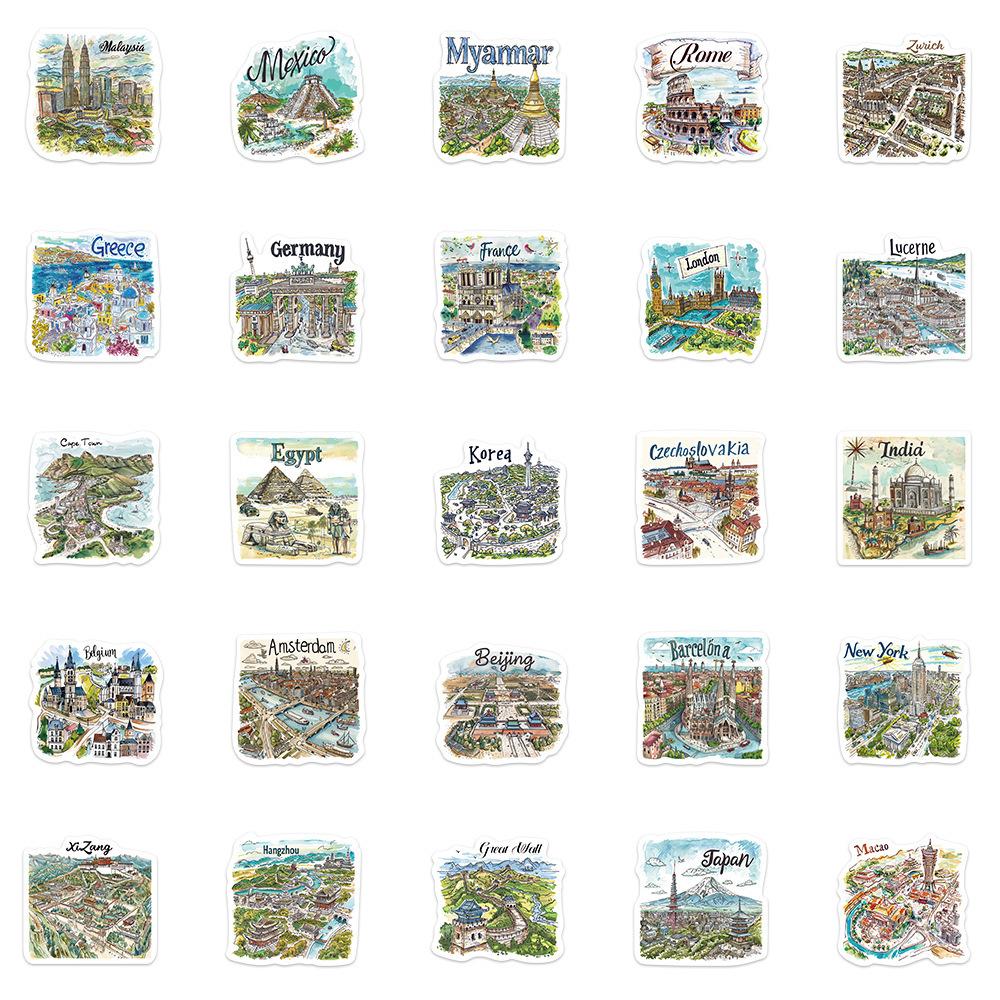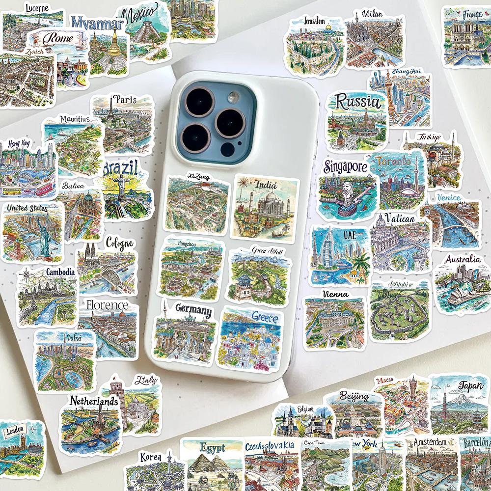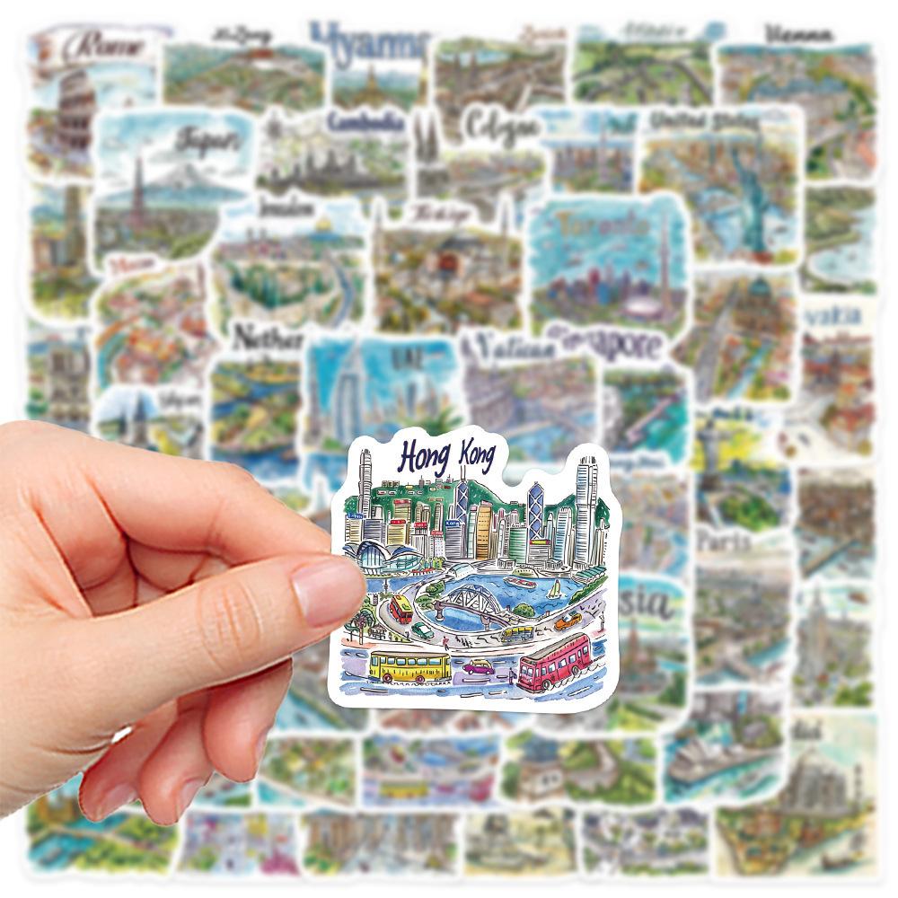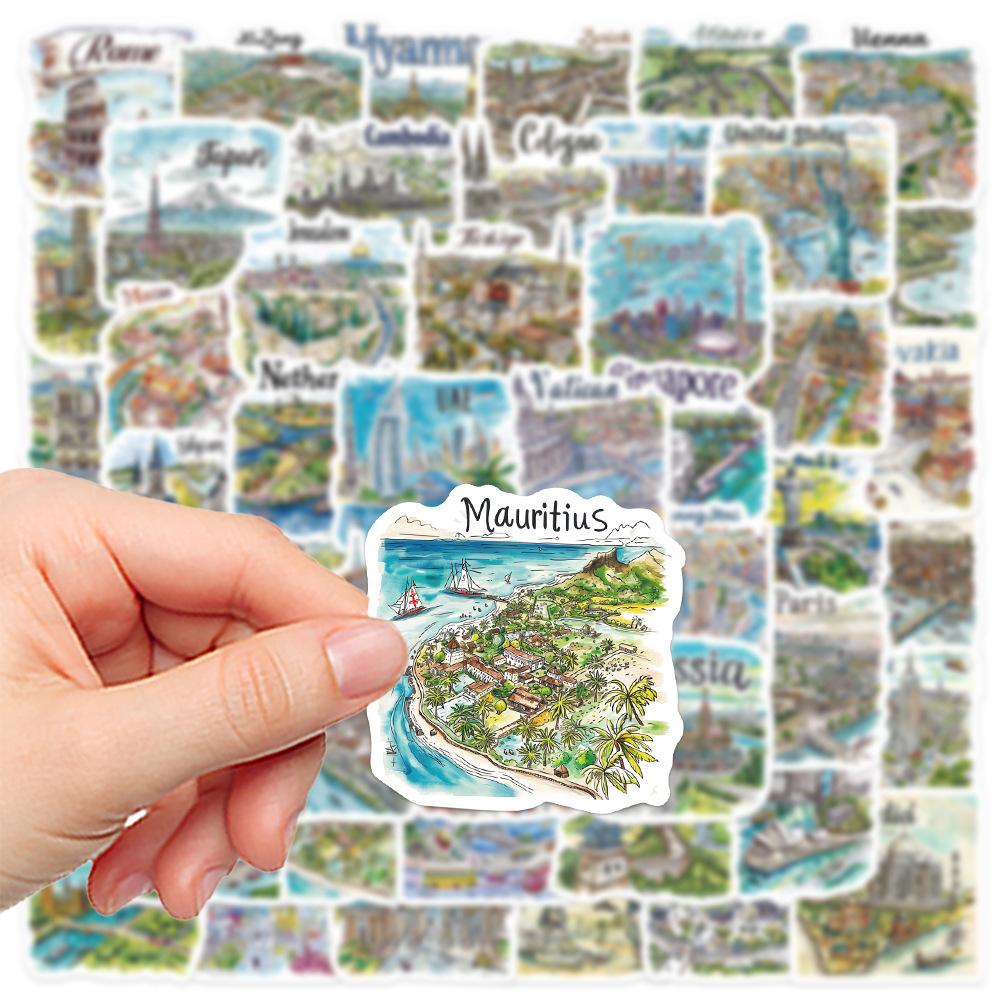 50 pegatinas de mapa de viaje pintadas a mano, pequeñas y frescas, para decorar portátiles, maletas, libros de mano y pegatinas transfronterizas.