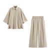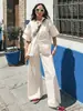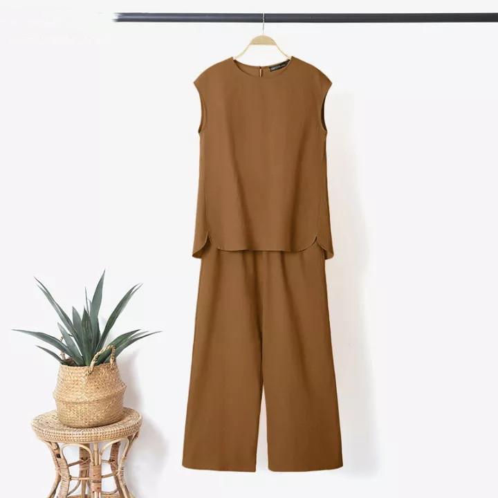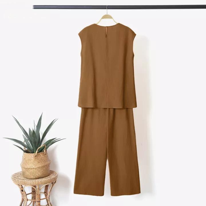 Europeo y Americano Transfronterizo 2024 Traje de 2 Piezas de Verano para Mujer de Talla Grande Color Puro Chaleco de Cuello Redondo Pantalones Básicos de Pierna Ancha
