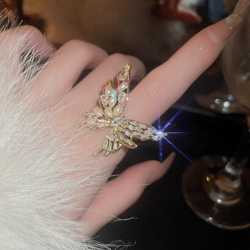 Anillo de perla de mariposa de lujo ligero, anillo abierto, temperamento, diseño de nicho, anillo de dedo índice de alta gama, accesorios de moda y versátiles