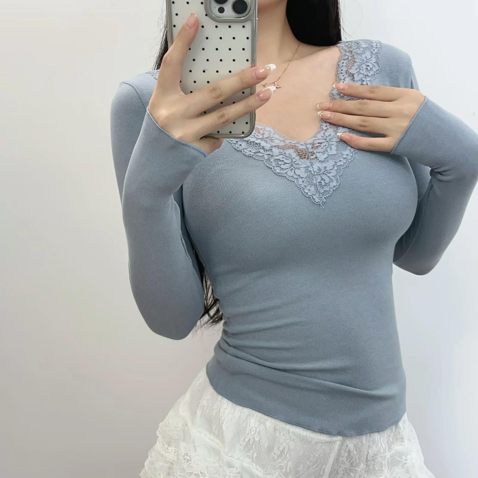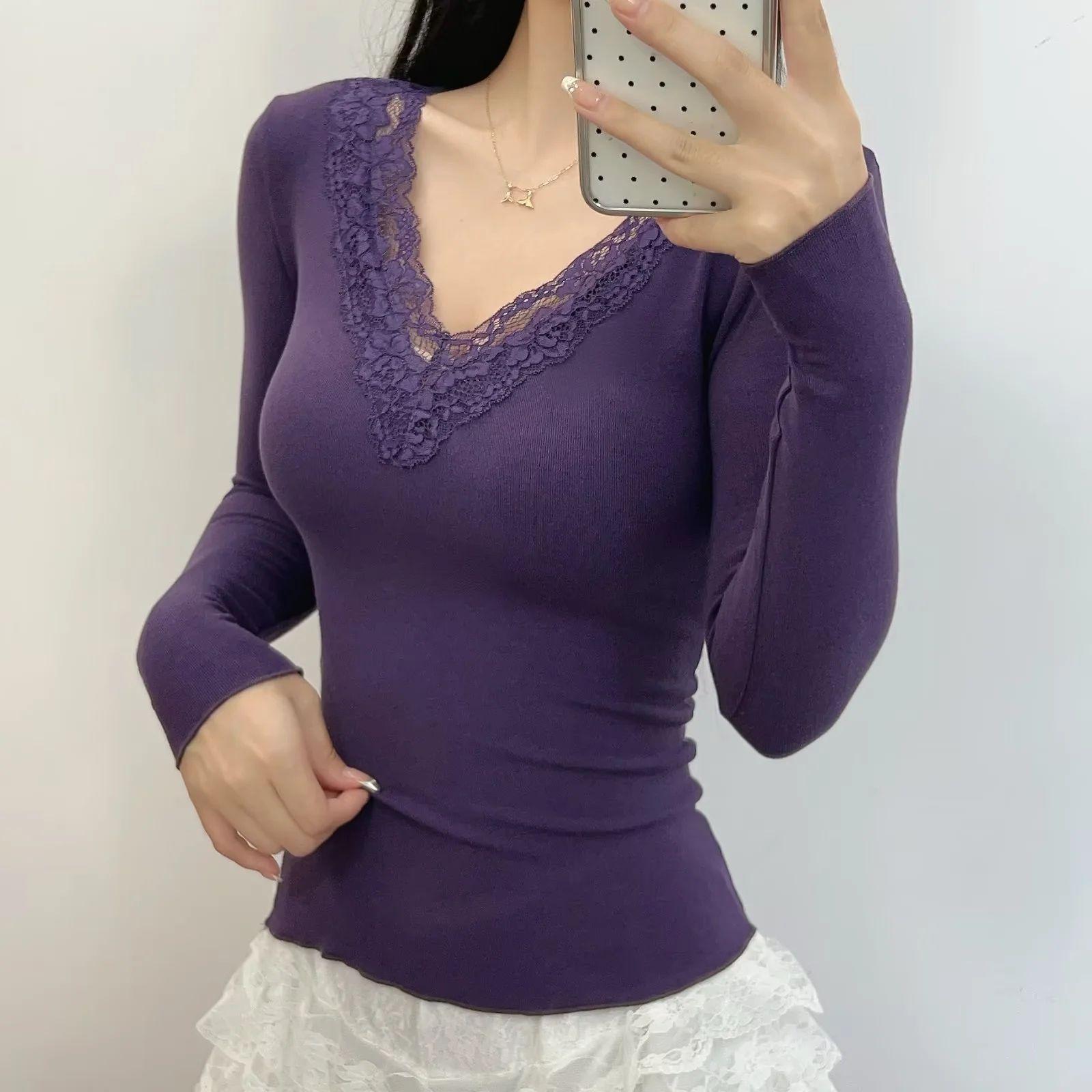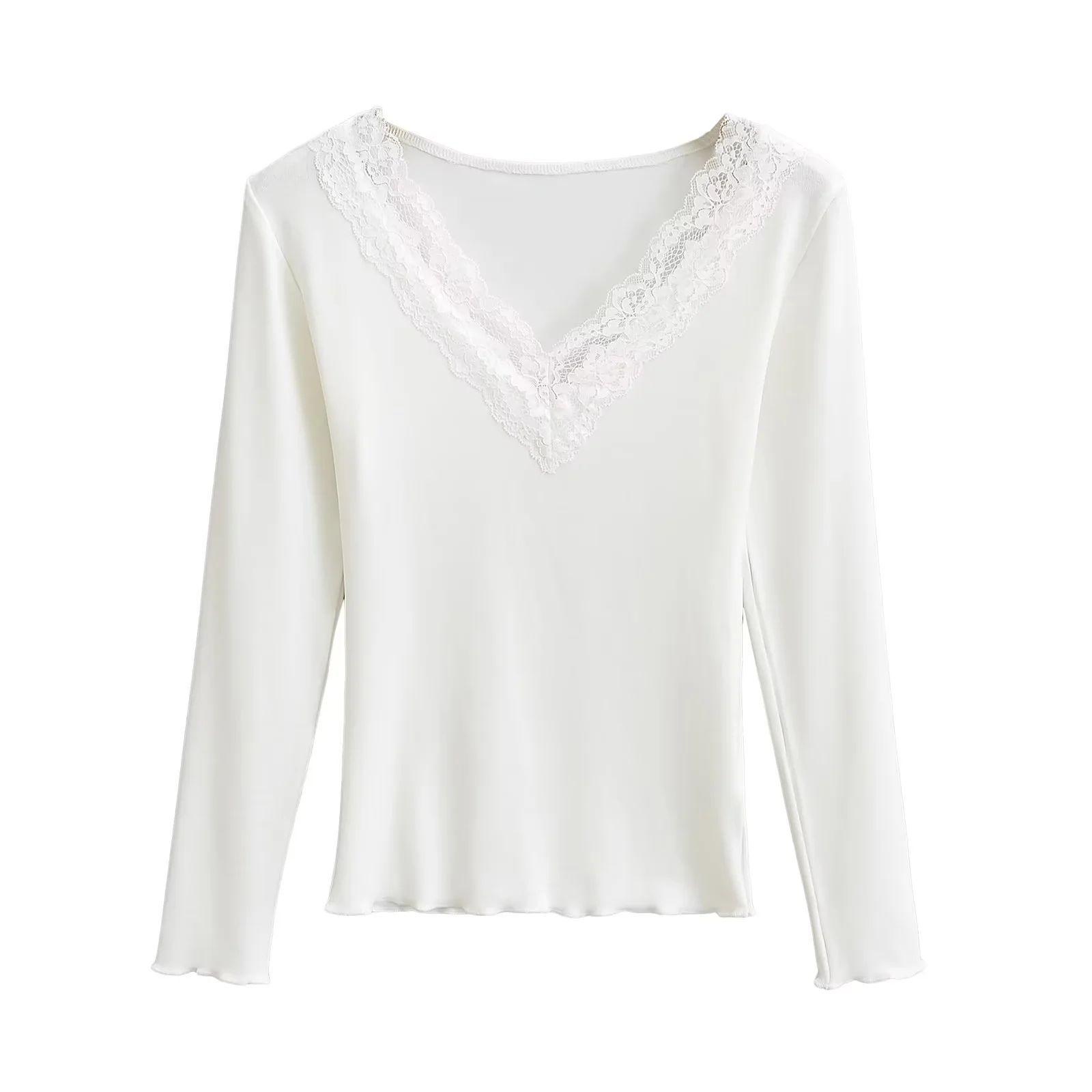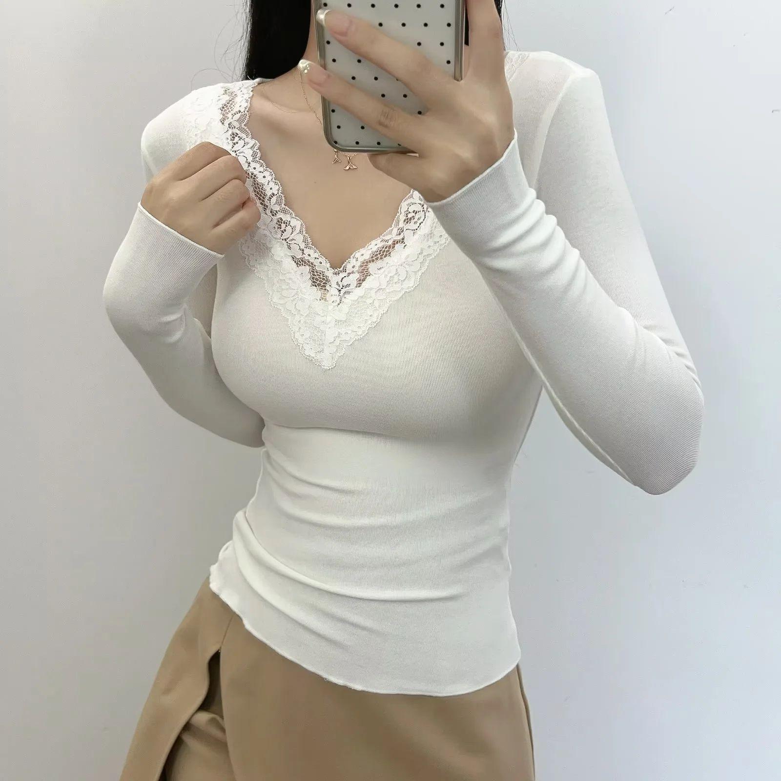Sexy y Estilo Puro Encaje con Costuras de Cuello en V Grande Manga Larga Otoño para Mujer Nuevo 2024 Camisa Básica Corta Ajustada Adelgazante