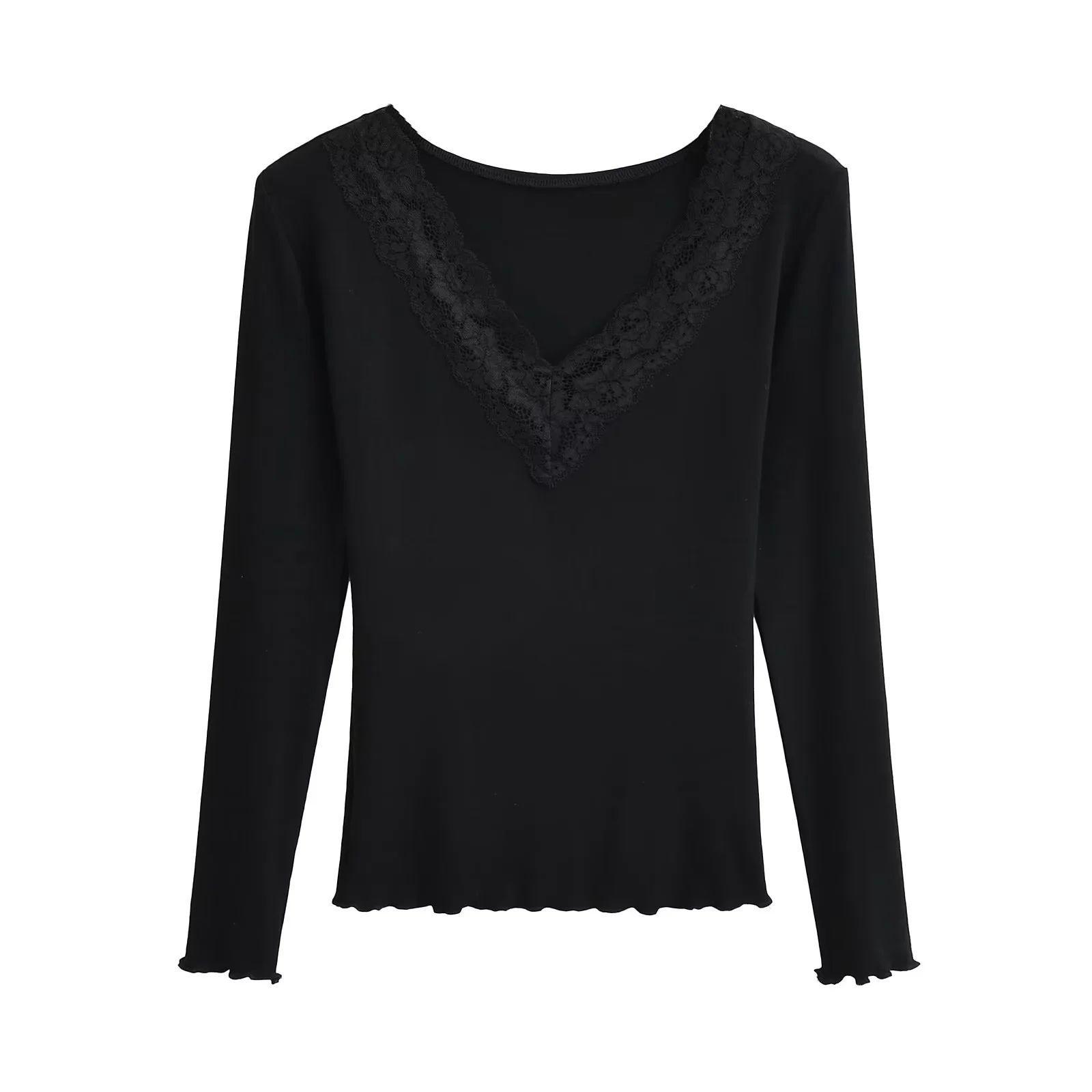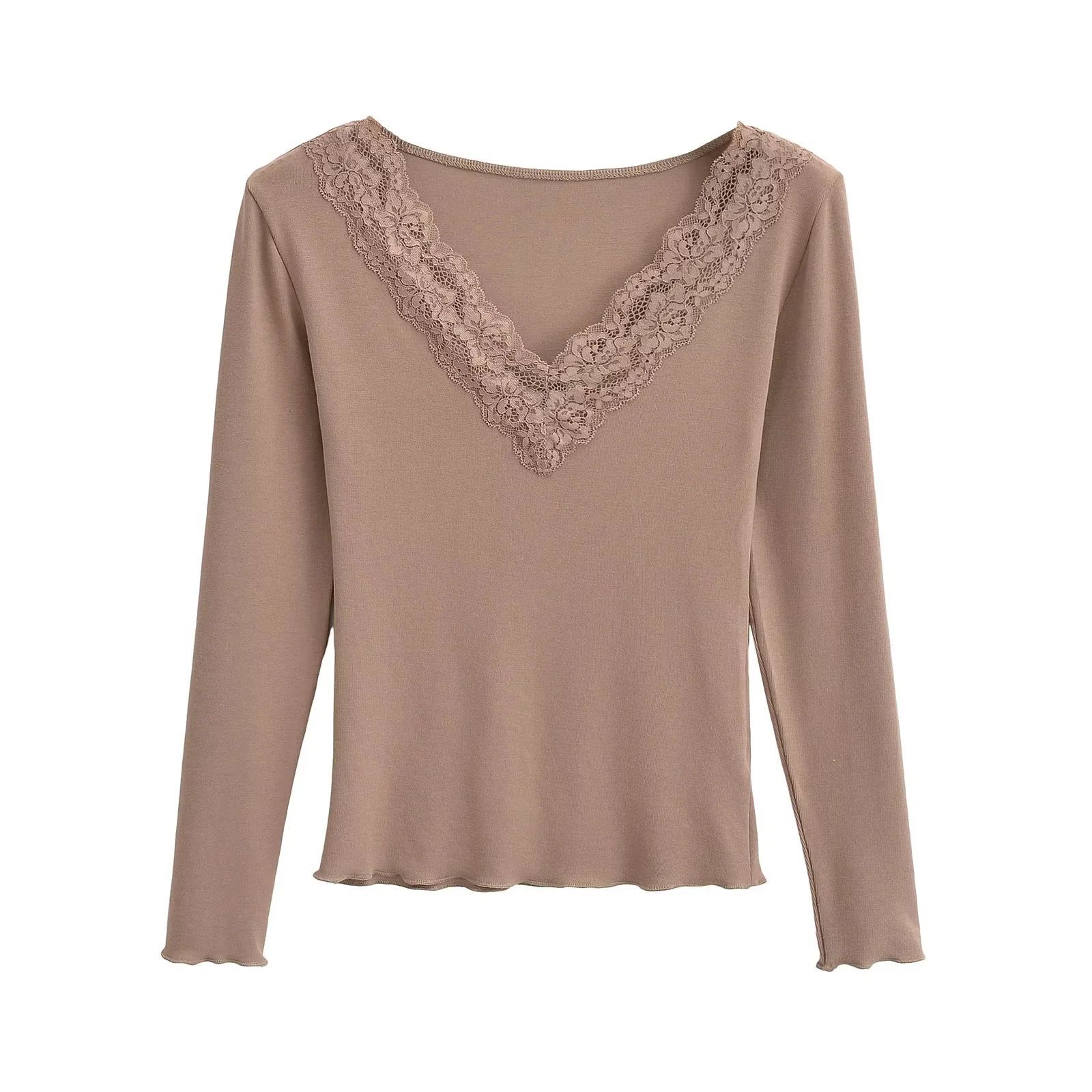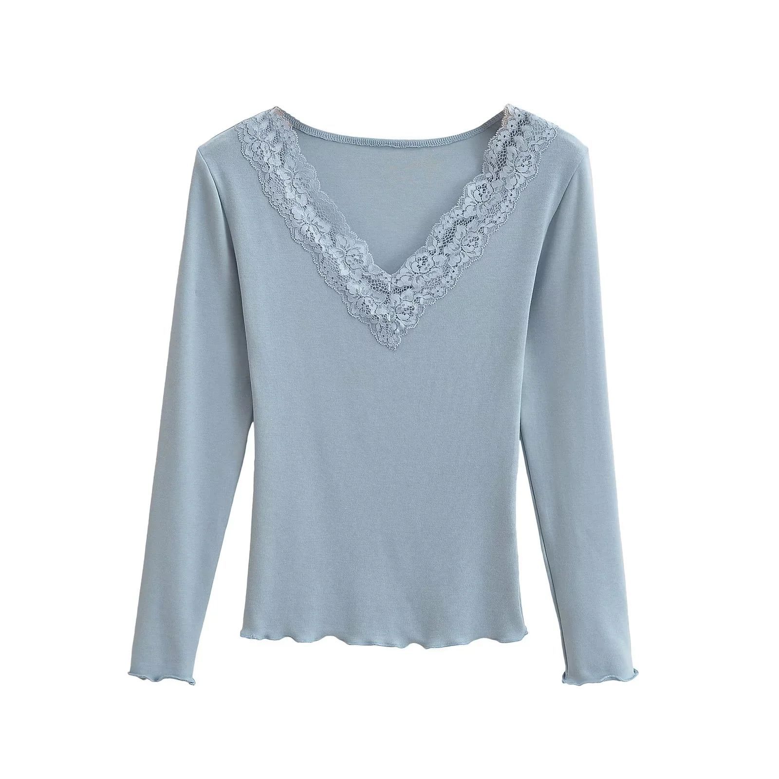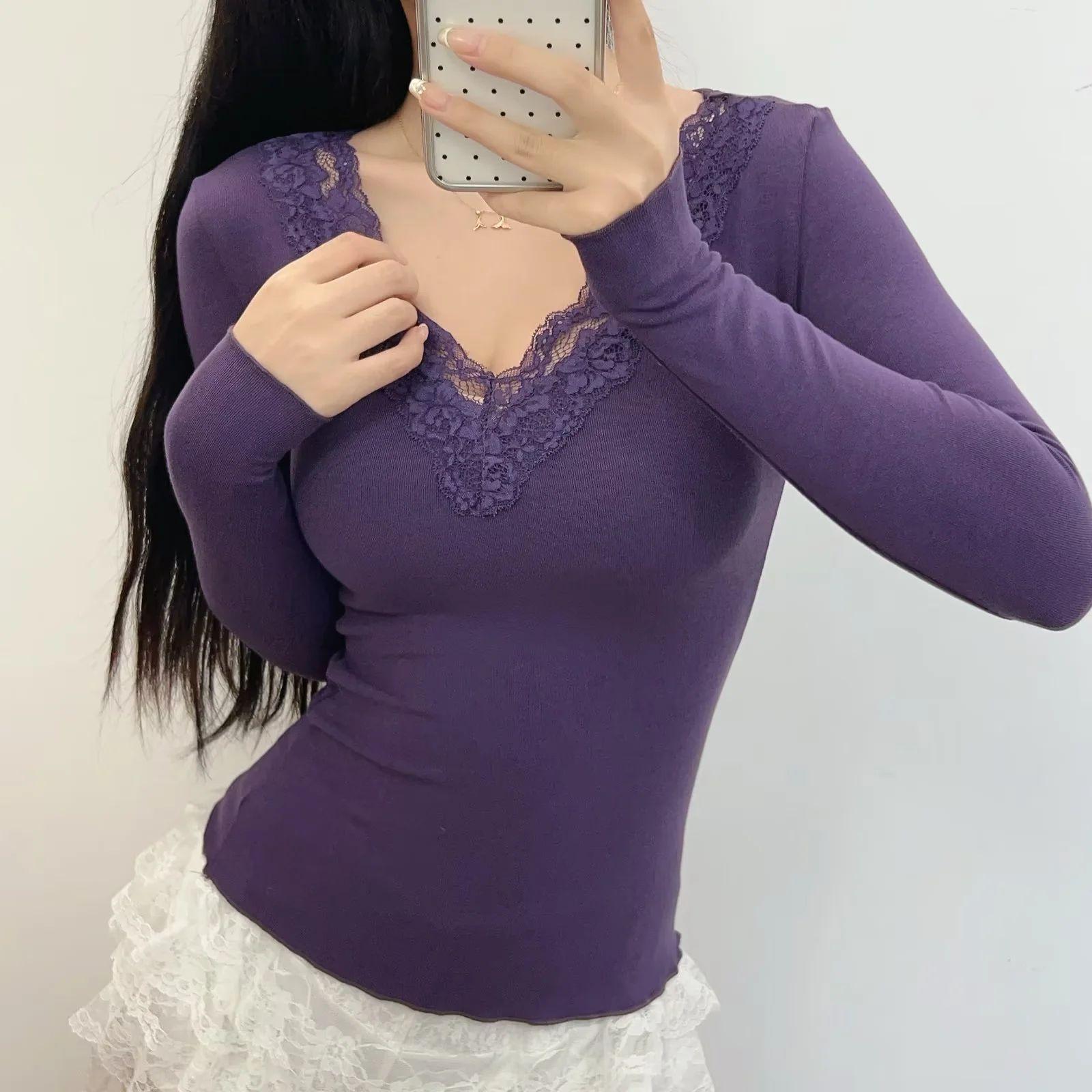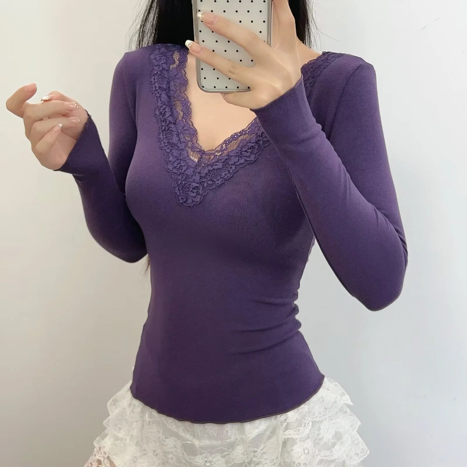 Sexy y Estilo Puro Encaje con Costuras de Cuello en V Grande Manga Larga Otoño para Mujer Nuevo 2024 Camisa Básica Corta Ajustada Adelgazante