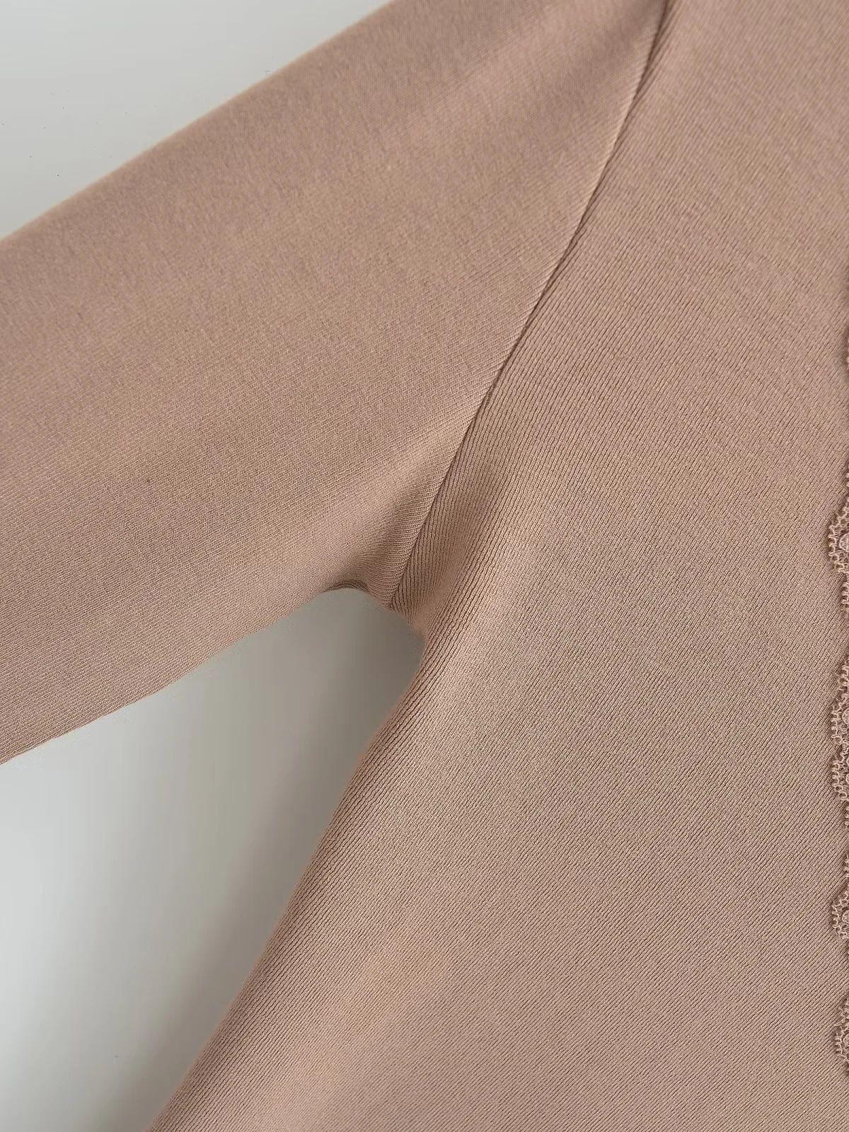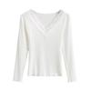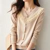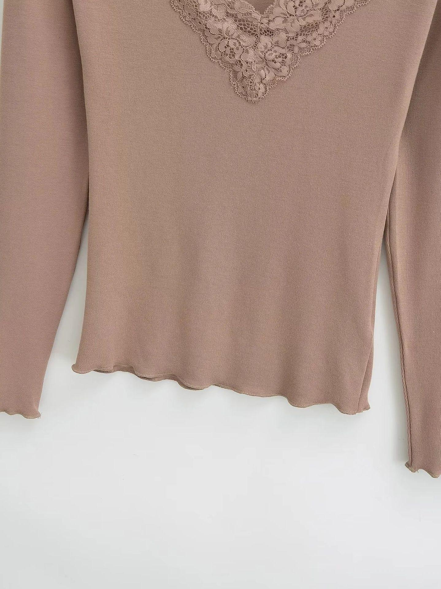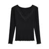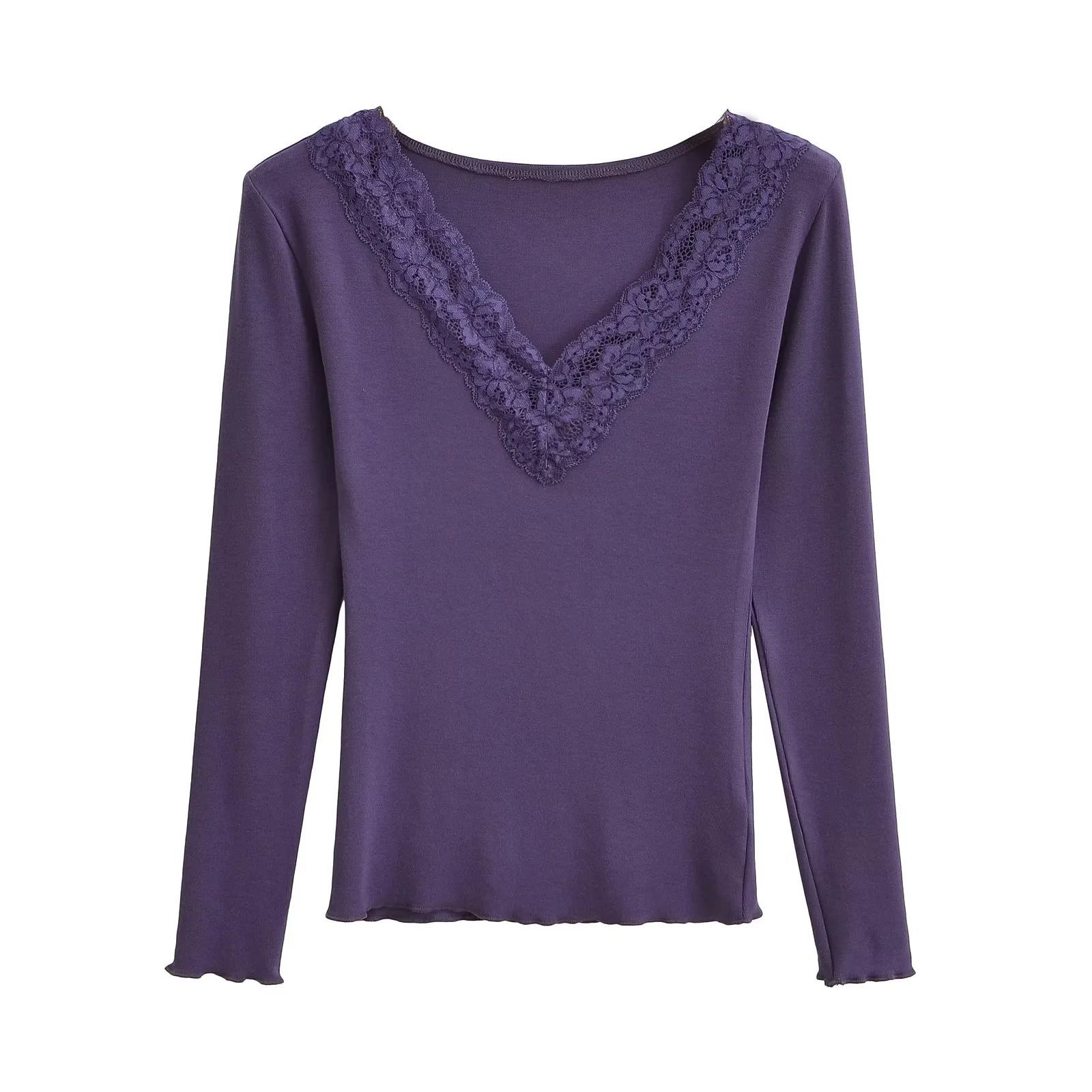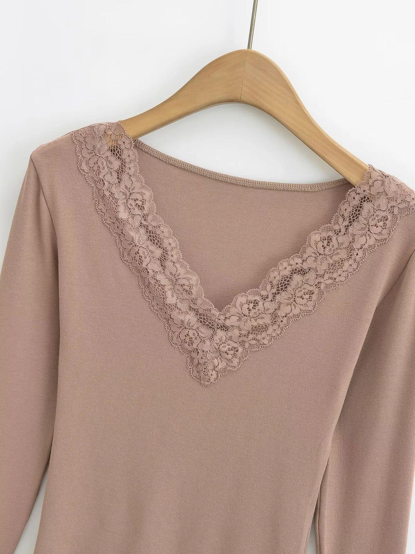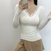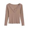 Sexy y Estilo Puro Encaje con Costuras de Cuello en V Grande Manga Larga Otoño para Mujer Nuevo 2024 Camisa Básica Corta Ajustada Adelgazante