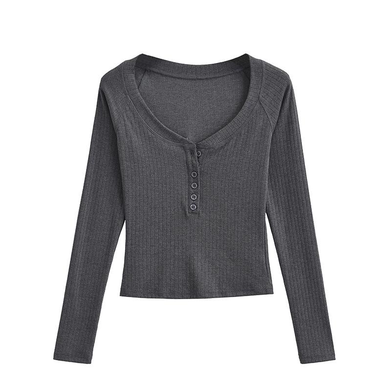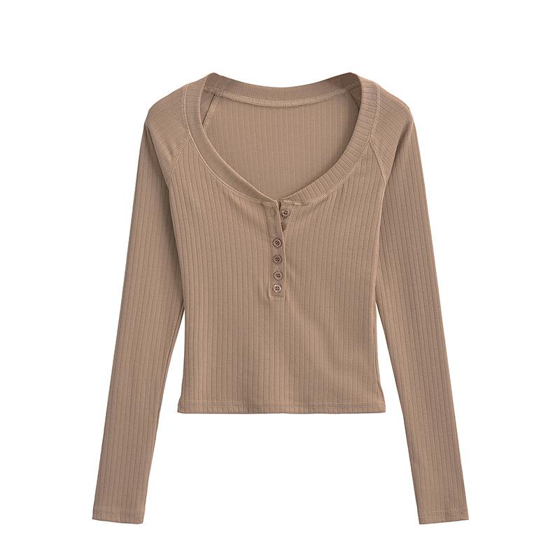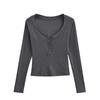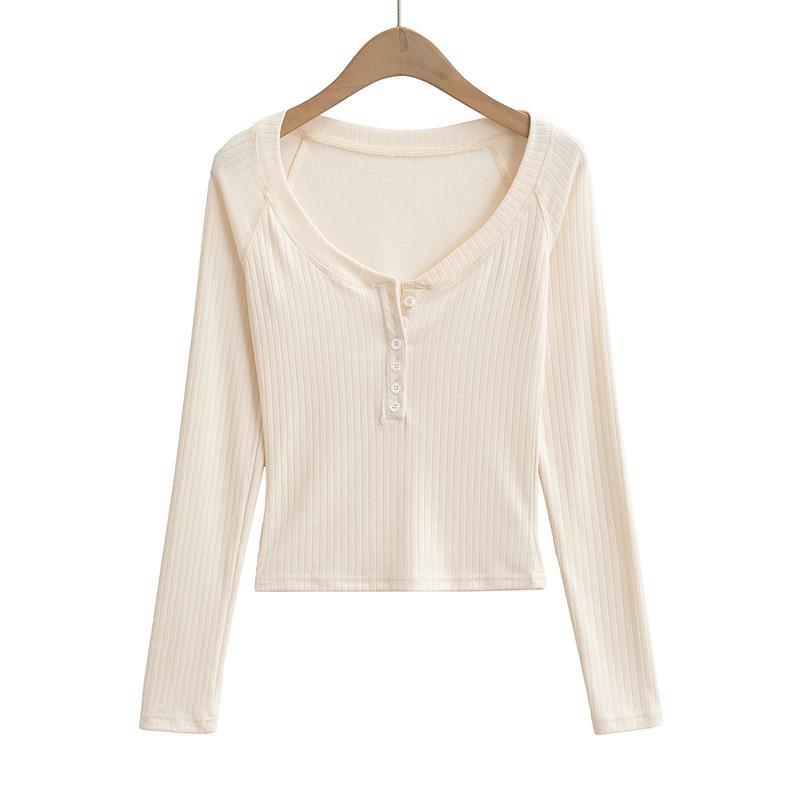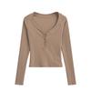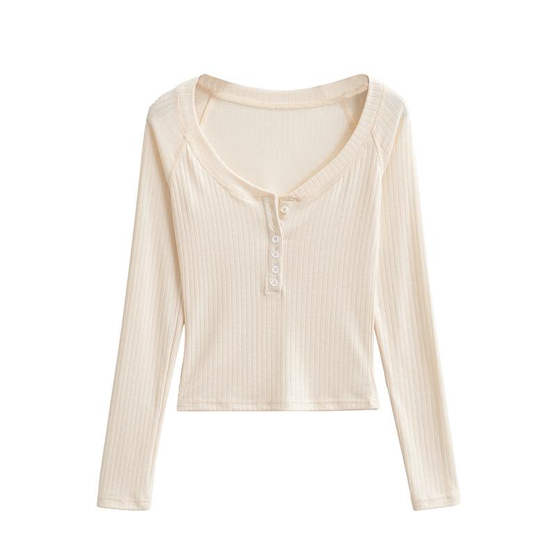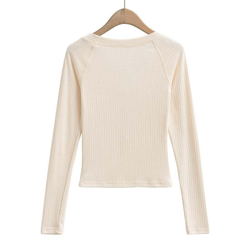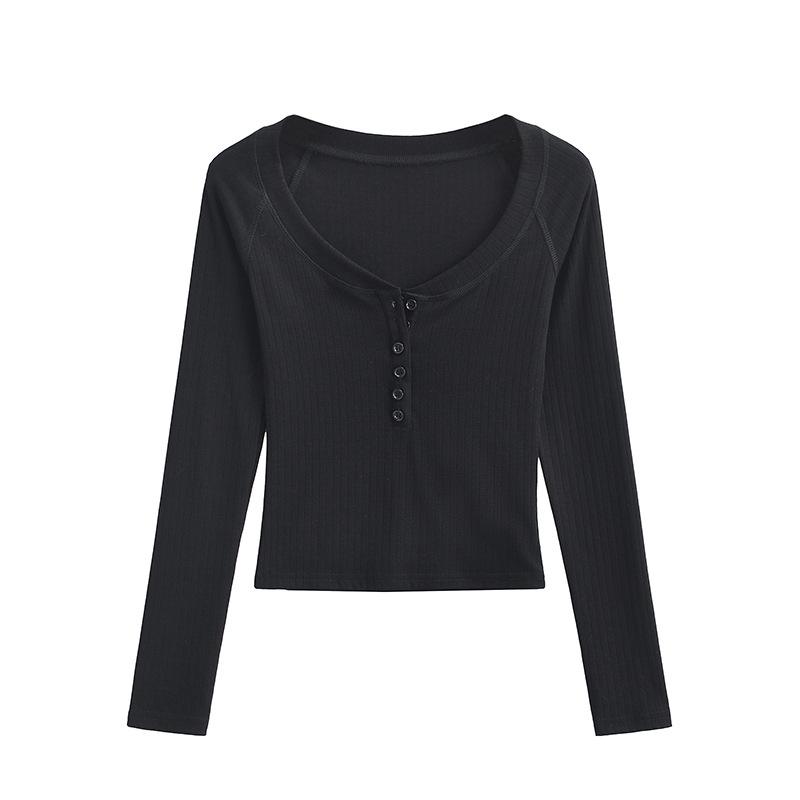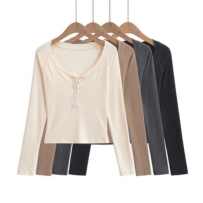 Camiseta de Manga Larga con Cuello Redondo de Estilo Ins a la Moda para Mujer 2024 Principios de Otoño Ajuste Slim Abotonada Corta Camiseta Base Top
