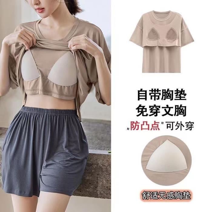 Pijama de verano para mujer, sencillo, fresco, de manga corta, holgado, con almohadillas para el pecho, ideal para comercio exterior.