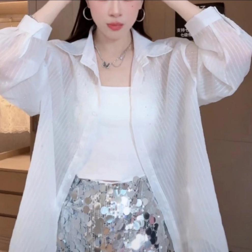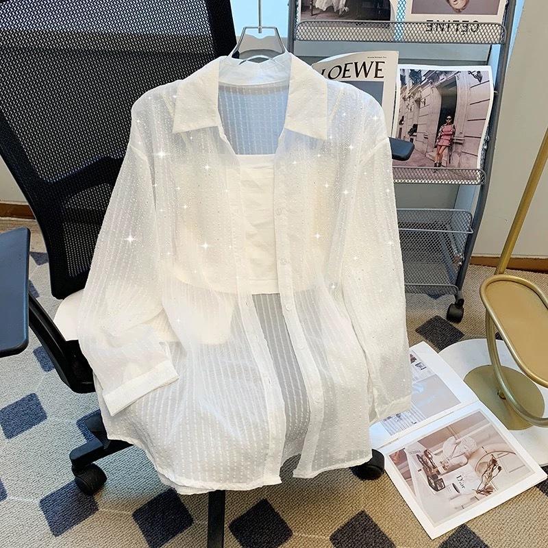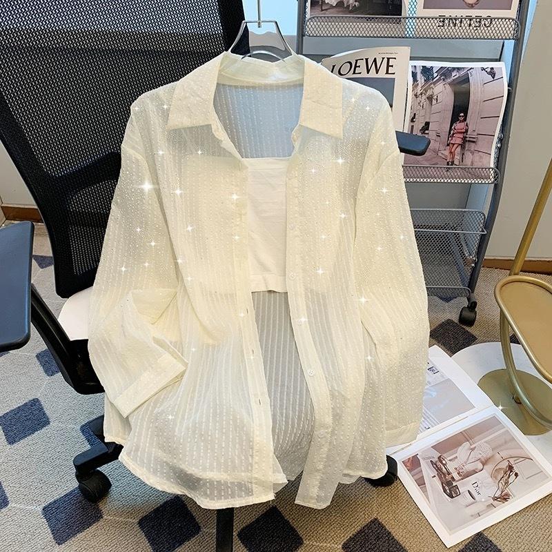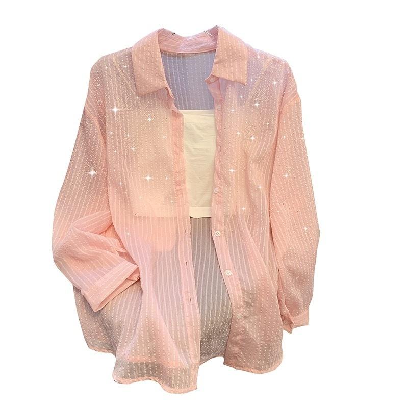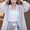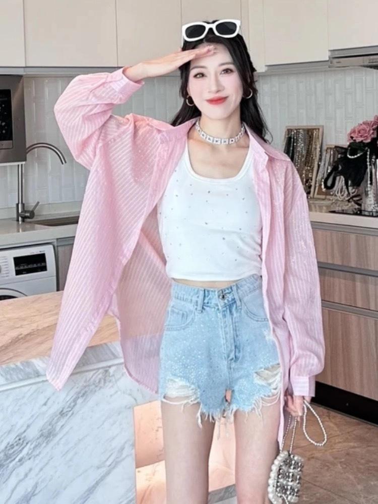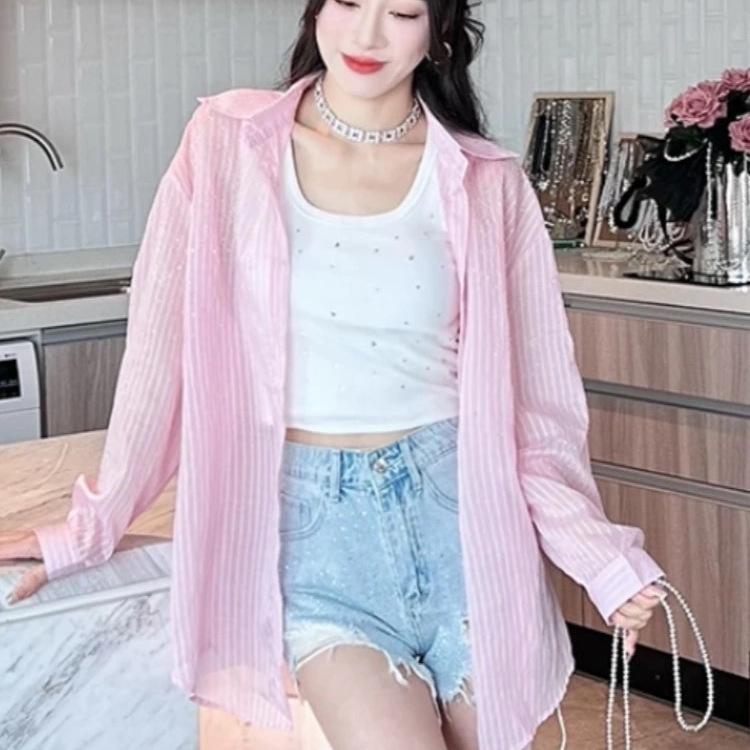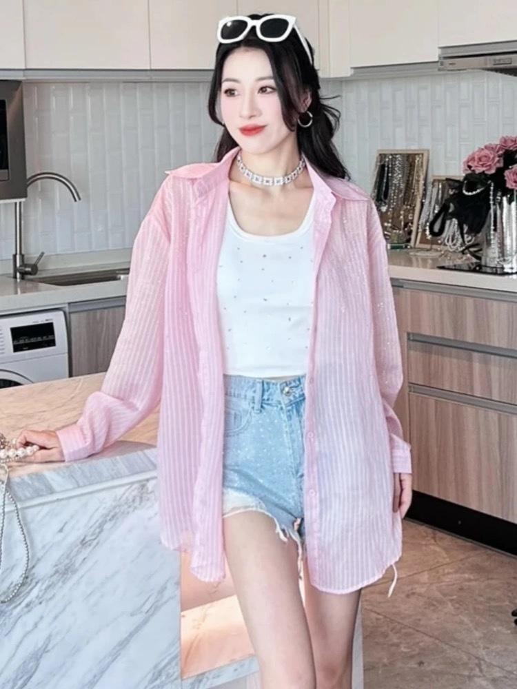 Estrella de cinco puntas Raya Diamante Caliente Ropa de Protección Solar Camisa de Seda de Hielo Ligera de Verano para Mujer para Llevar Exterior Top de Largo Medio