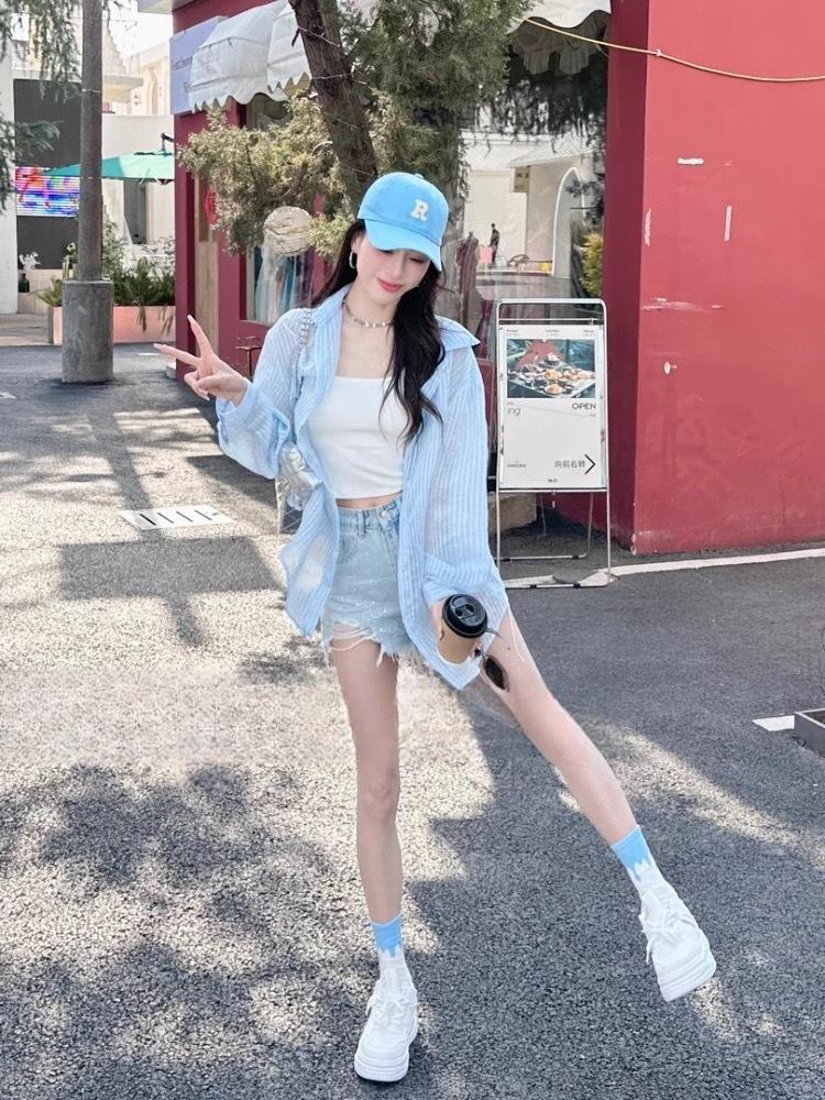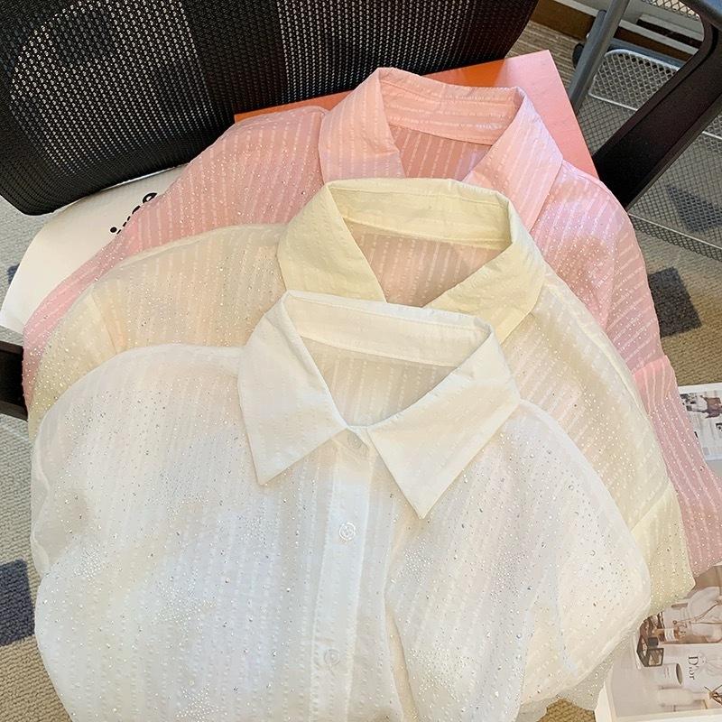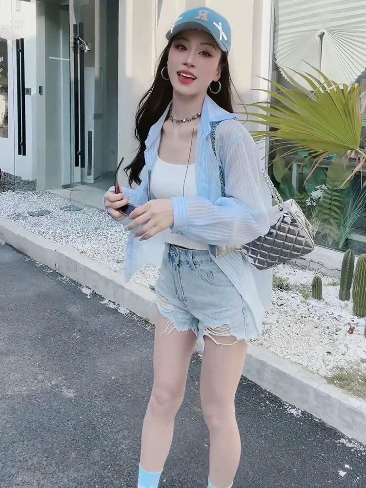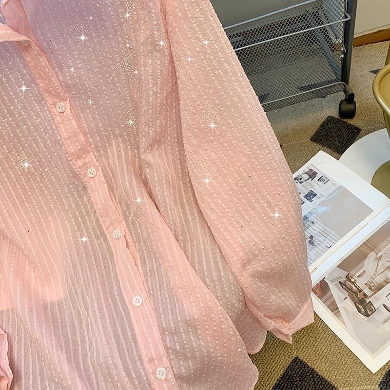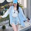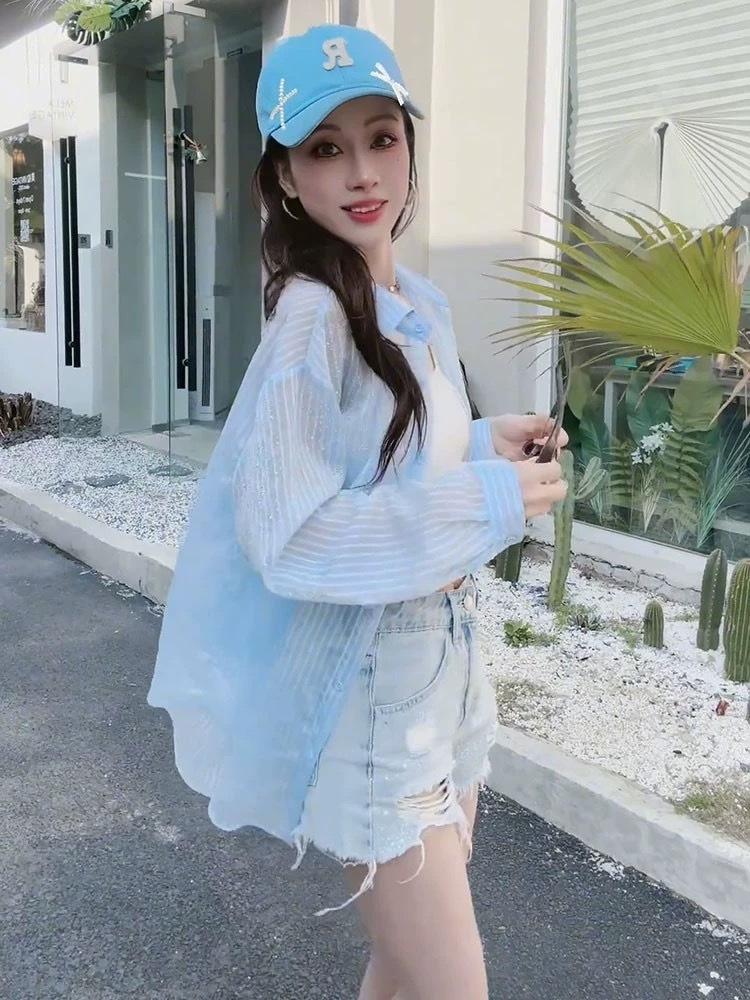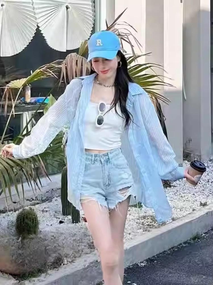 Estrella de cinco puntas Raya Diamante Caliente Ropa de Protección Solar Camisa de Seda de Hielo Ligera de Verano para Mujer para Llevar Exterior Top de Largo Medio
