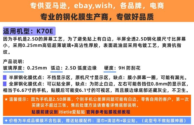 Pegatinas de amor aptas para película templada Red Rice K70e, película de teléfono móvil de vidrio transparente no poroso con cubierta de pantalla no completa