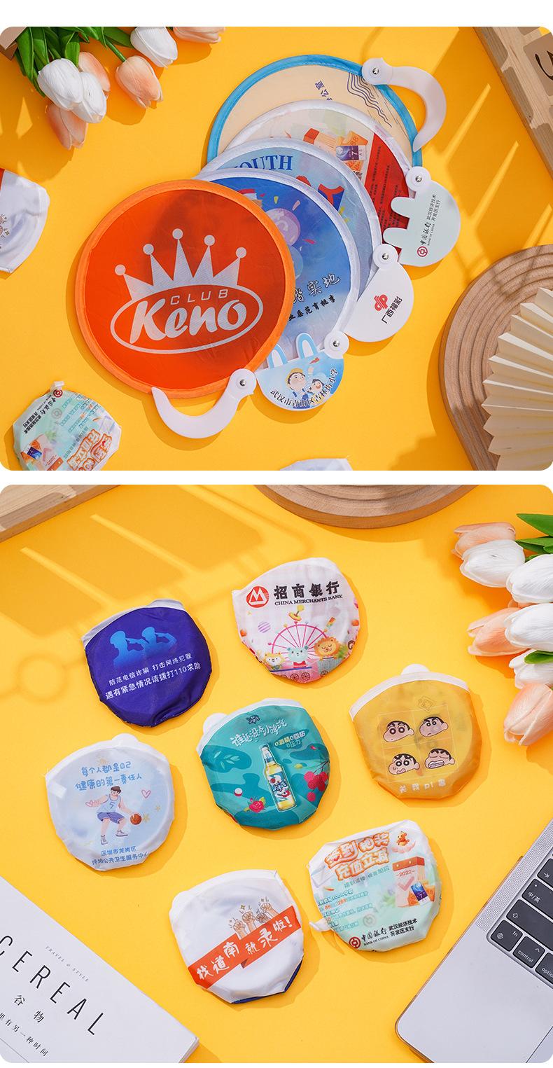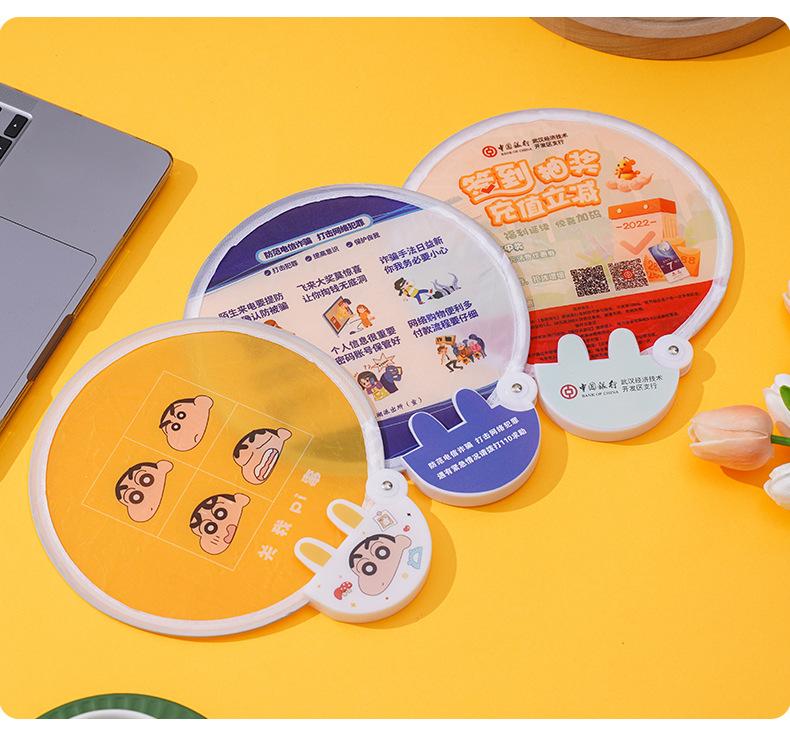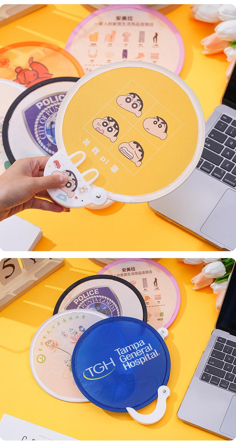Fábrica al por mayor de verano creativo lindo dibujo animado frisbee abanico publicitario redondo pequeño grupo abanico plegable abanico impresión de logotipo