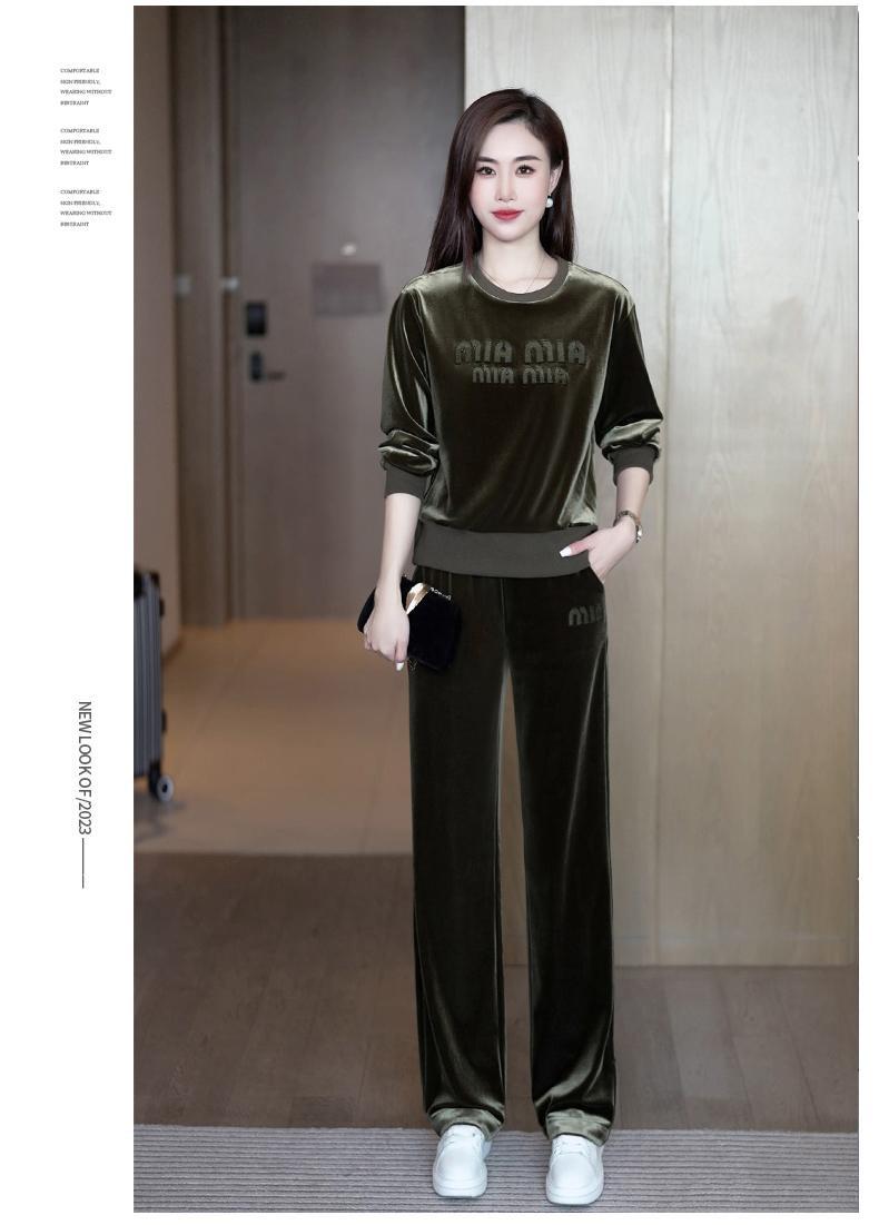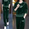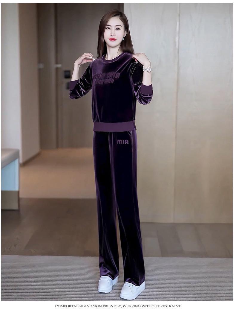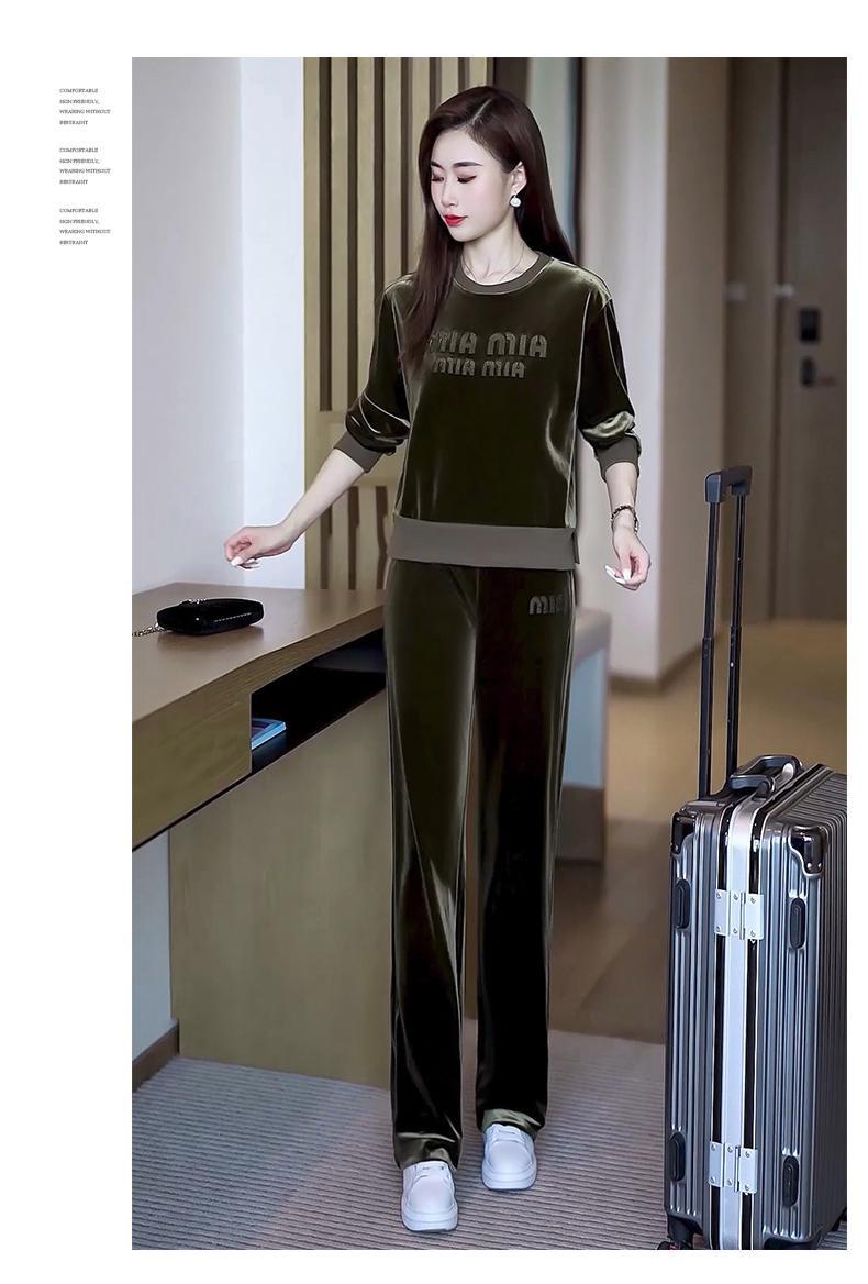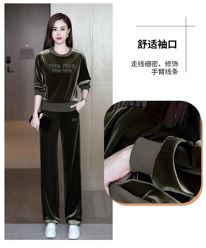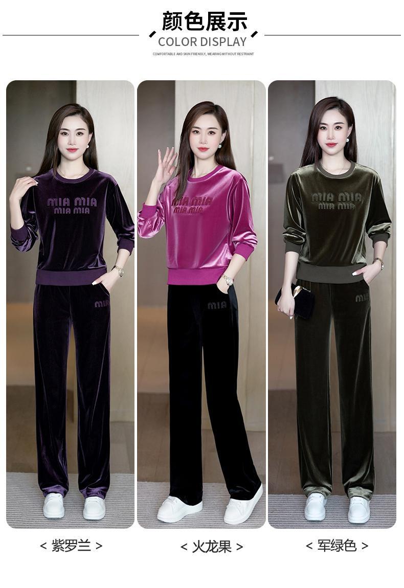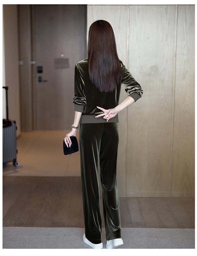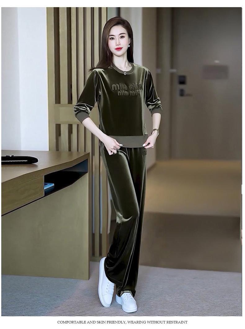 Conjunto deportivo informal de terciopelo dorado para mujer, jersey de cuello redondo, holgado y a la moda de otoño, de dos piezas, para adelgazar