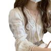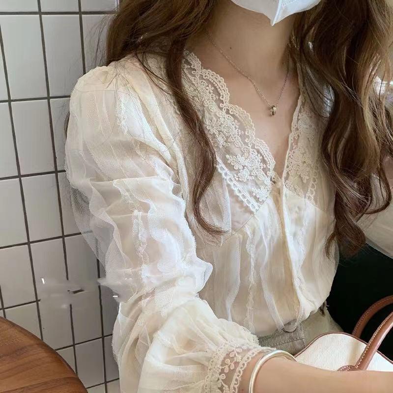 Camisa elegante de encaje con escote en V para mujer, camisa de gasa suave y combinable, otoño 2022, nuevo diseño elegante y dulce, camisa pequeña con sentido del estilo