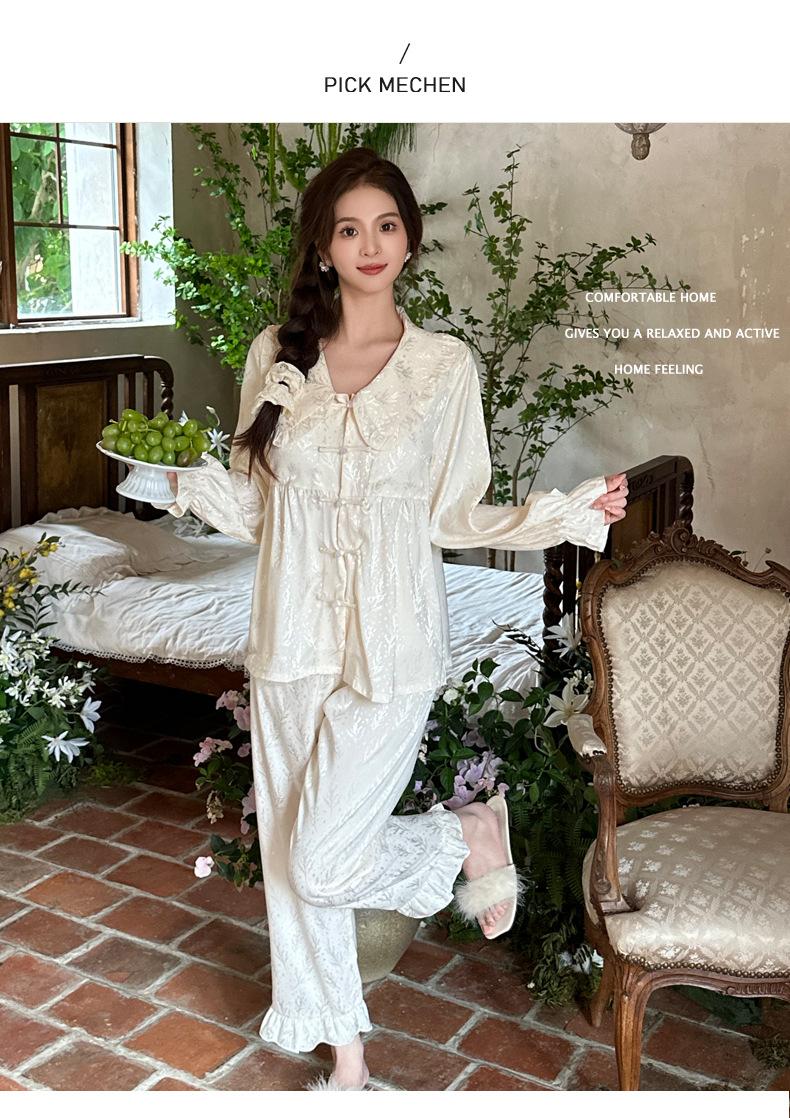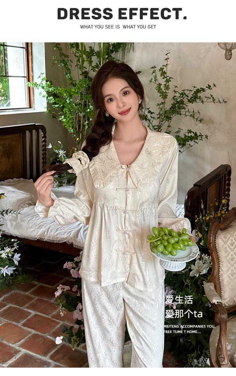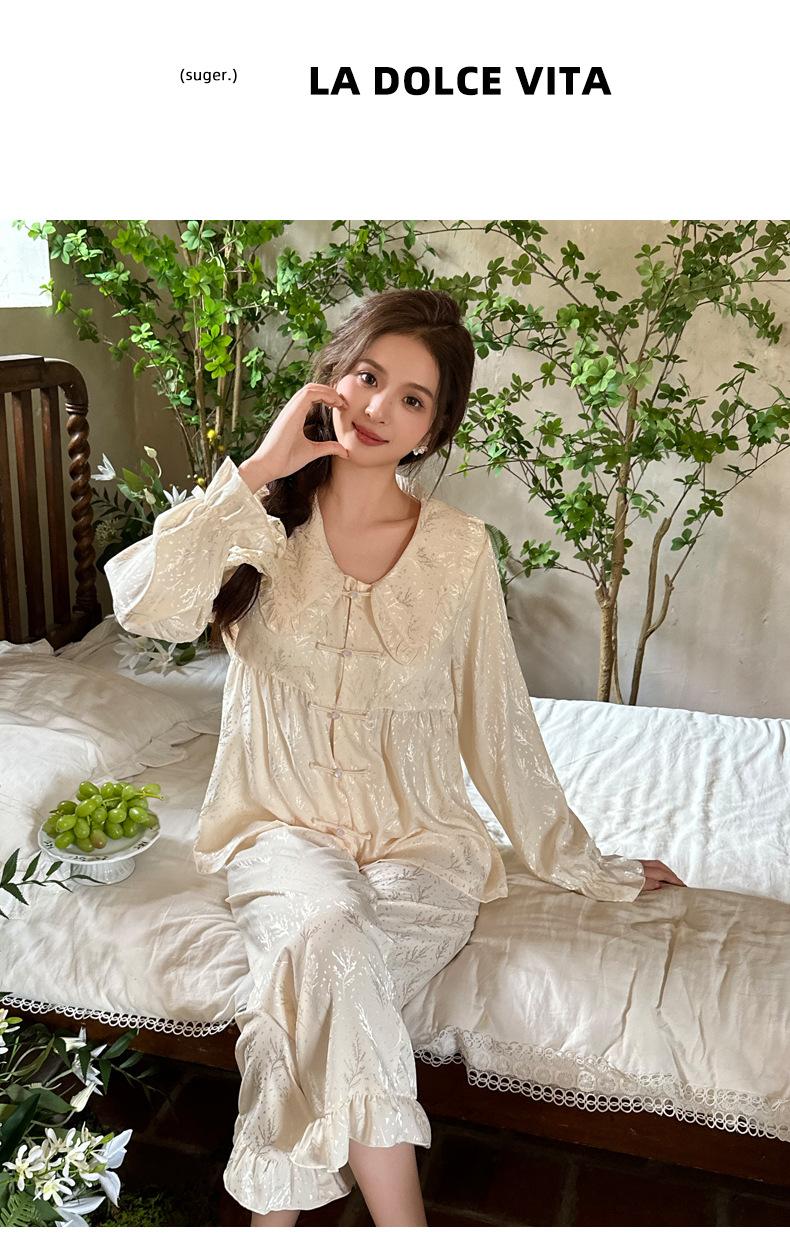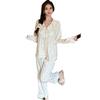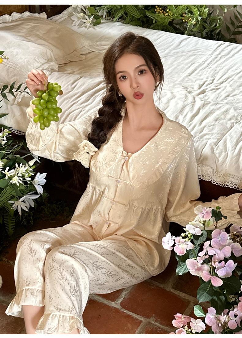 Pijama para Mujer Primavera y Otoño Simple Lindo Seda de Hielo Suelto Cuello de Muñeca Francesa Manga Larga Set de Pantalones Ropa de Casa Antigua